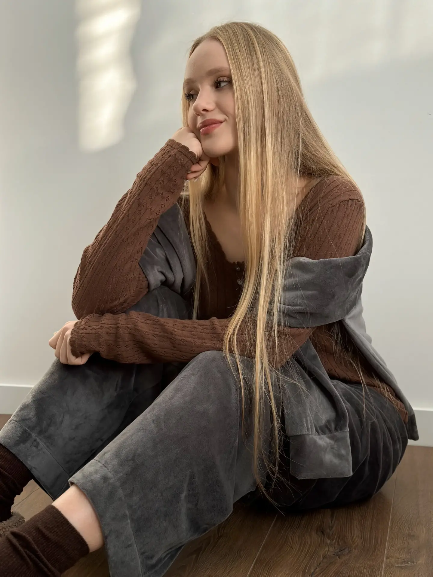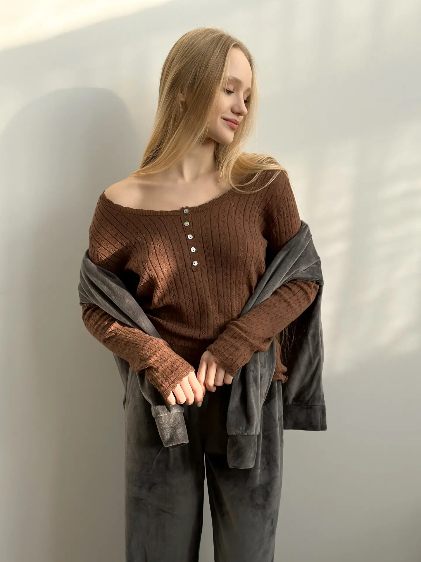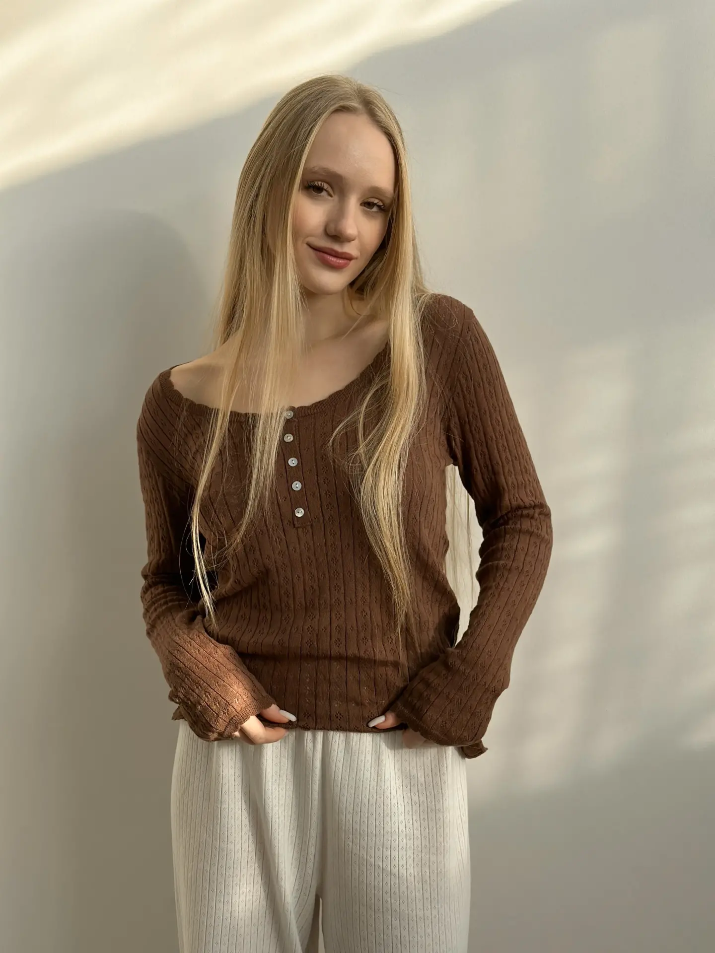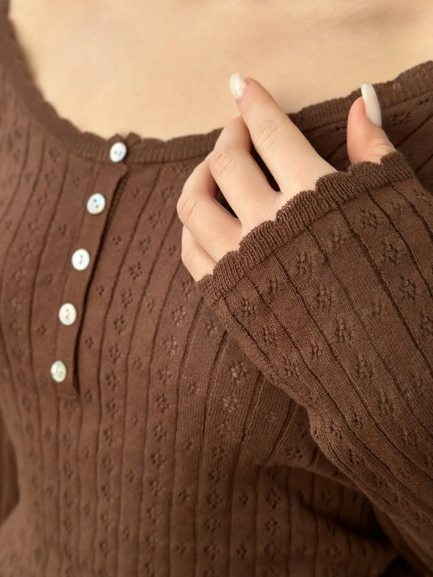 Koszulka dziana z długim rękawem, z bawełny, brązowa