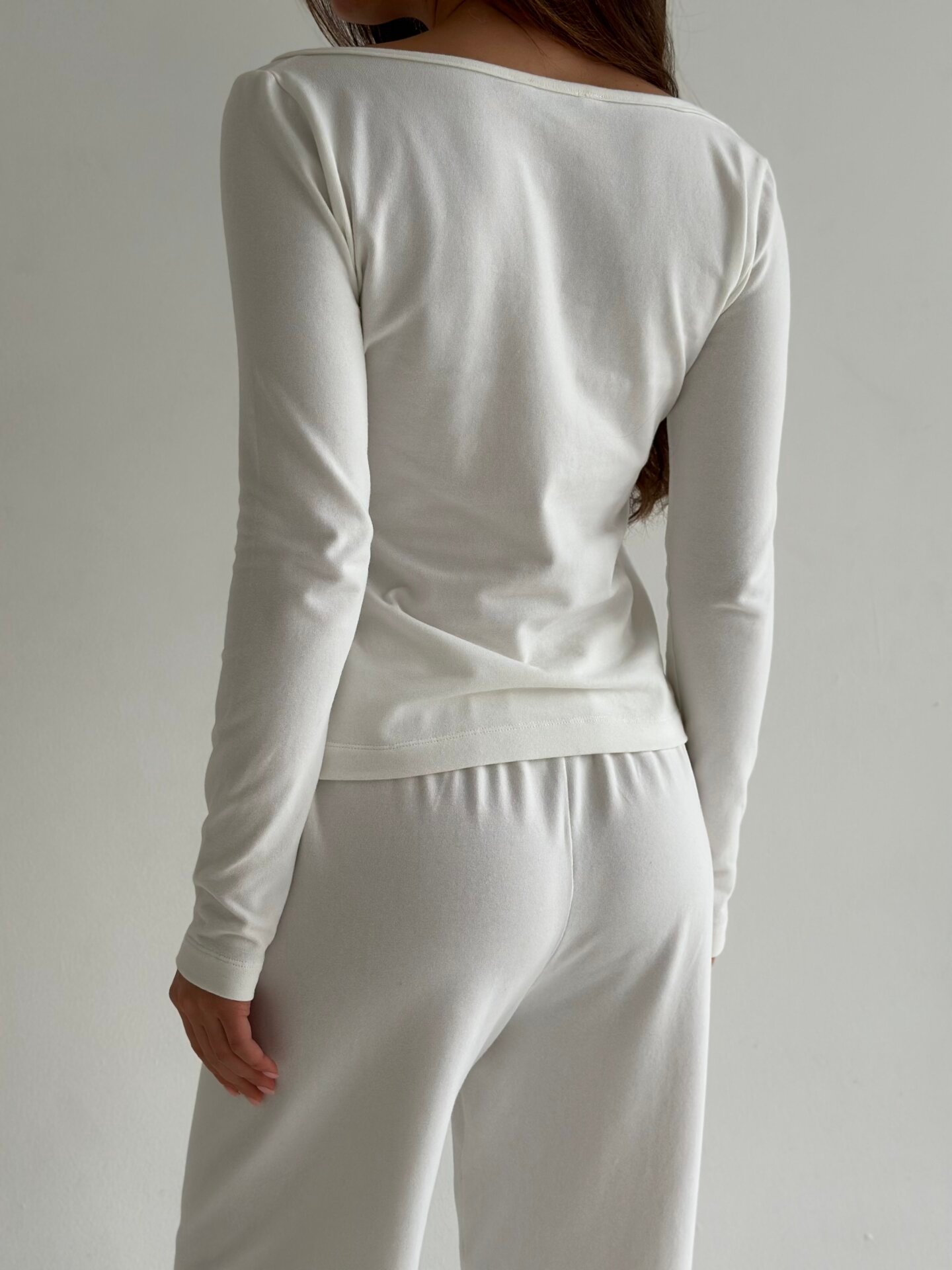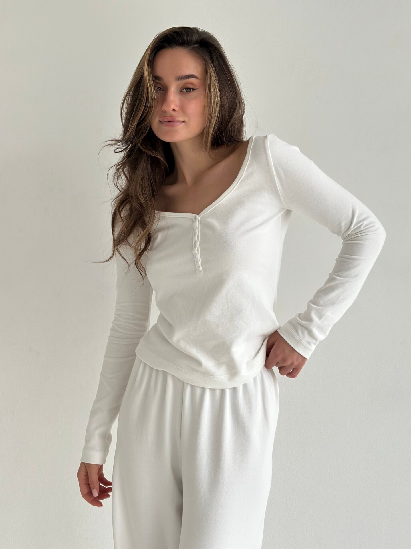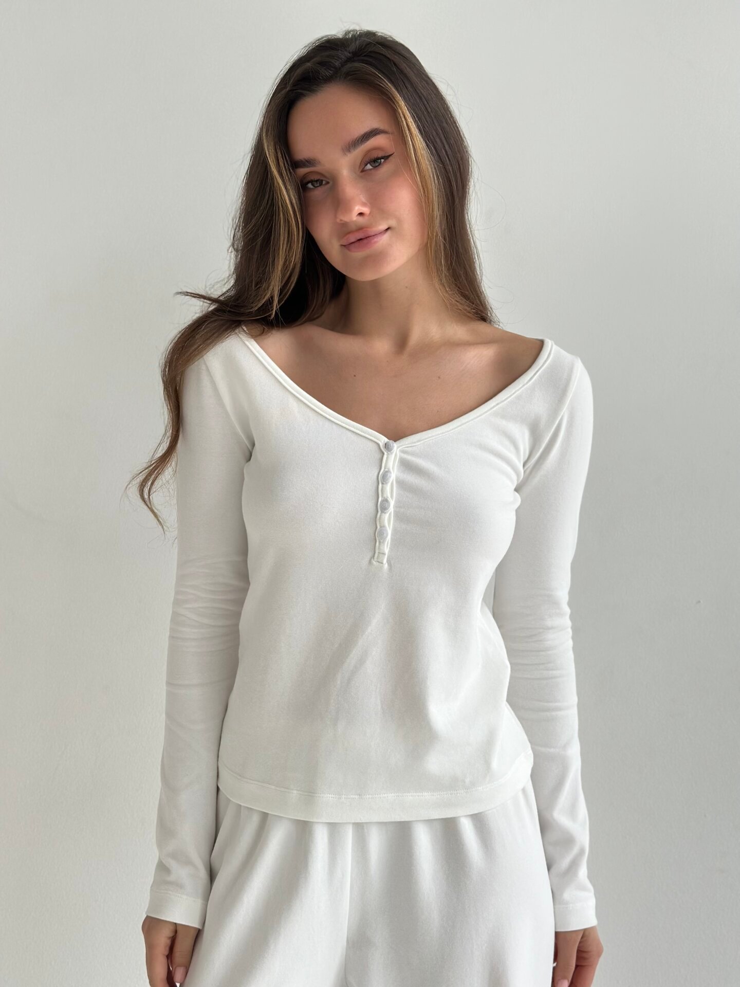 Koszulka longsleeve z dekoltem w serek „Delicacy”, z dzianiny, biała
