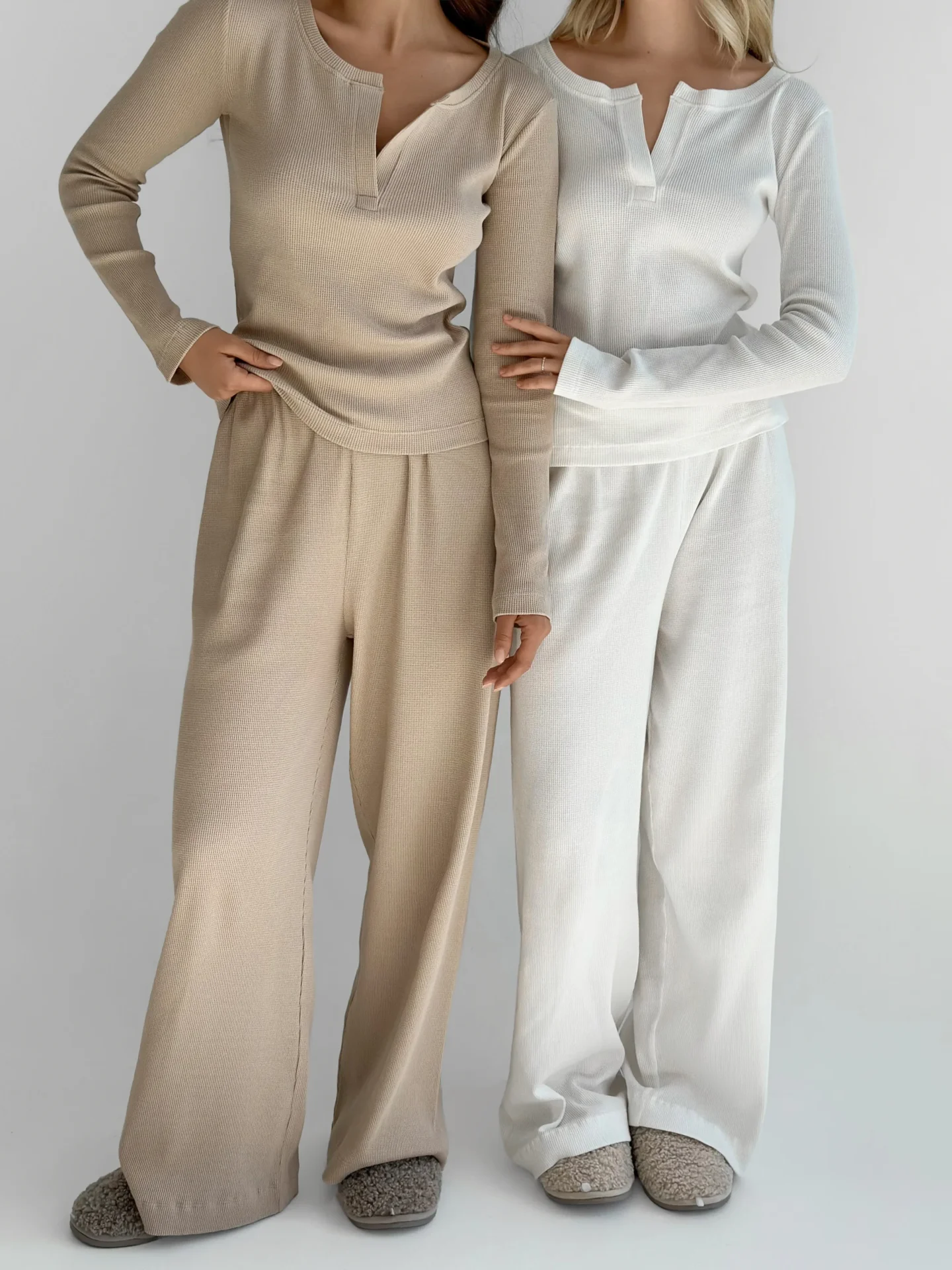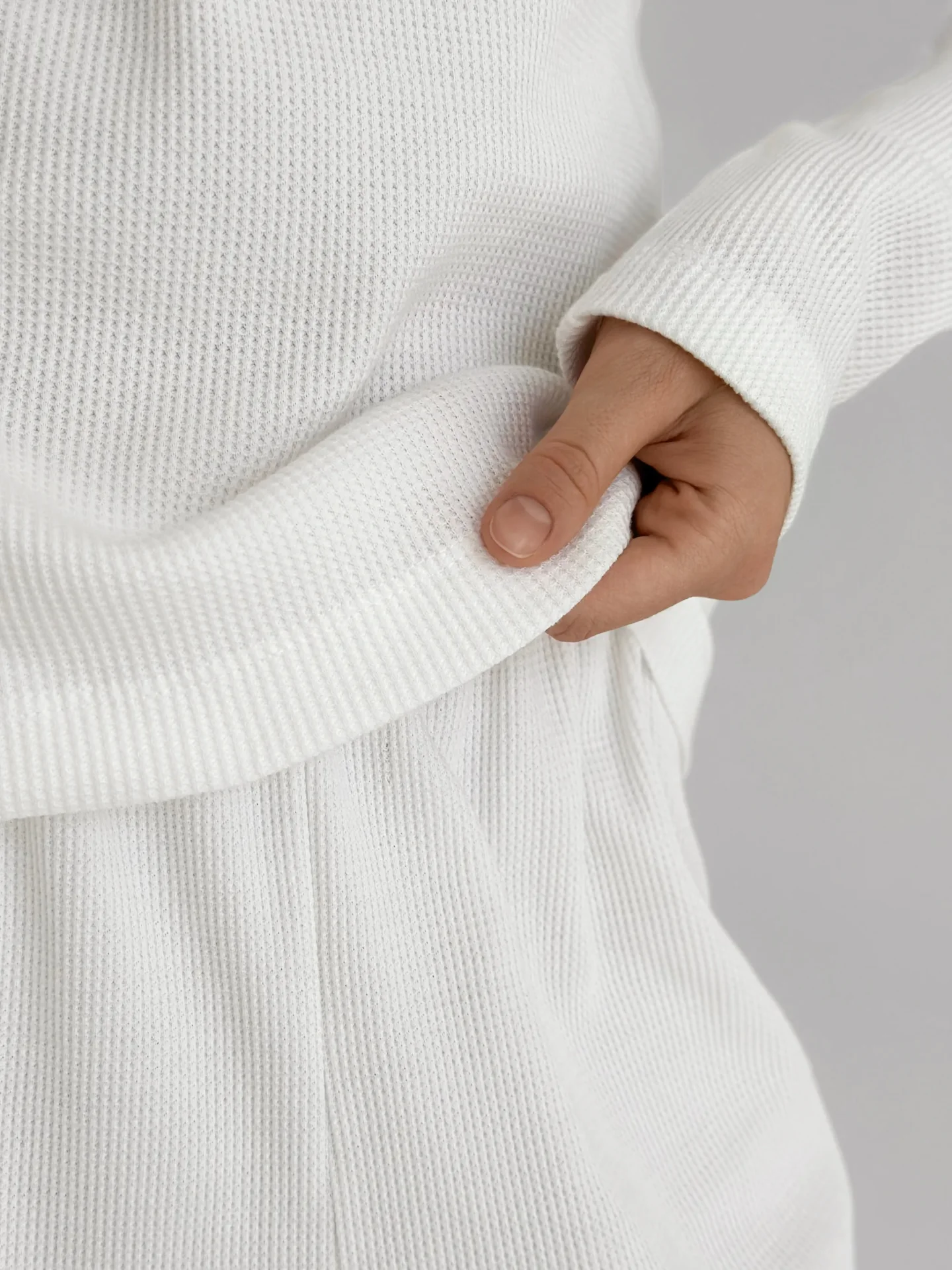 Longsleeve ze stójką z waflowej dzianiny łączy przytulność i styl. Miękki, fakturowany materiał jest przyjemny w dotyku i zapewnia komfort w chłodniejsze dni. Idealny wybór do domowego wypoczynku lub codziennych stylizacji.