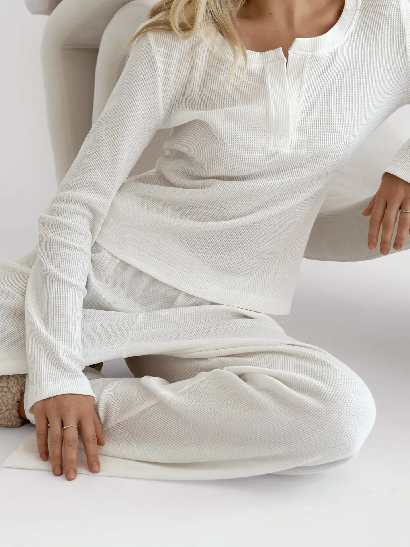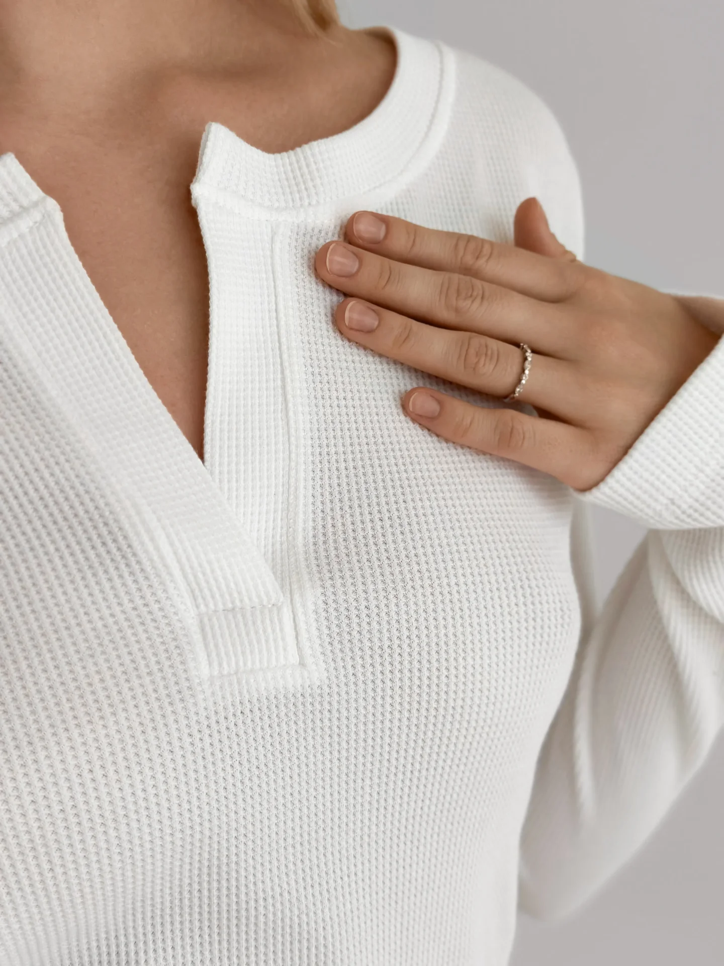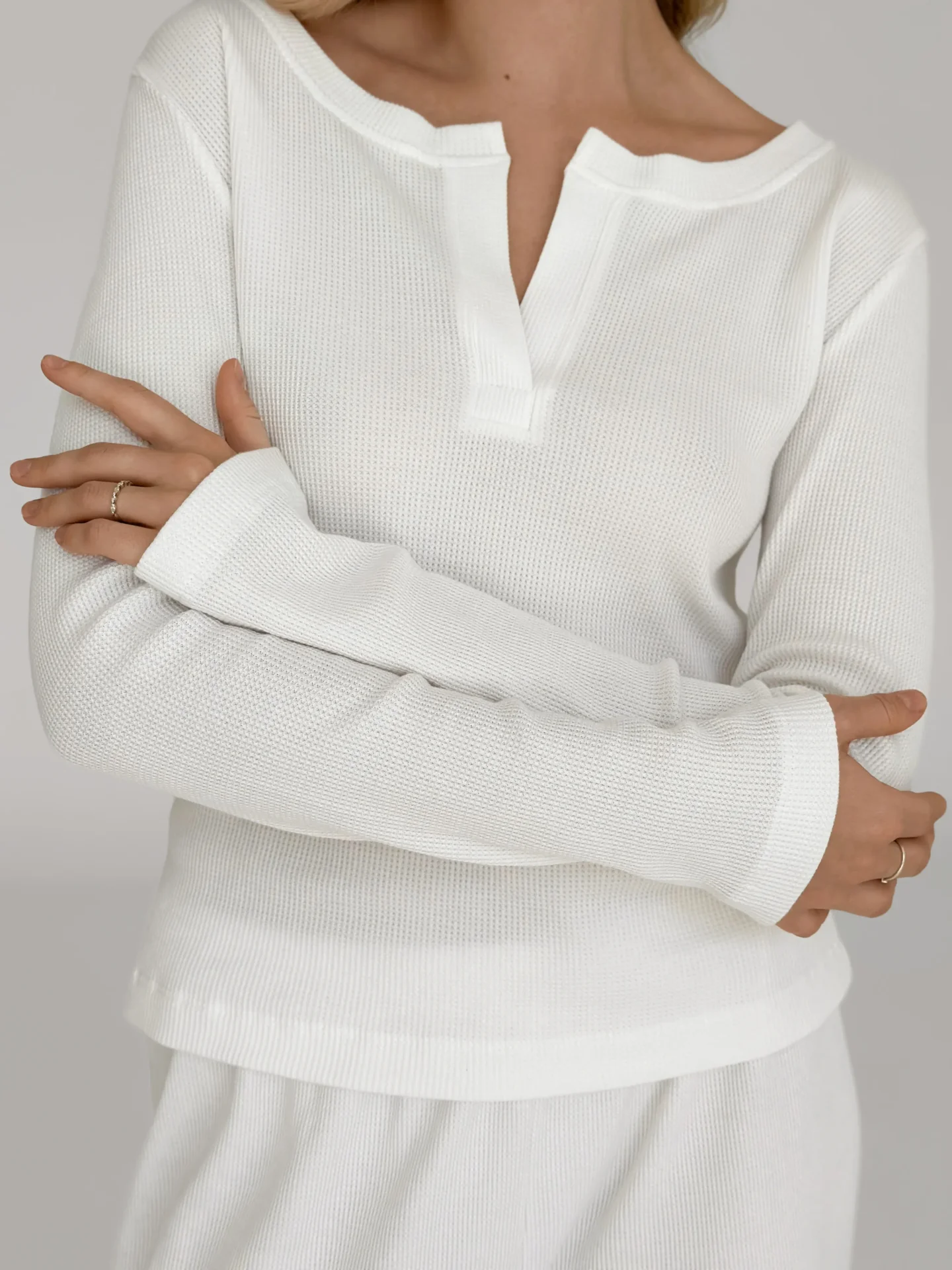 Koszulka longsleeve z dzianiny waflowej, z listwą polo, mleczna