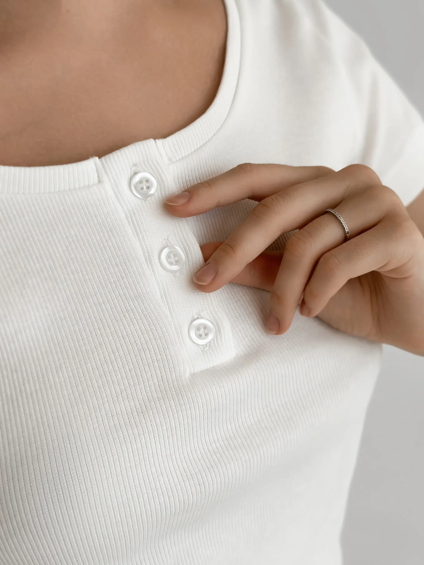 Koszulka z prążkowanej dzianiny w kolorze ecru łączy wygodę z prostym, clean designem. Miękki, elastyczny materiał fajnie dopasowuje się do sylwetki, a małe guziczki dodają delikatnego, modowego akcentu. Uniwersalna baza na co dzień, pasująca do każdej stylówki.