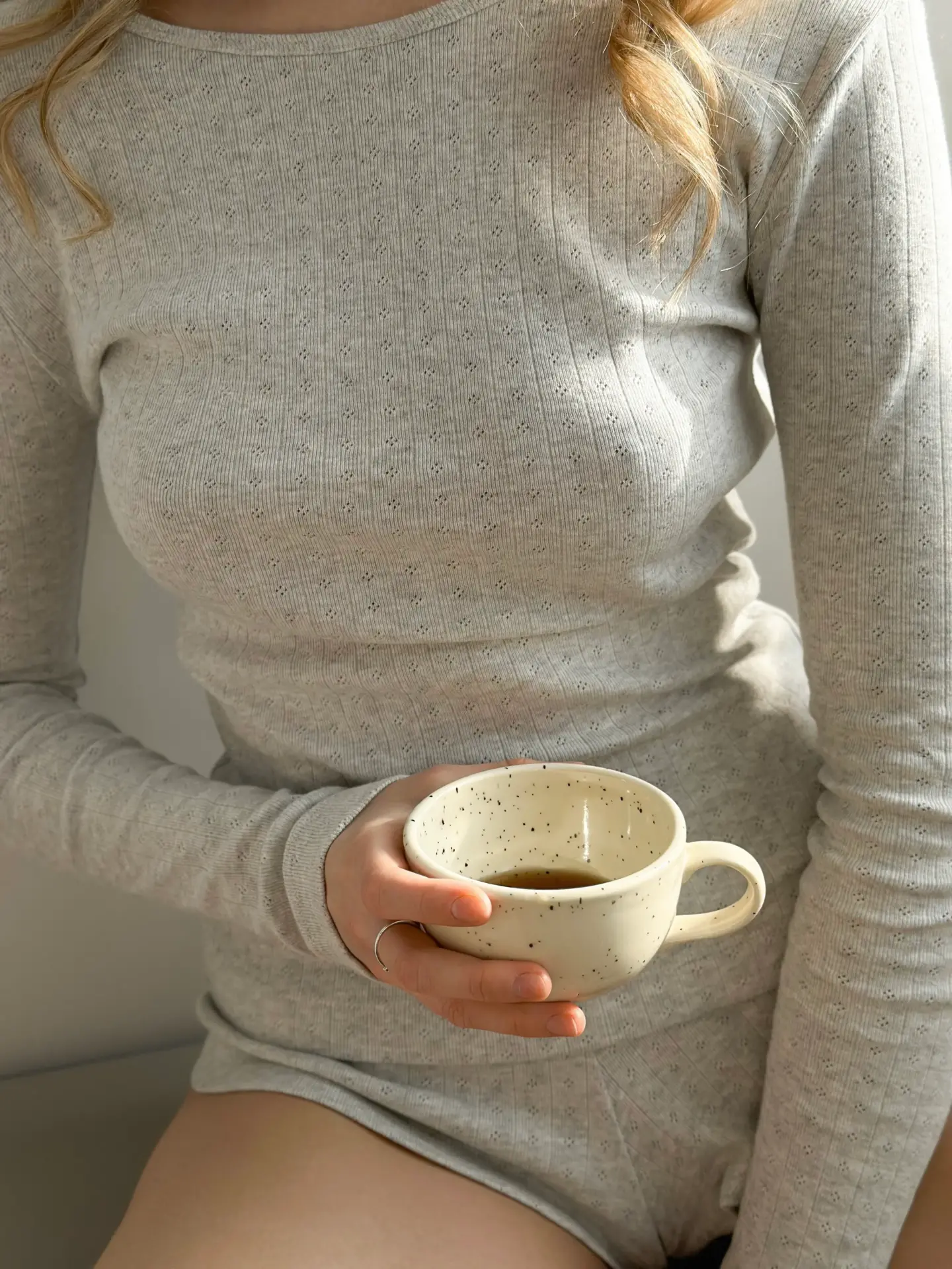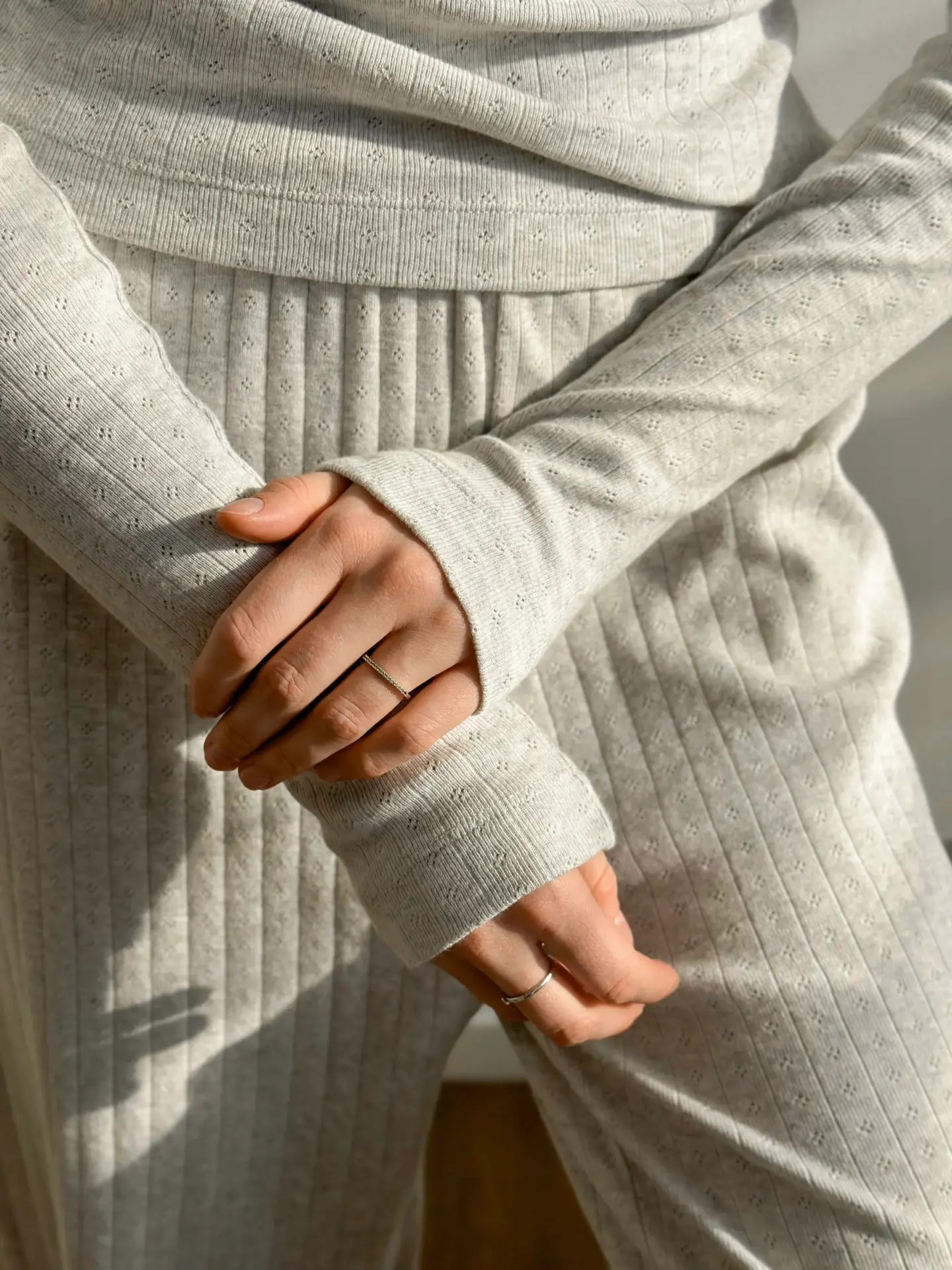 Ażurowy dzianinowy longsleeve tworzy delikatny i romantyczny wygląd, podkreślając kobiecość i lekkość stylu. Dzięki miękkiej fakturze i lekkiemu dopasowaniu do ciała zapewnia komfort i idealnie nadaje się do noszenia w domu lub jako stylowy element codziennej stylizacji.