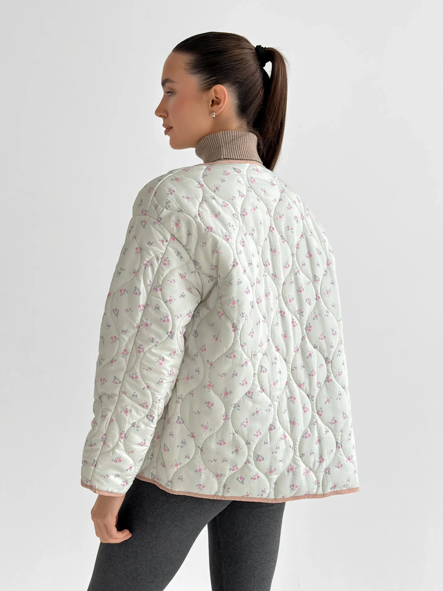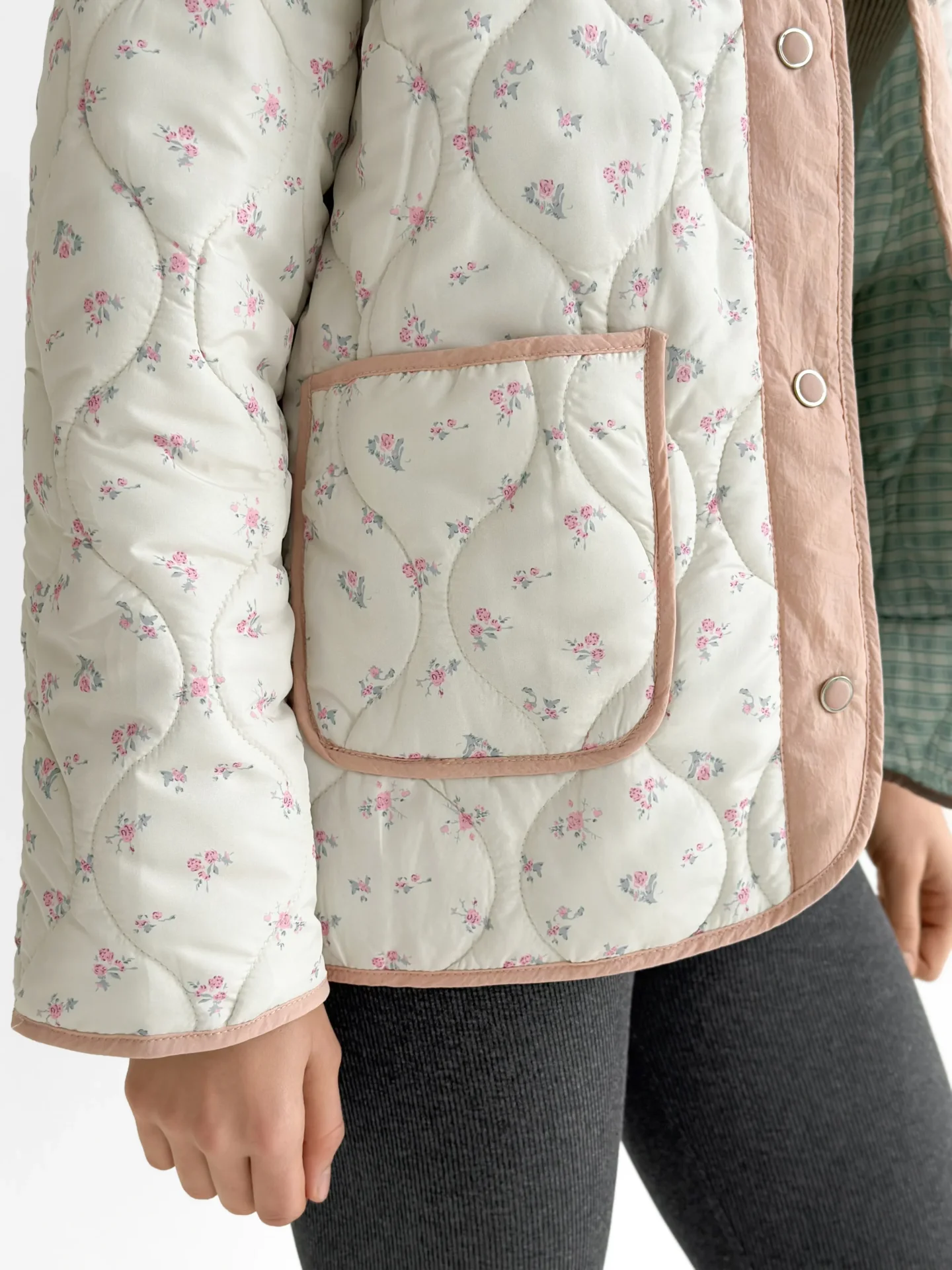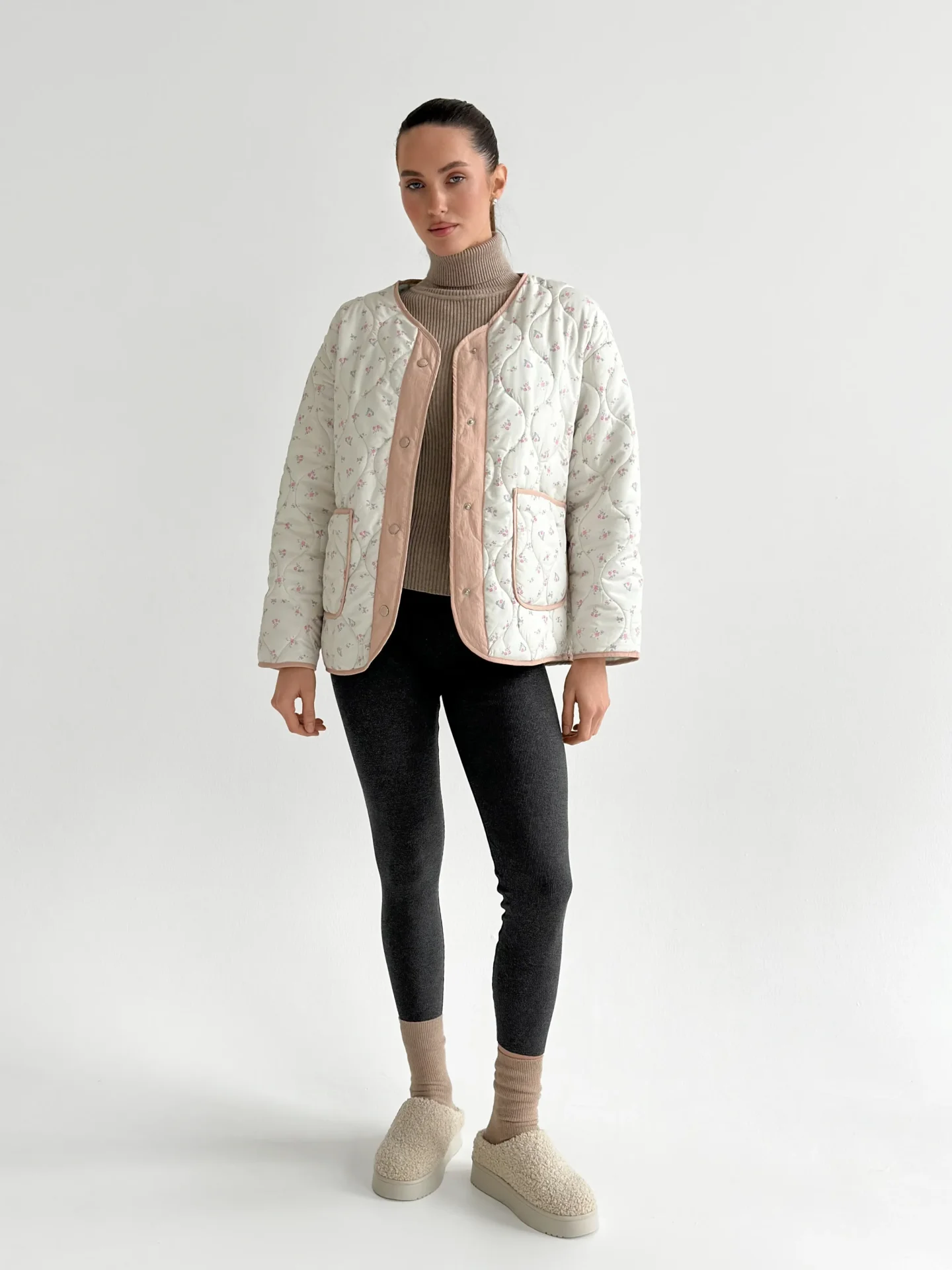 Kurtka pikowana, biało-pudrowa w różowe kwiaty - Miso