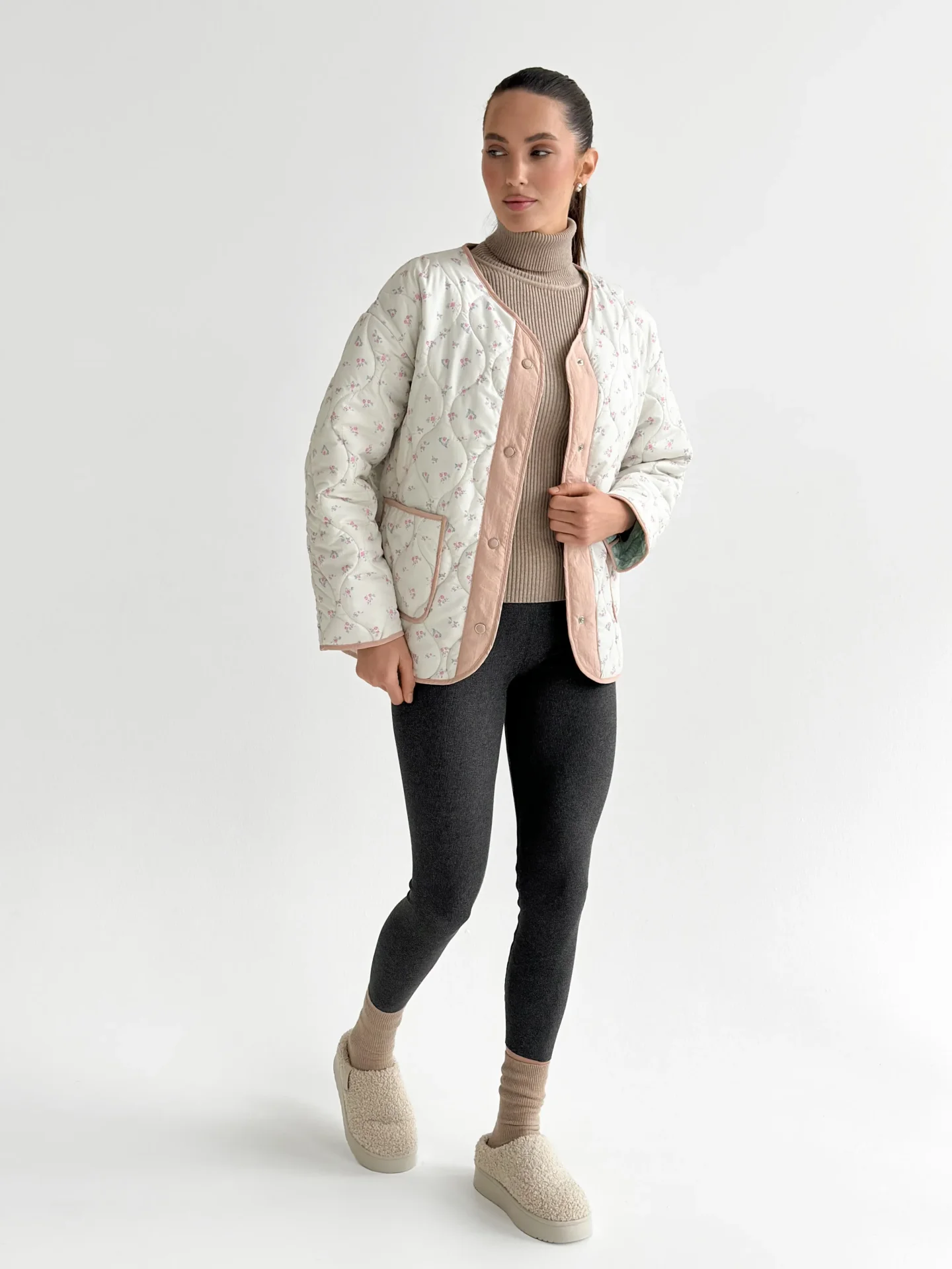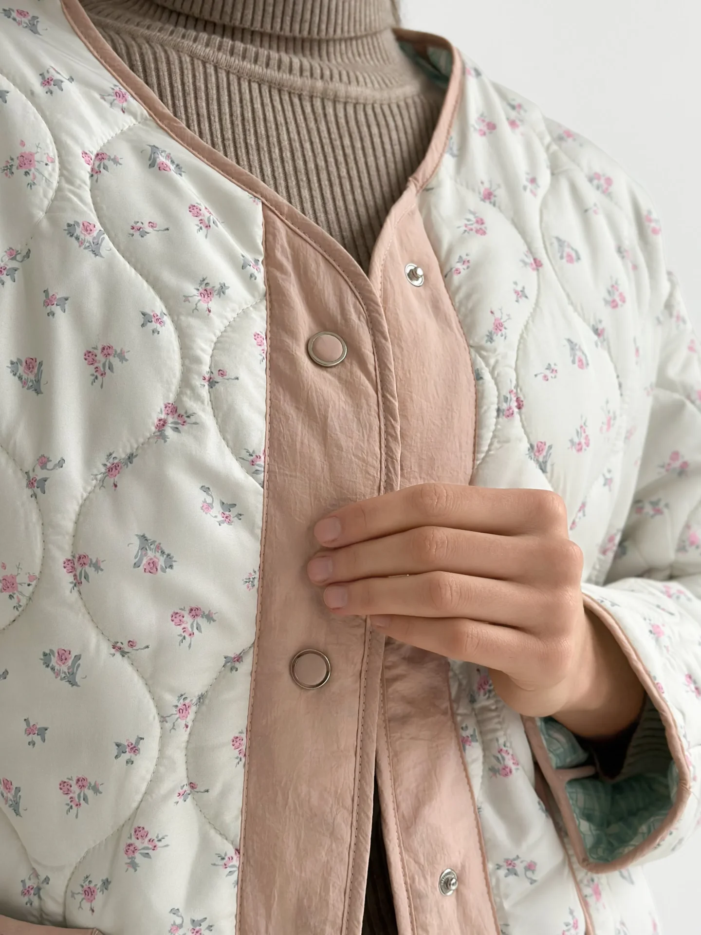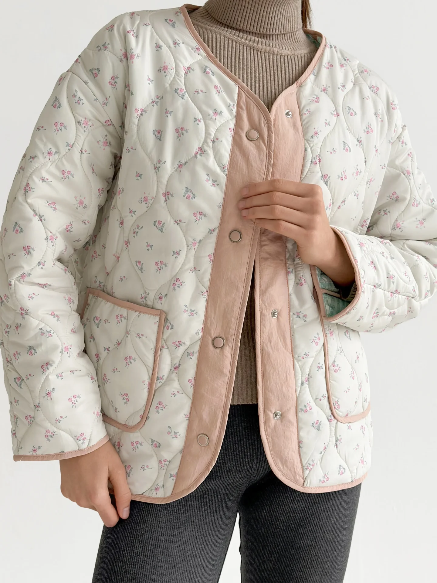 Kurtka pikowana, biało‑pudrowa w różowe kwiaty