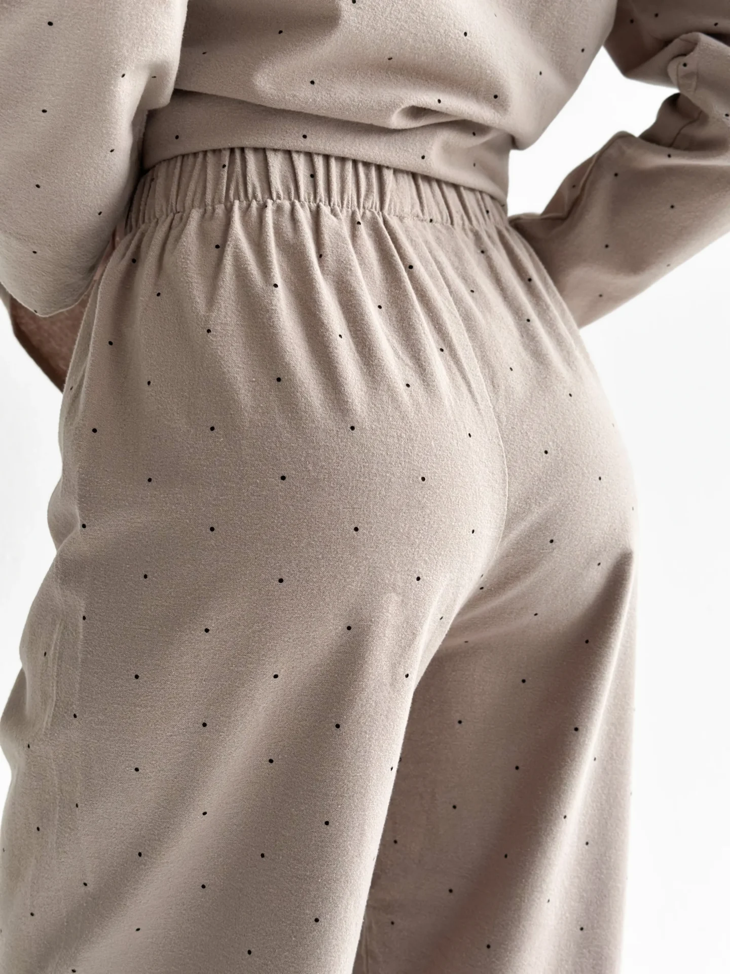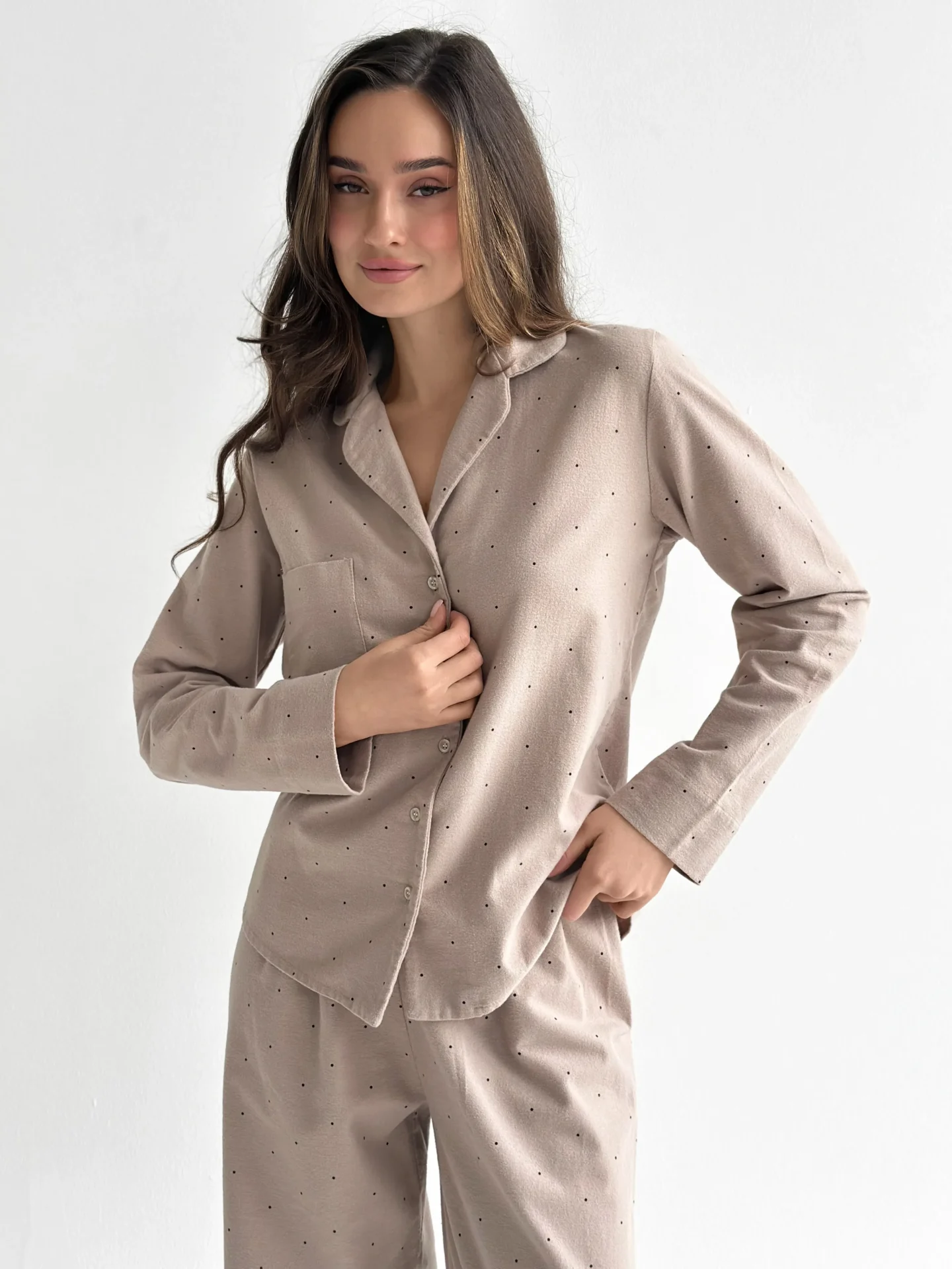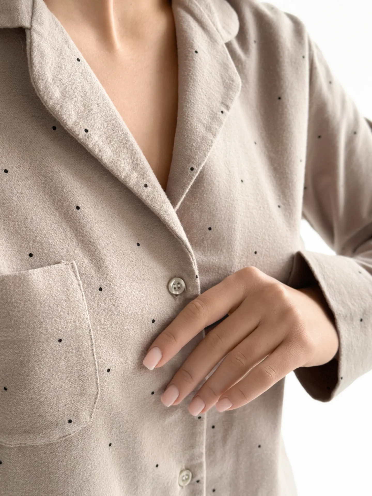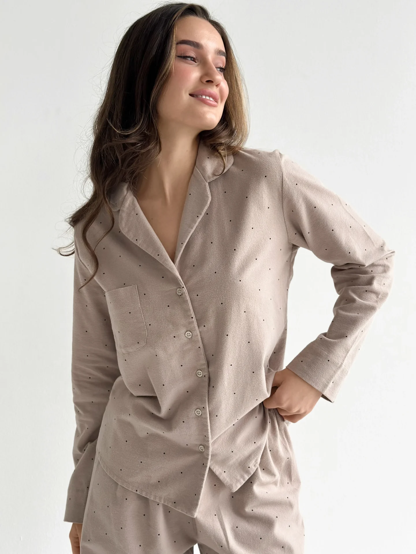 Komplet piżamowy koszula i spodnie, z flaneli, beżowy w drobne groszki