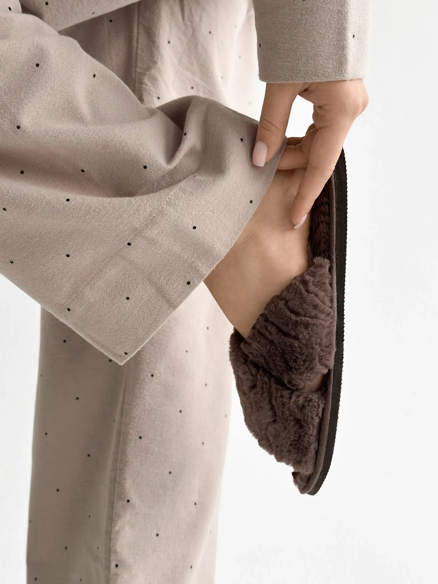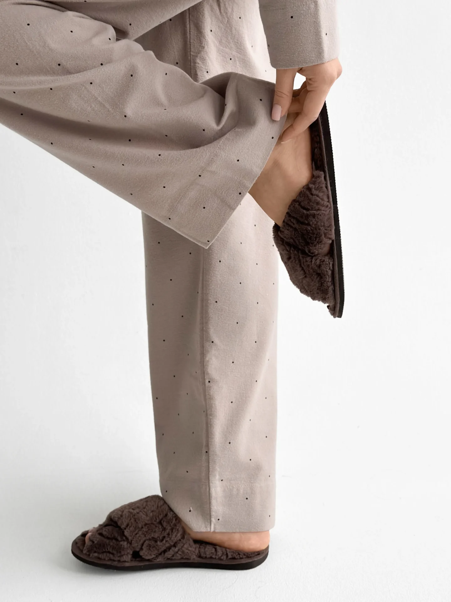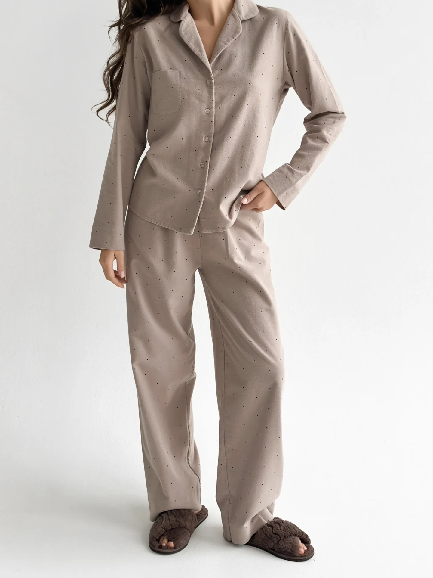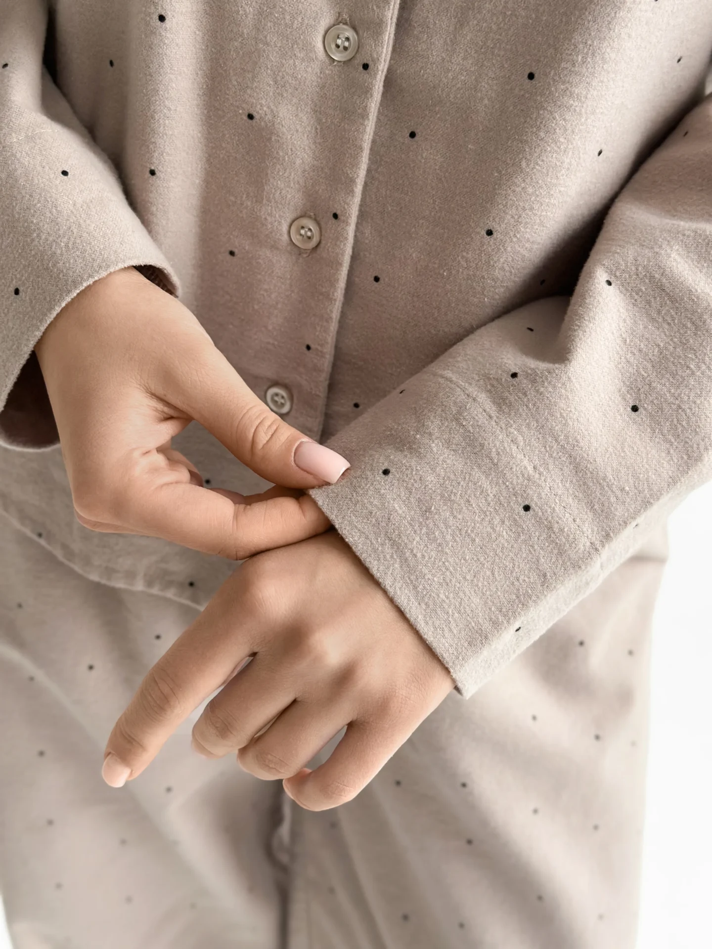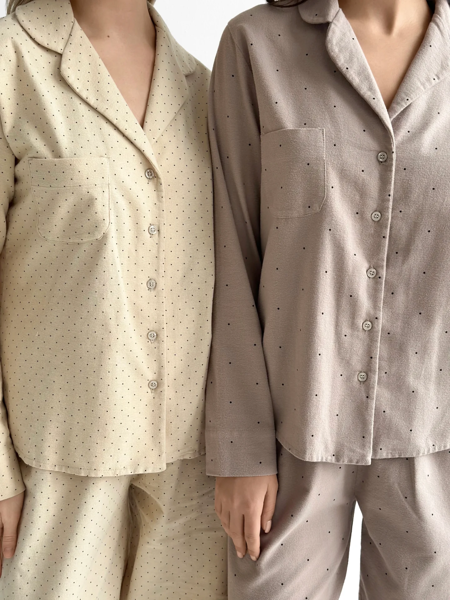 Komplet piżamowy koszula i spodnie, z flaneli, beżowy w drobne groszki