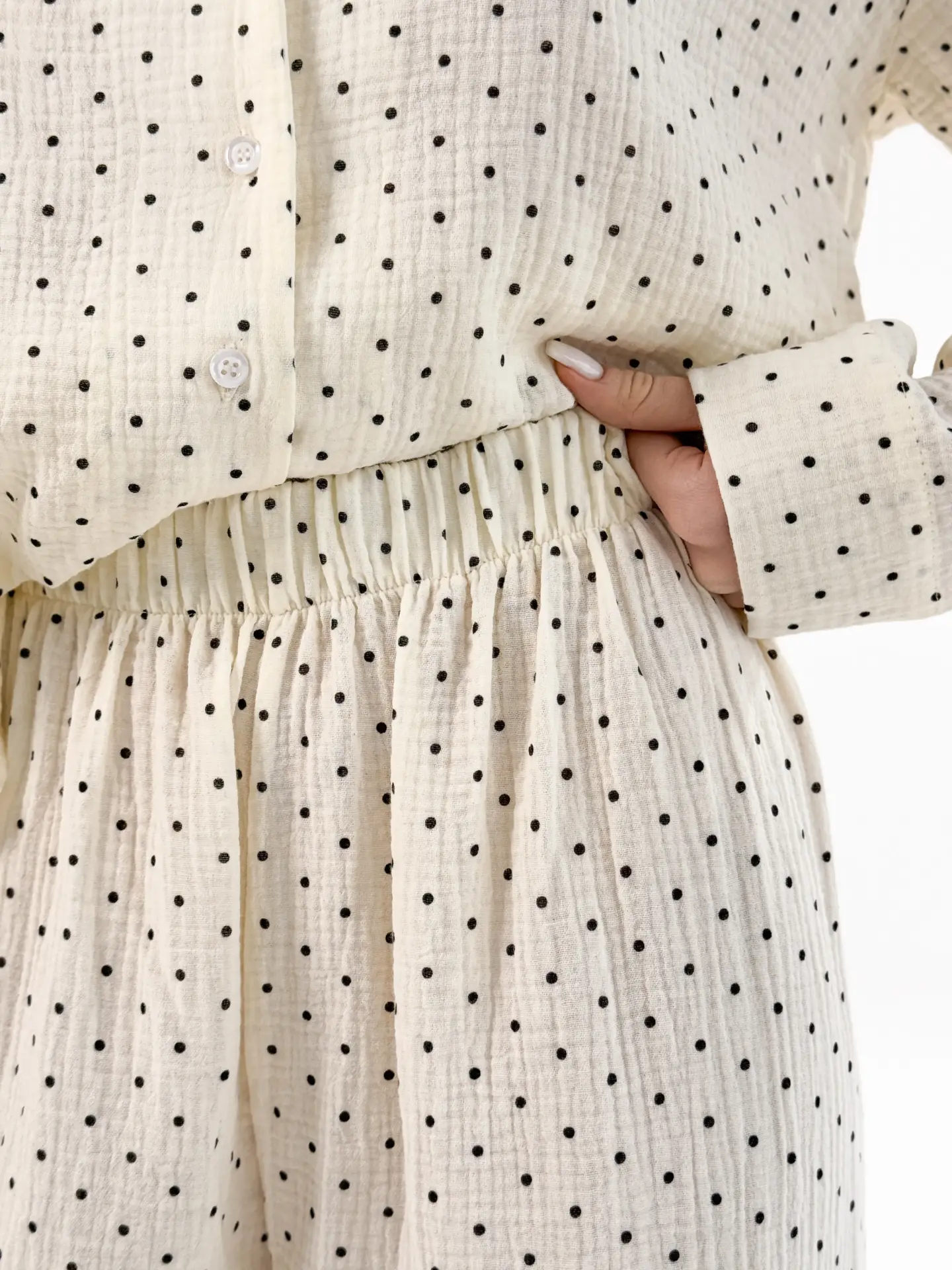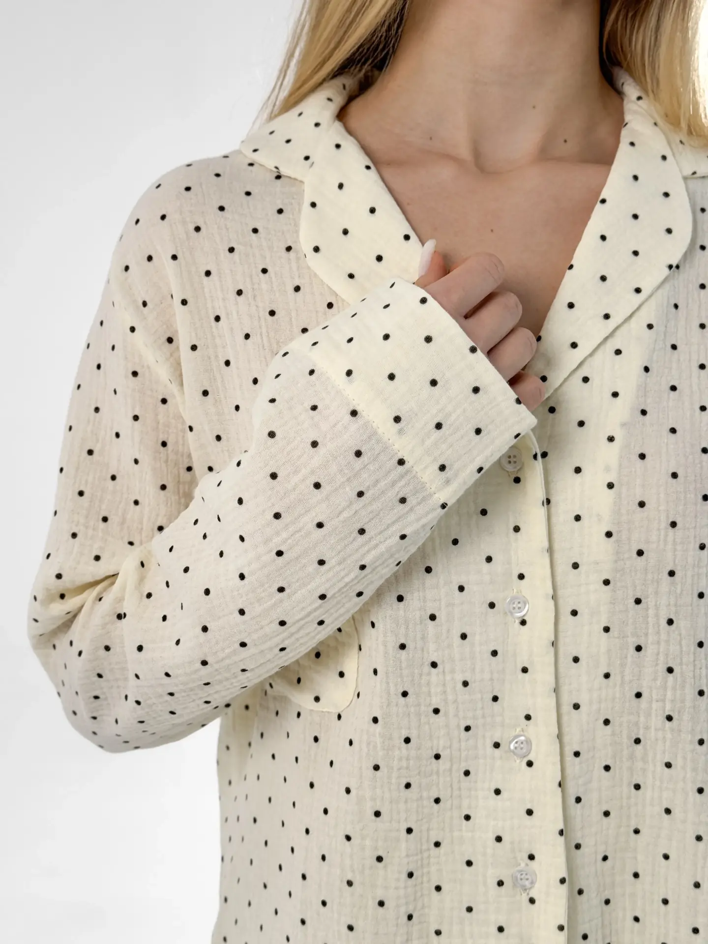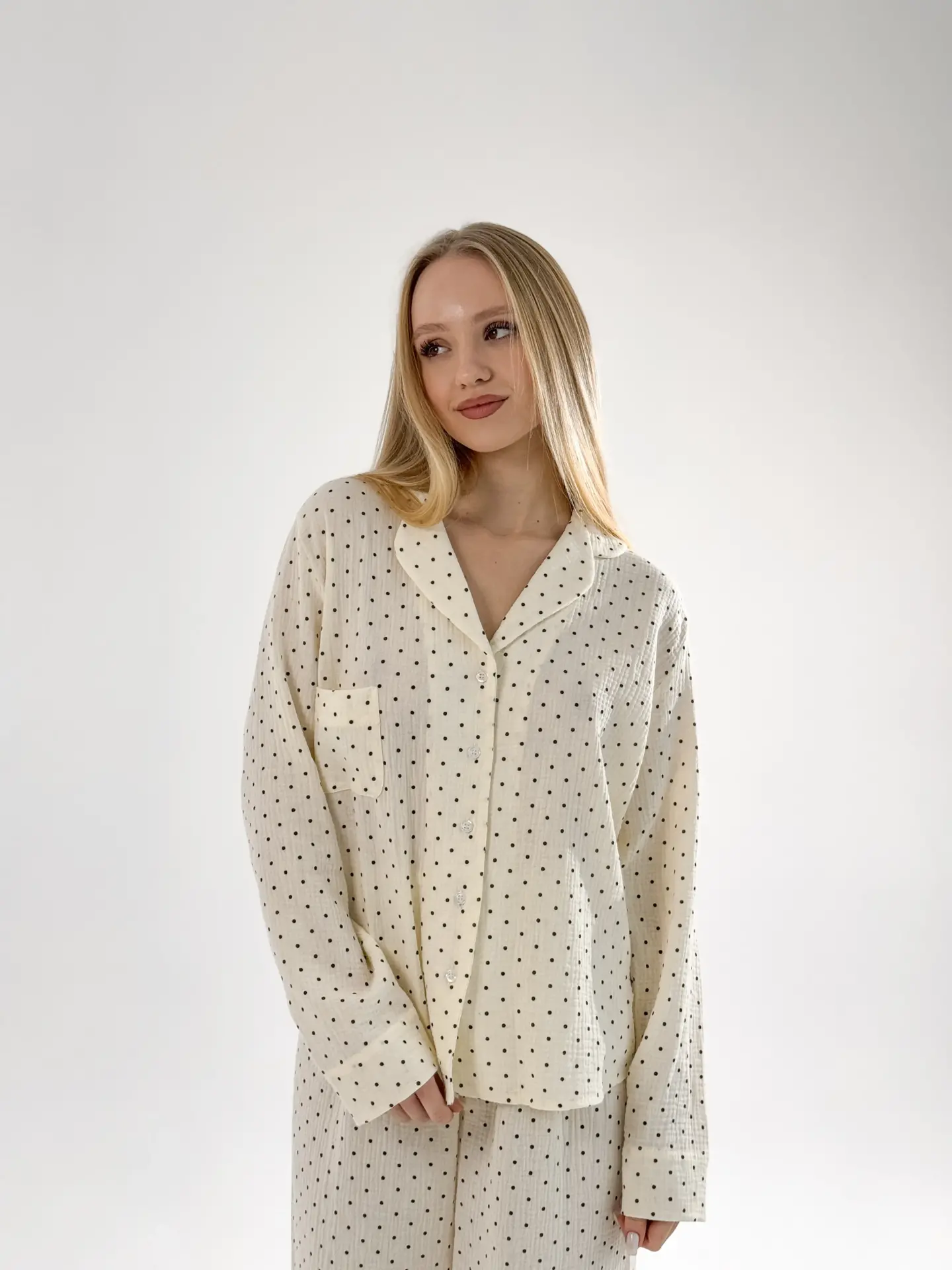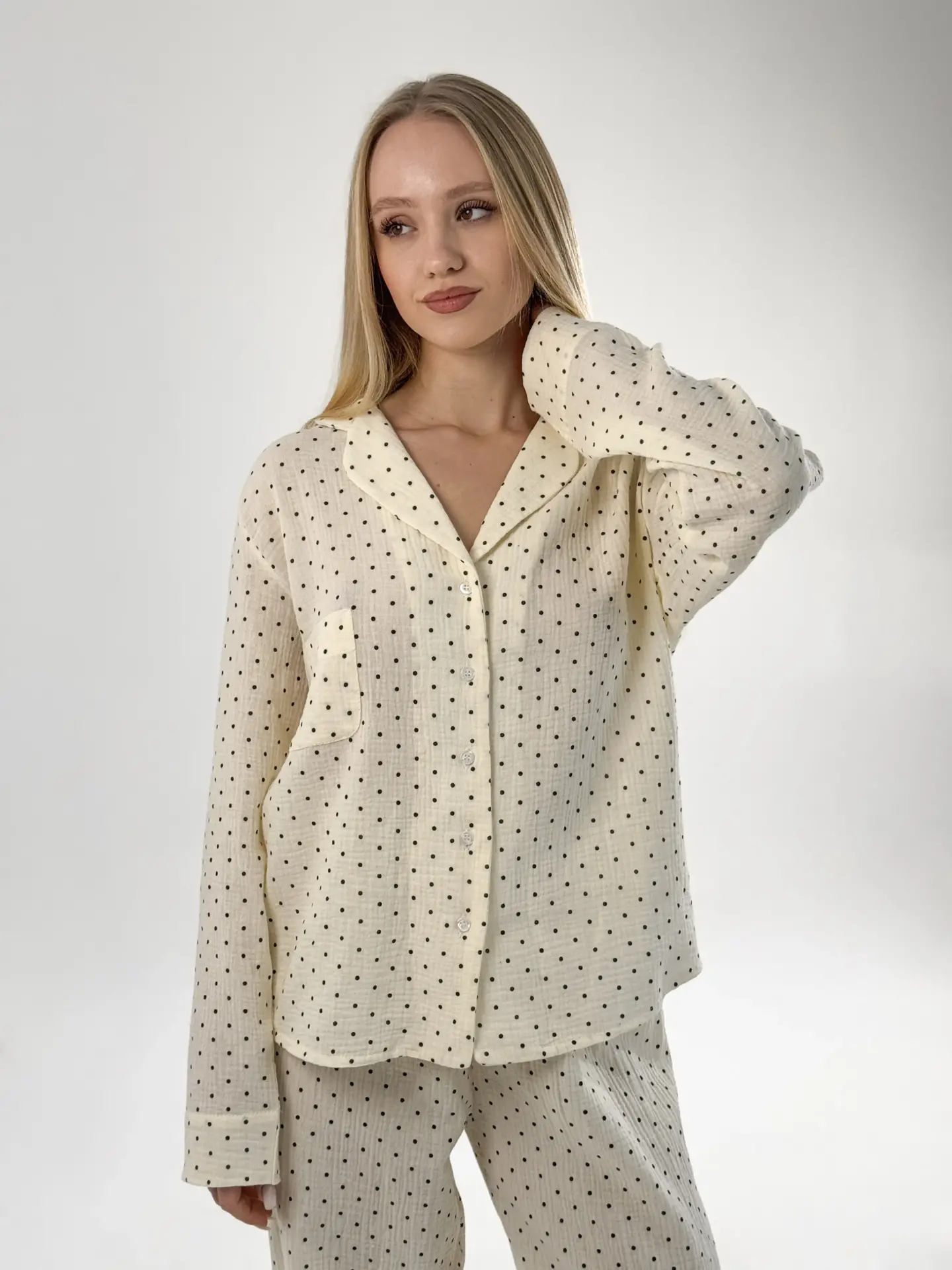 Komplet piżamowy koszula i spodnie, z muślinu, kremowy w groszki