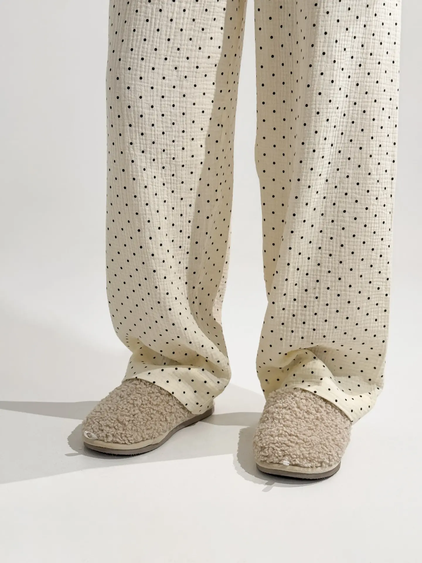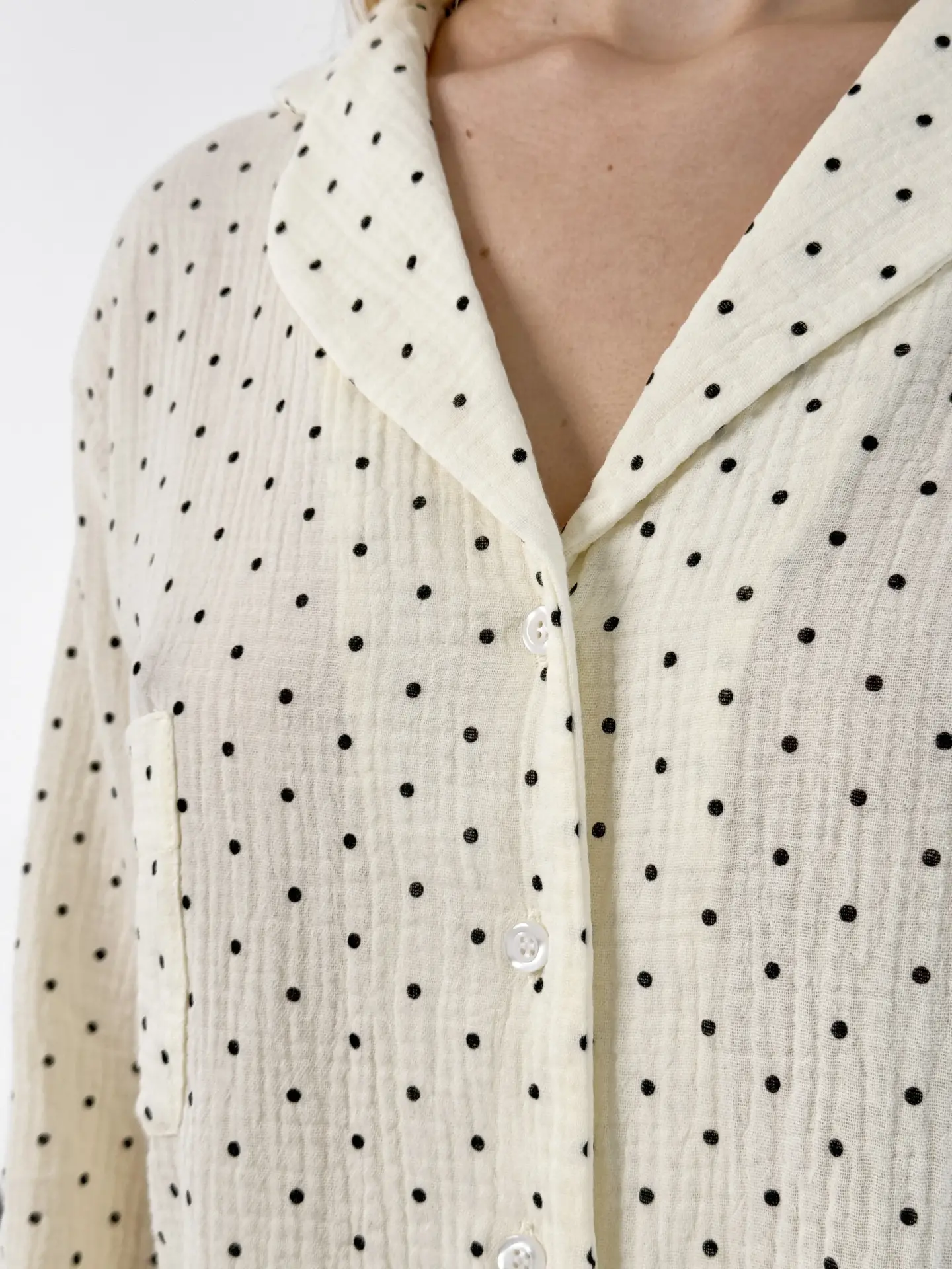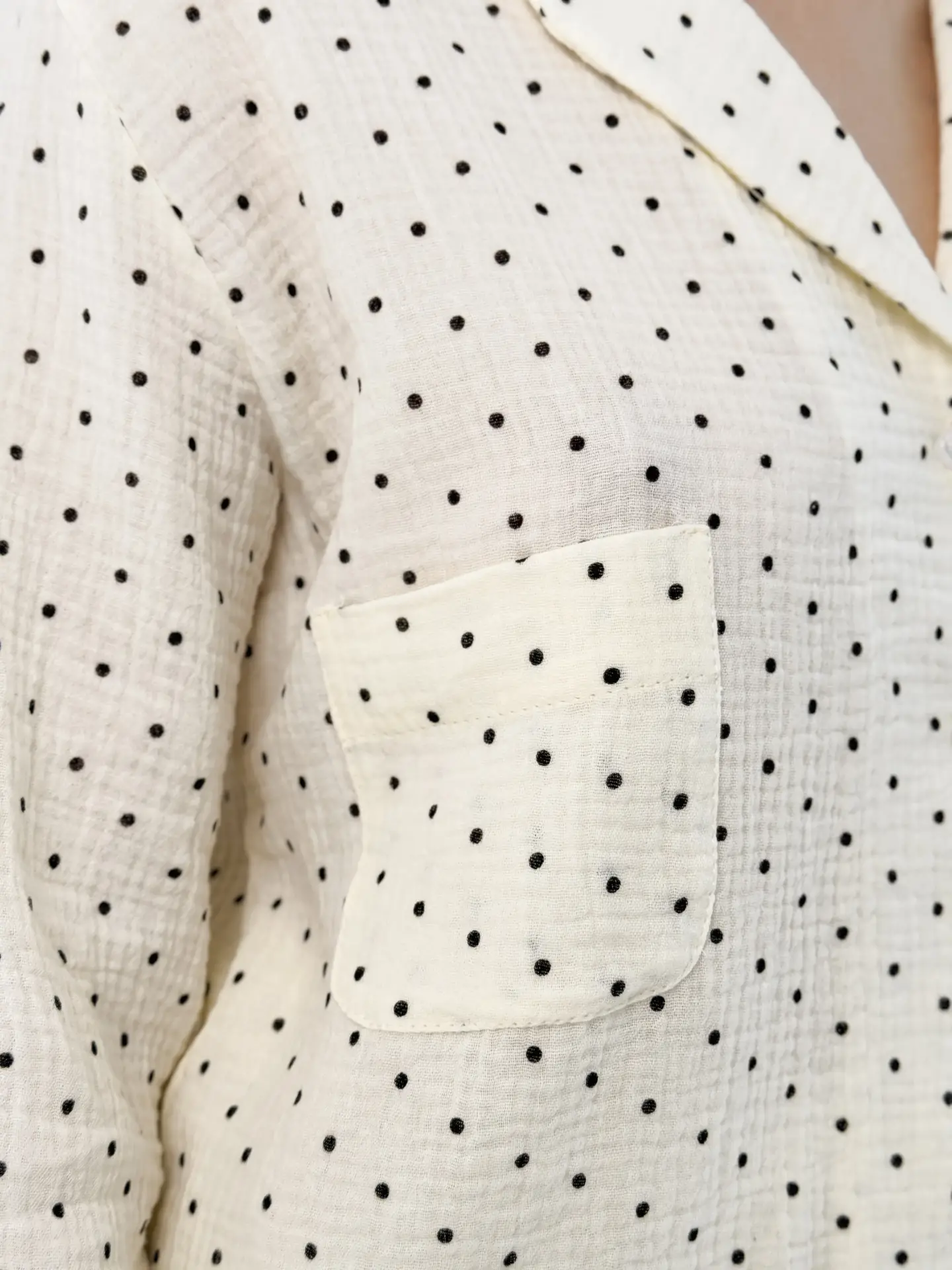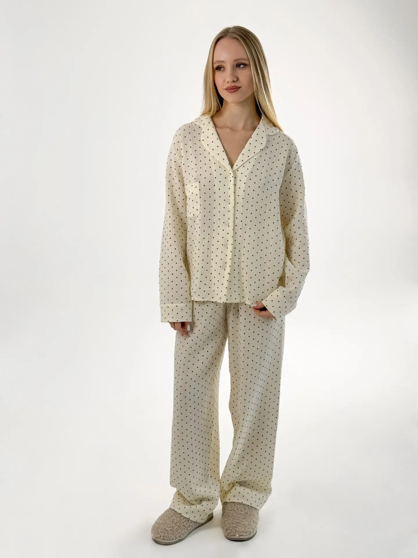 Komplet piżamowy koszula i spodnie, z muślinu, kremowy w groszki