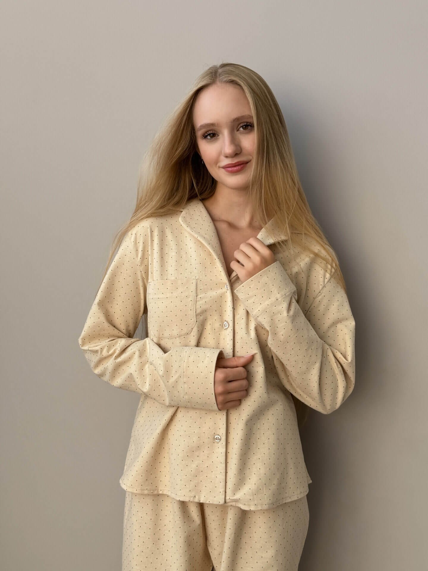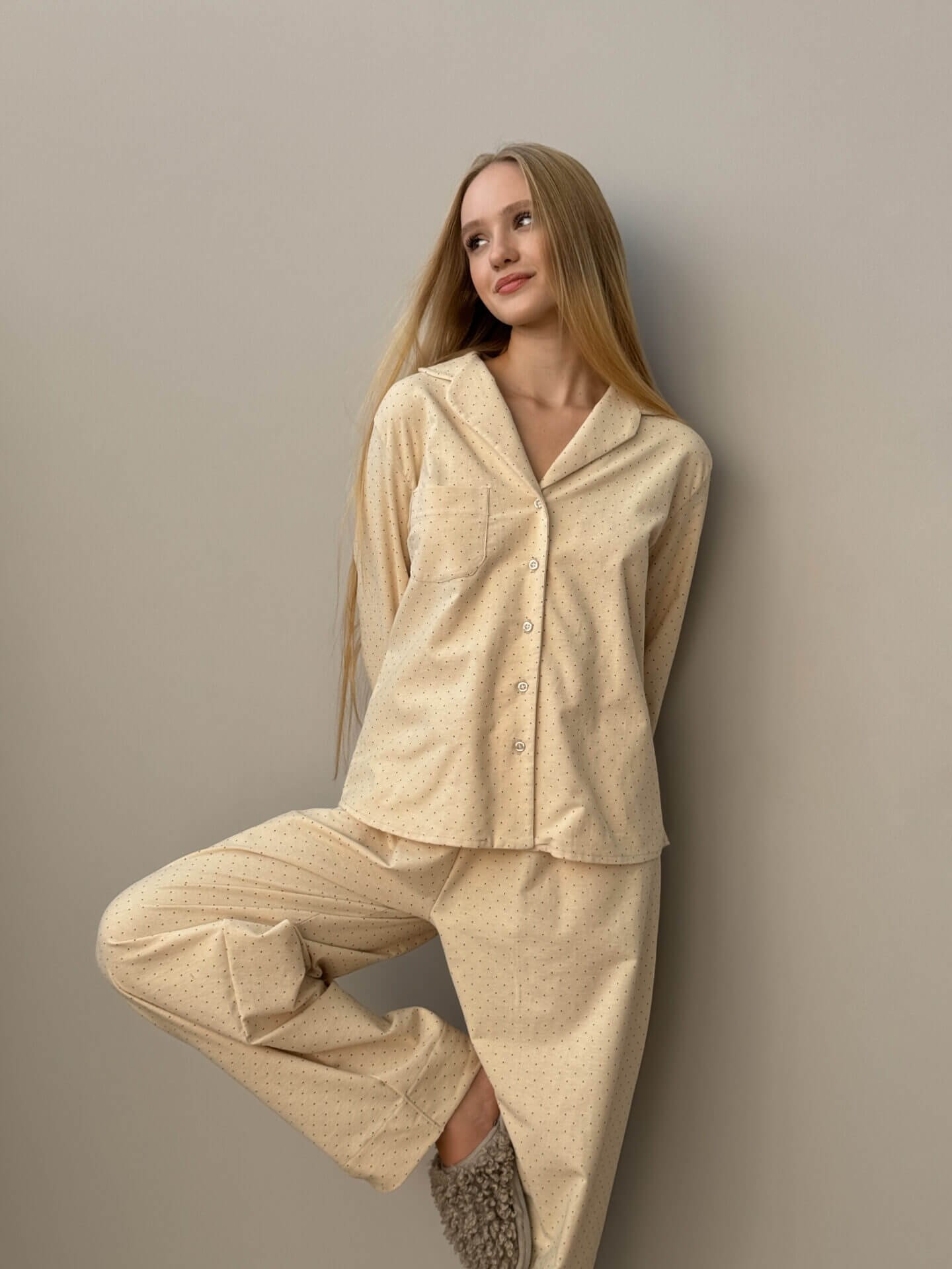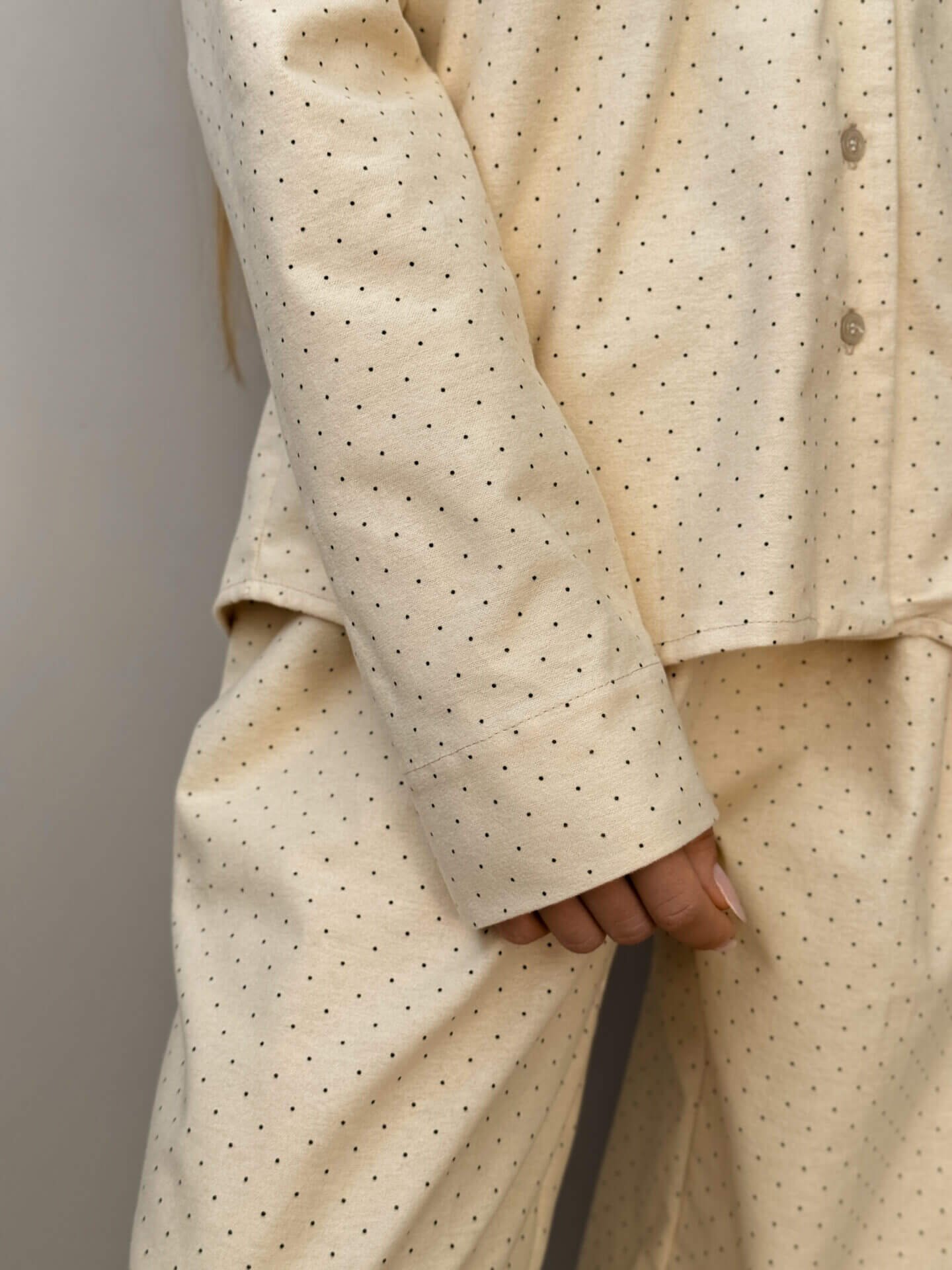 Komplet piżamowy koszula i spodnie, z flaneli, kremowy w drobne groszki