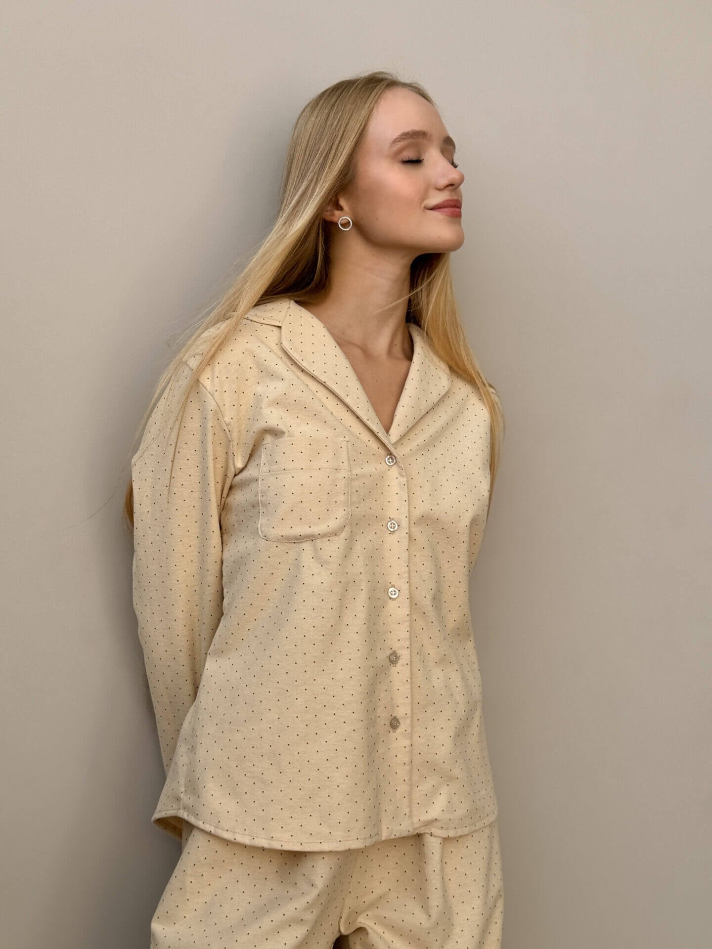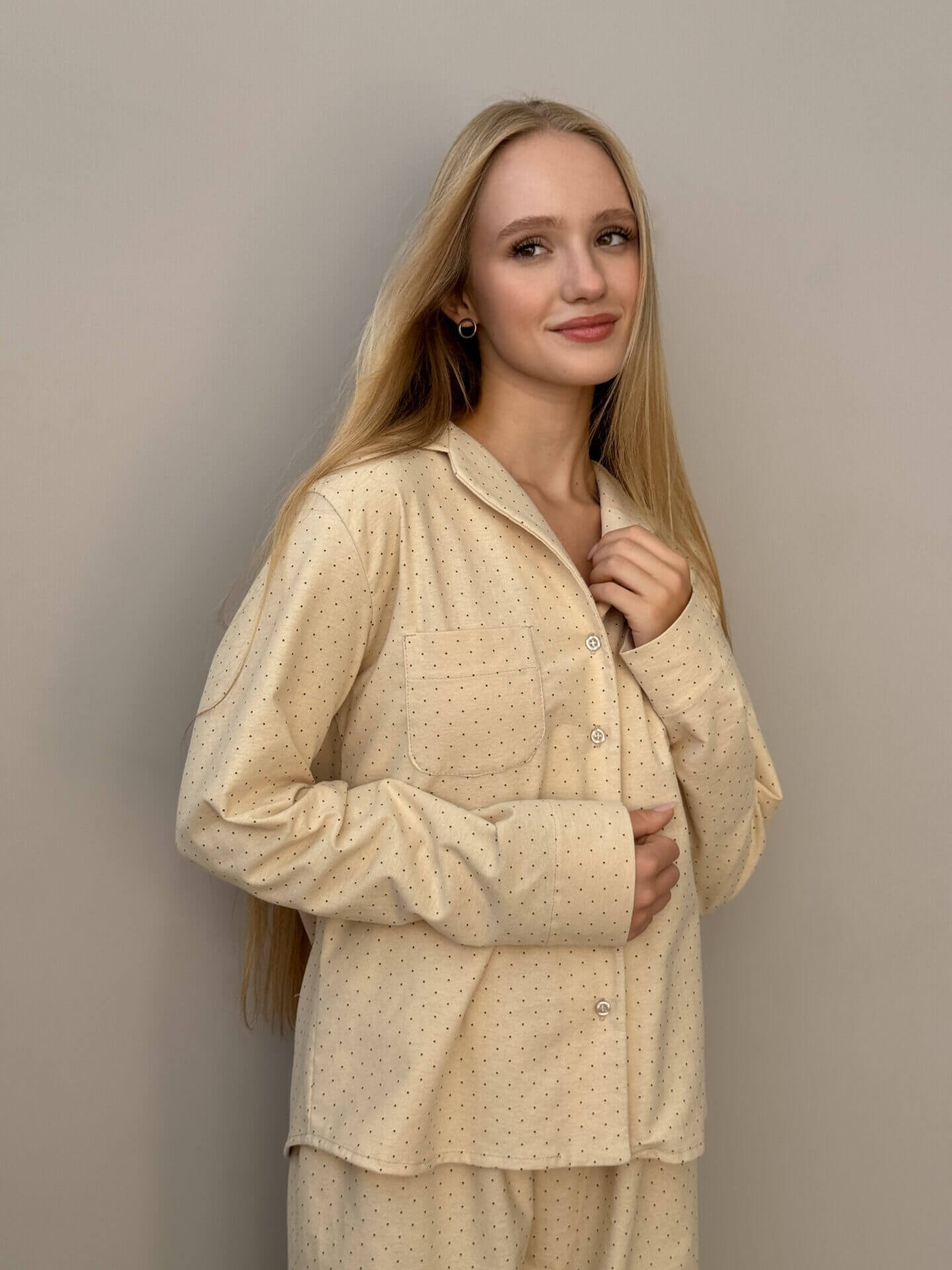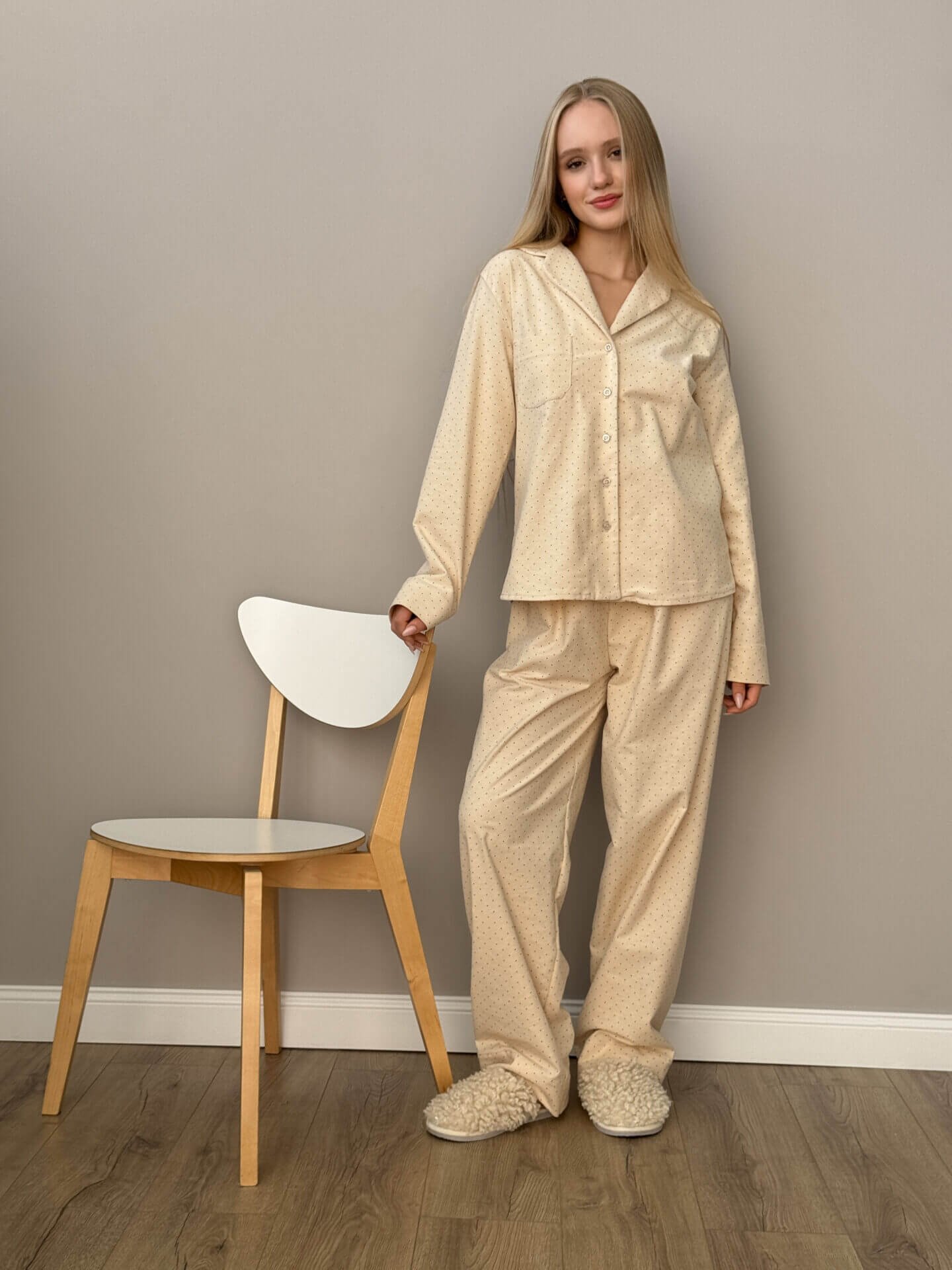 Komplet piżamowy koszula i spodnie, z flaneli, kremowy w drobne groszki