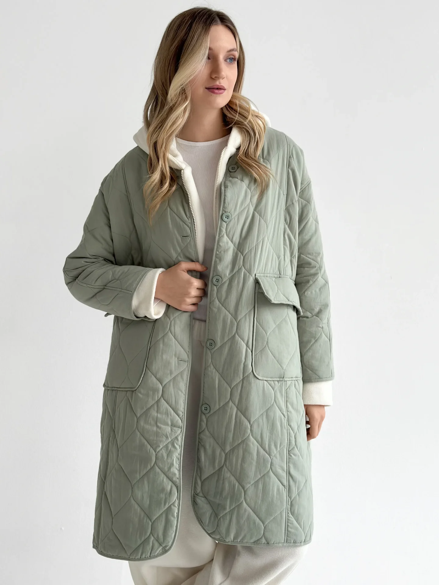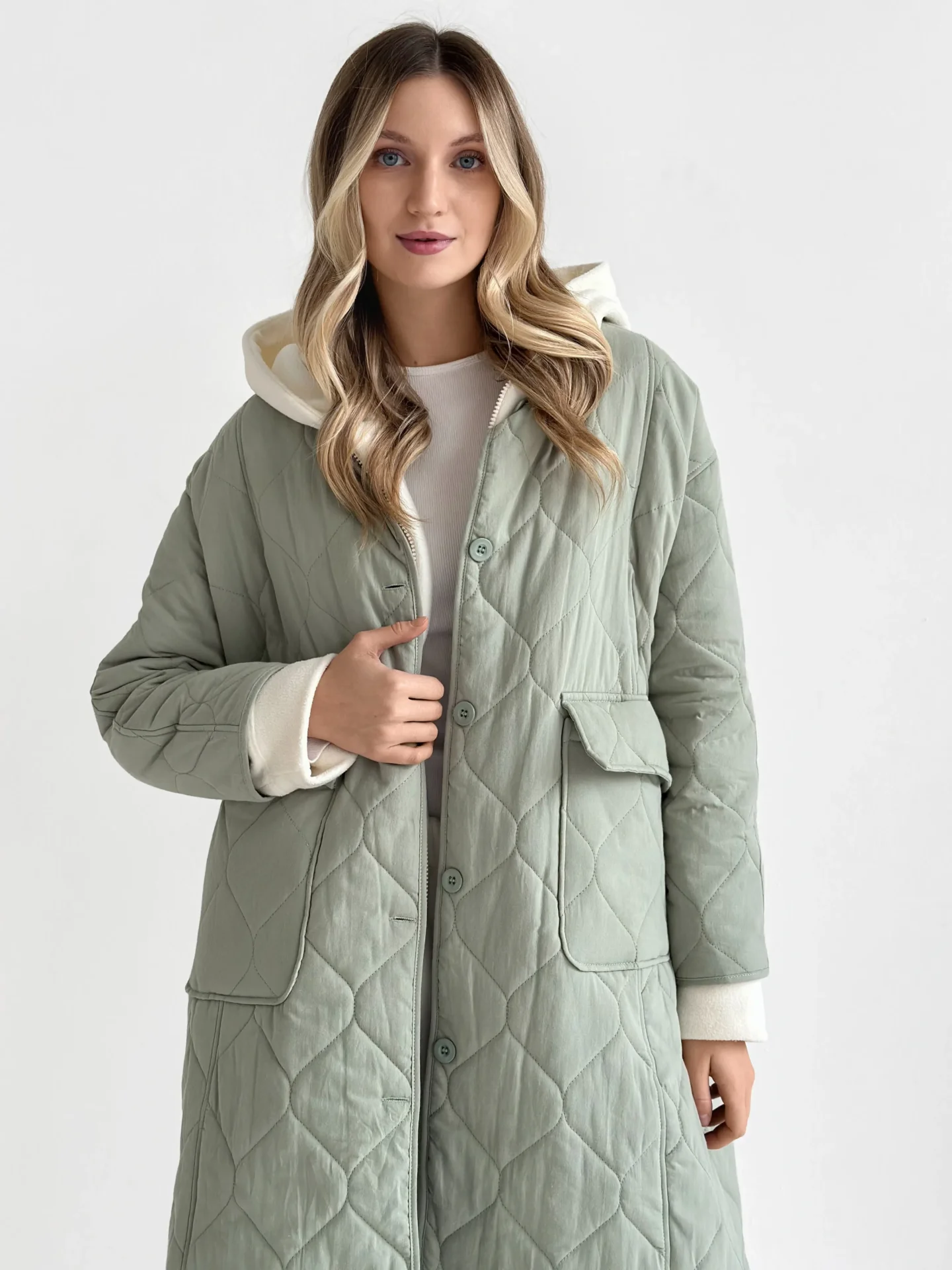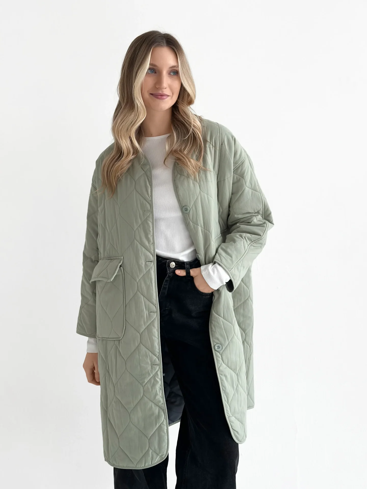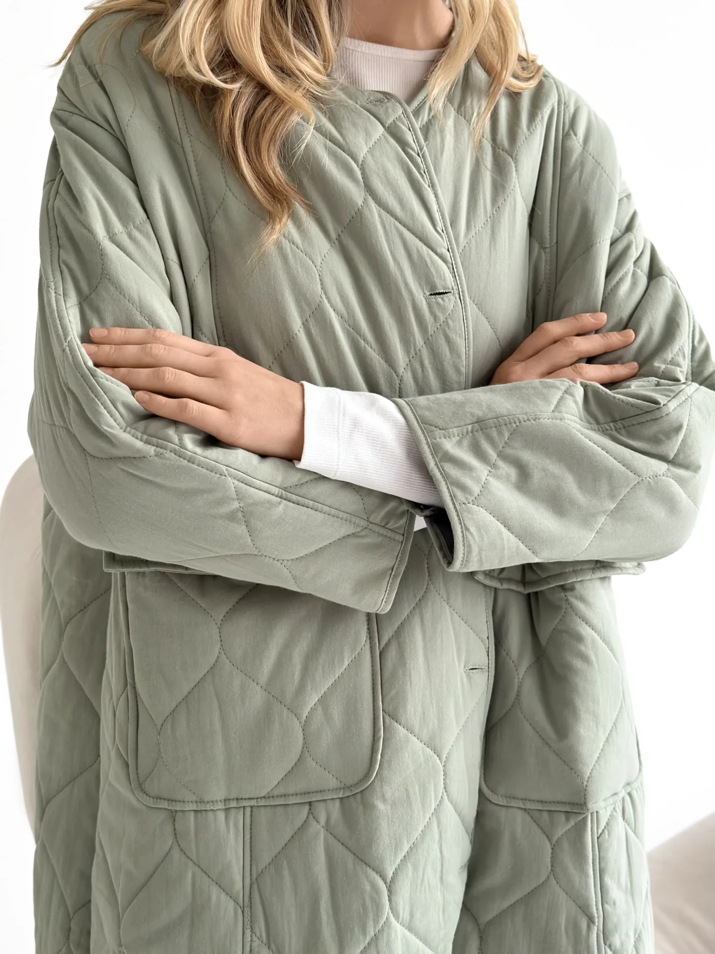 Miękki i lekki płaszcz przejściowy o pikowanej fakturze tworzy schludną sylwetkę i zapewnia codzienny komfort. Praktyczna długość i minimalistyczny design czynią go uniwersalnym wyborem do miejskich stylizacji w chłodniejszą pogodę.