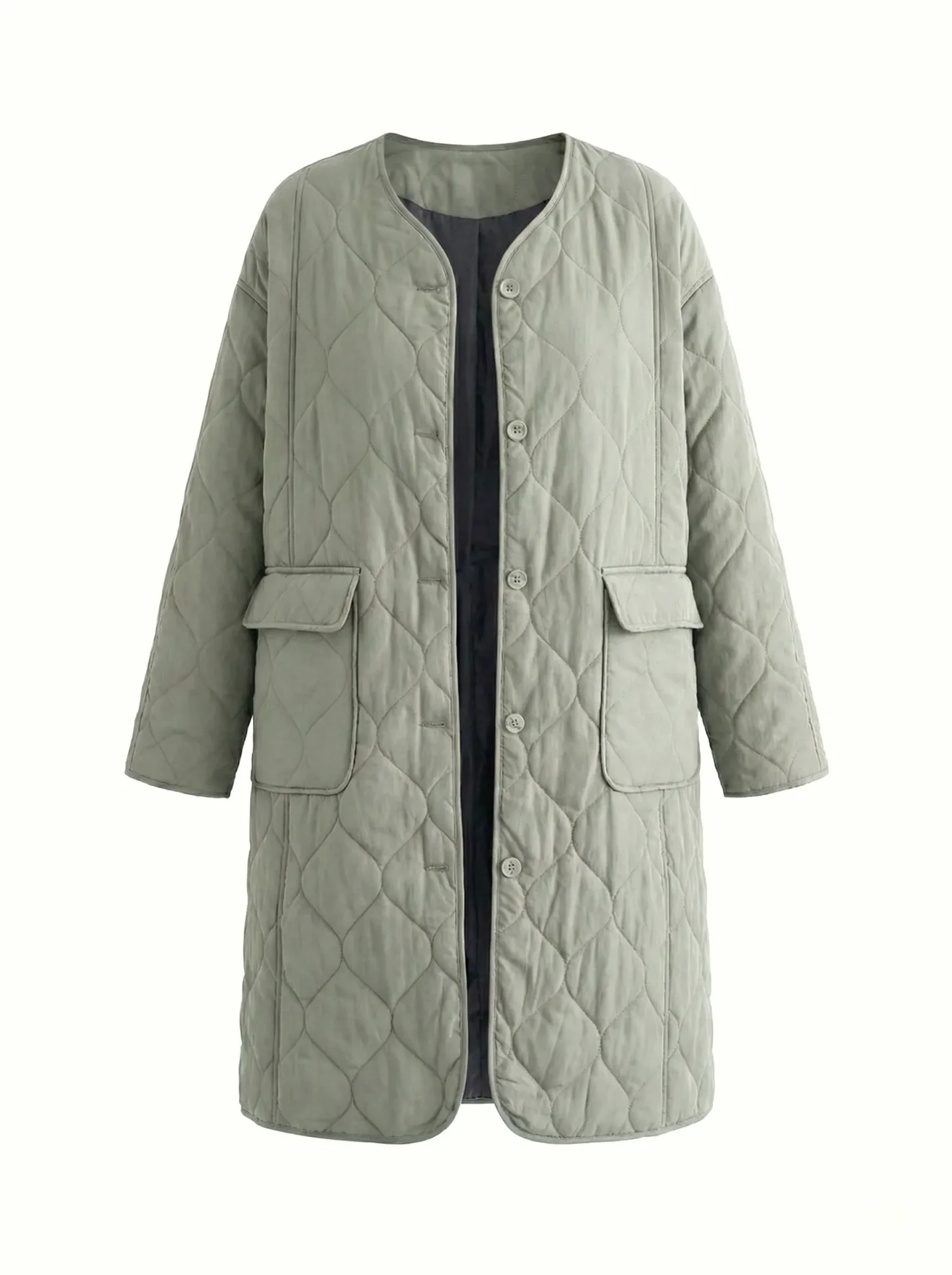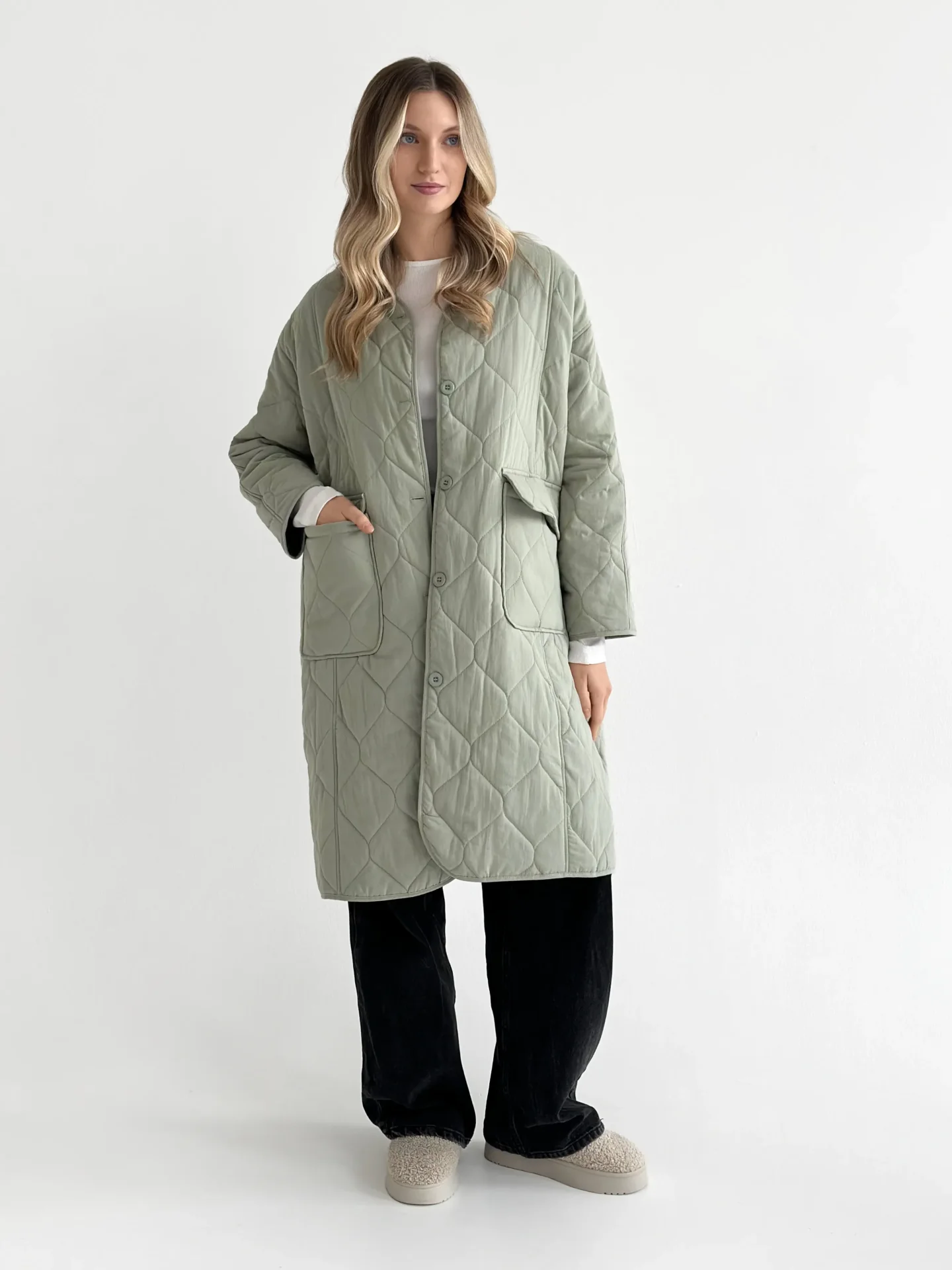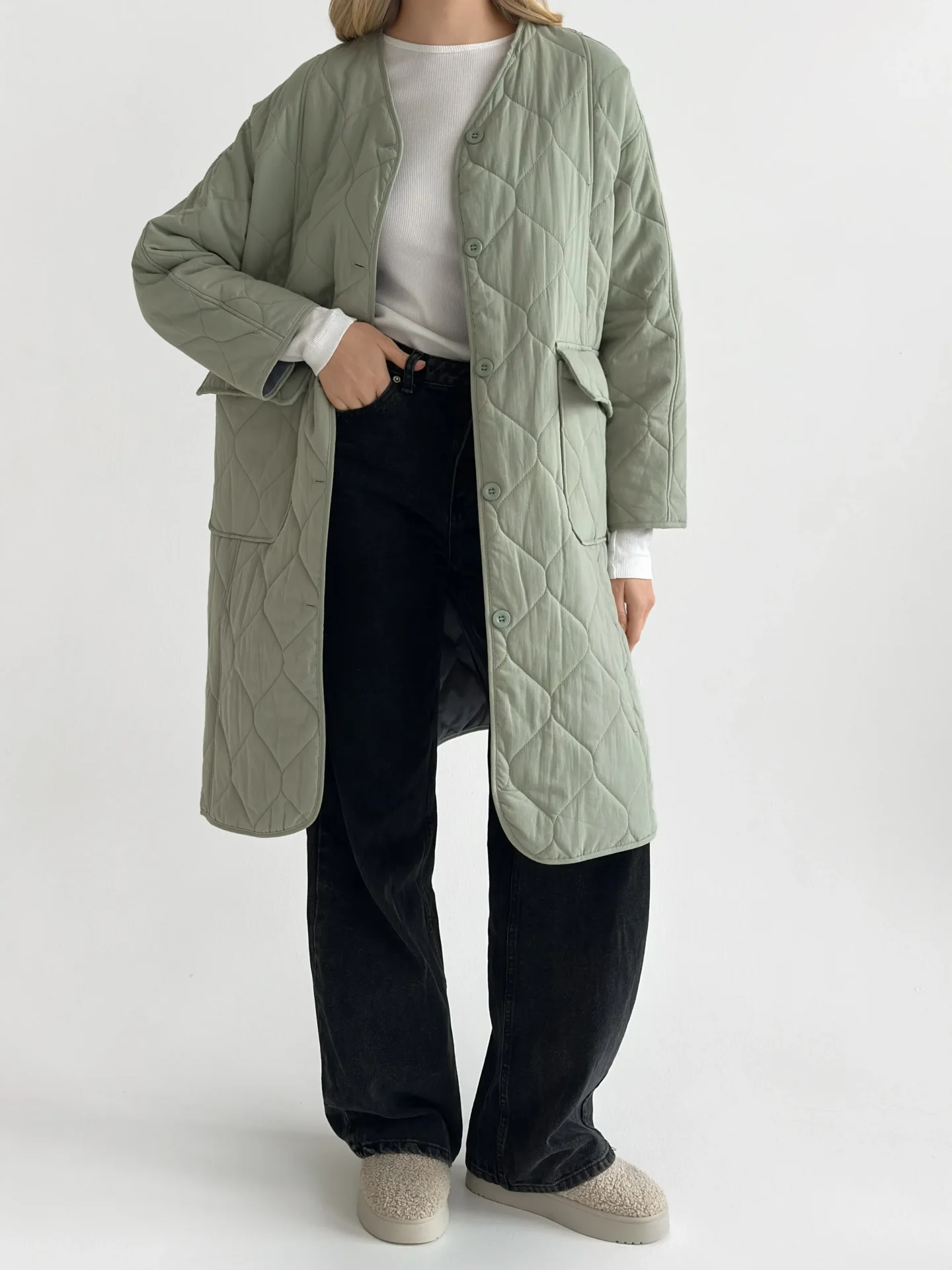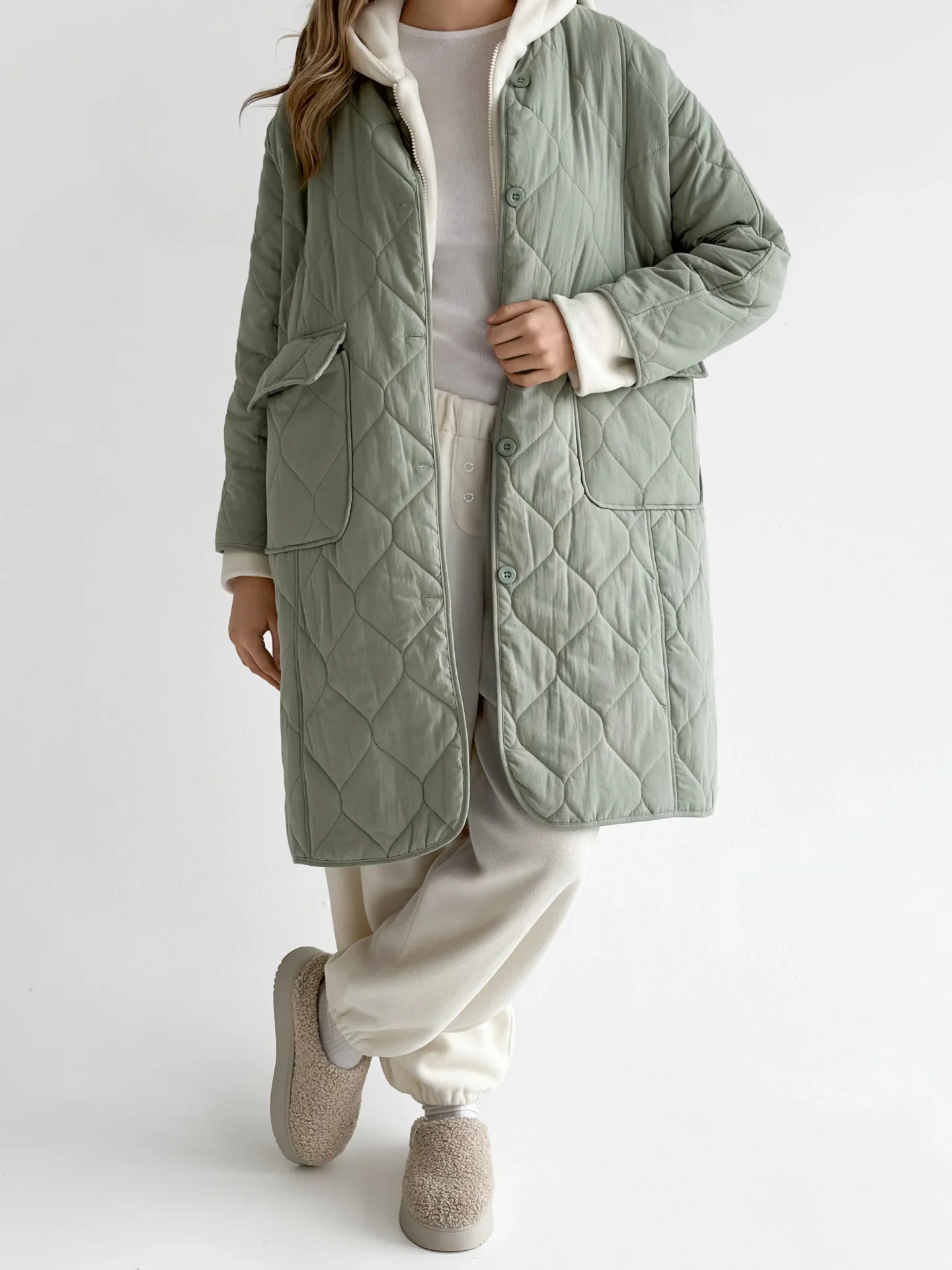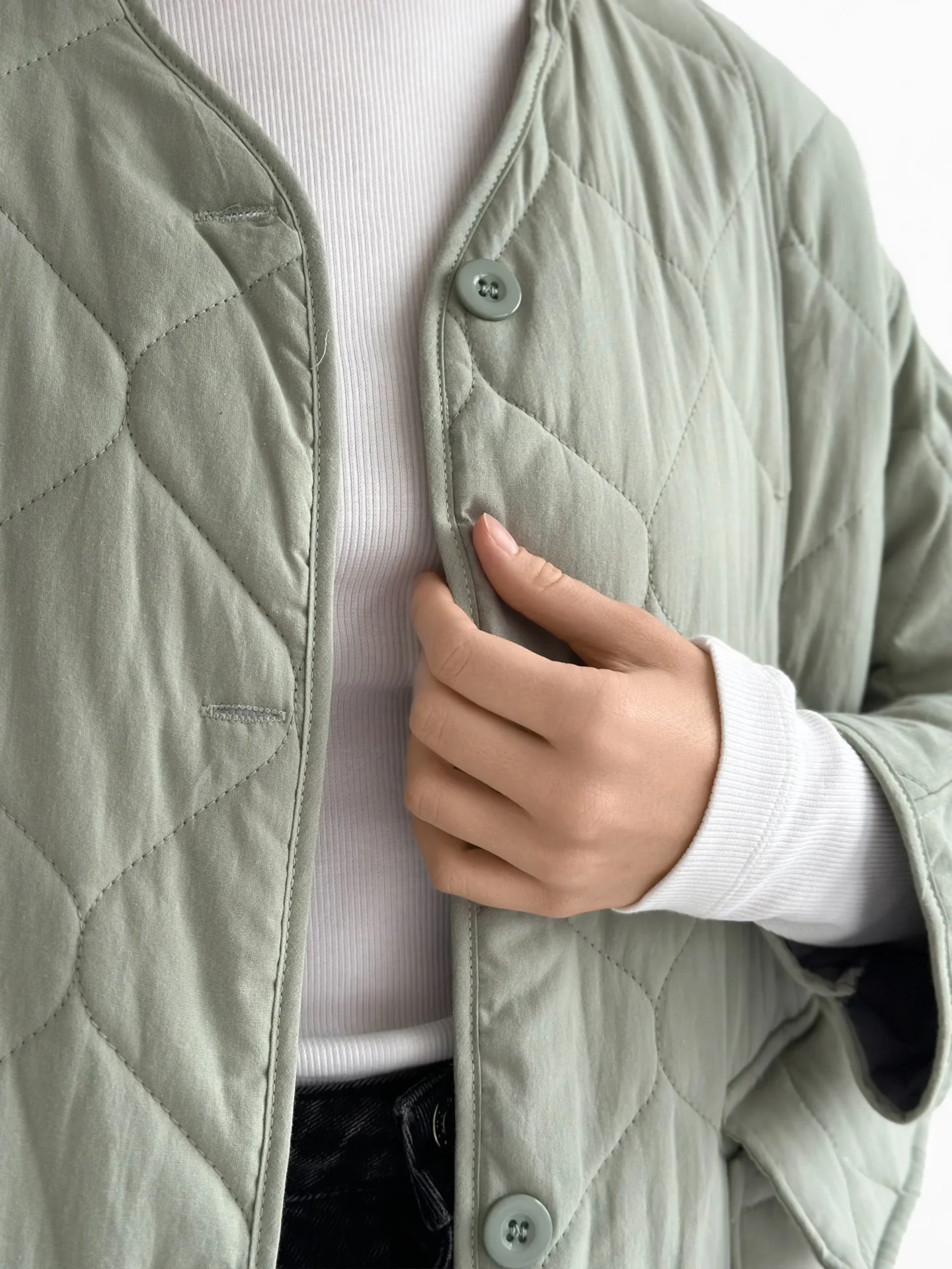 Miękki i lekki płaszcz przejściowy o pikowanej fakturze tworzy schludną sylwetkę i zapewnia codzienny komfort. Praktyczna długość i minimalistyczny design czynią go uniwersalnym wyborem do miejskich stylizacji w chłodniejszą pogodę.