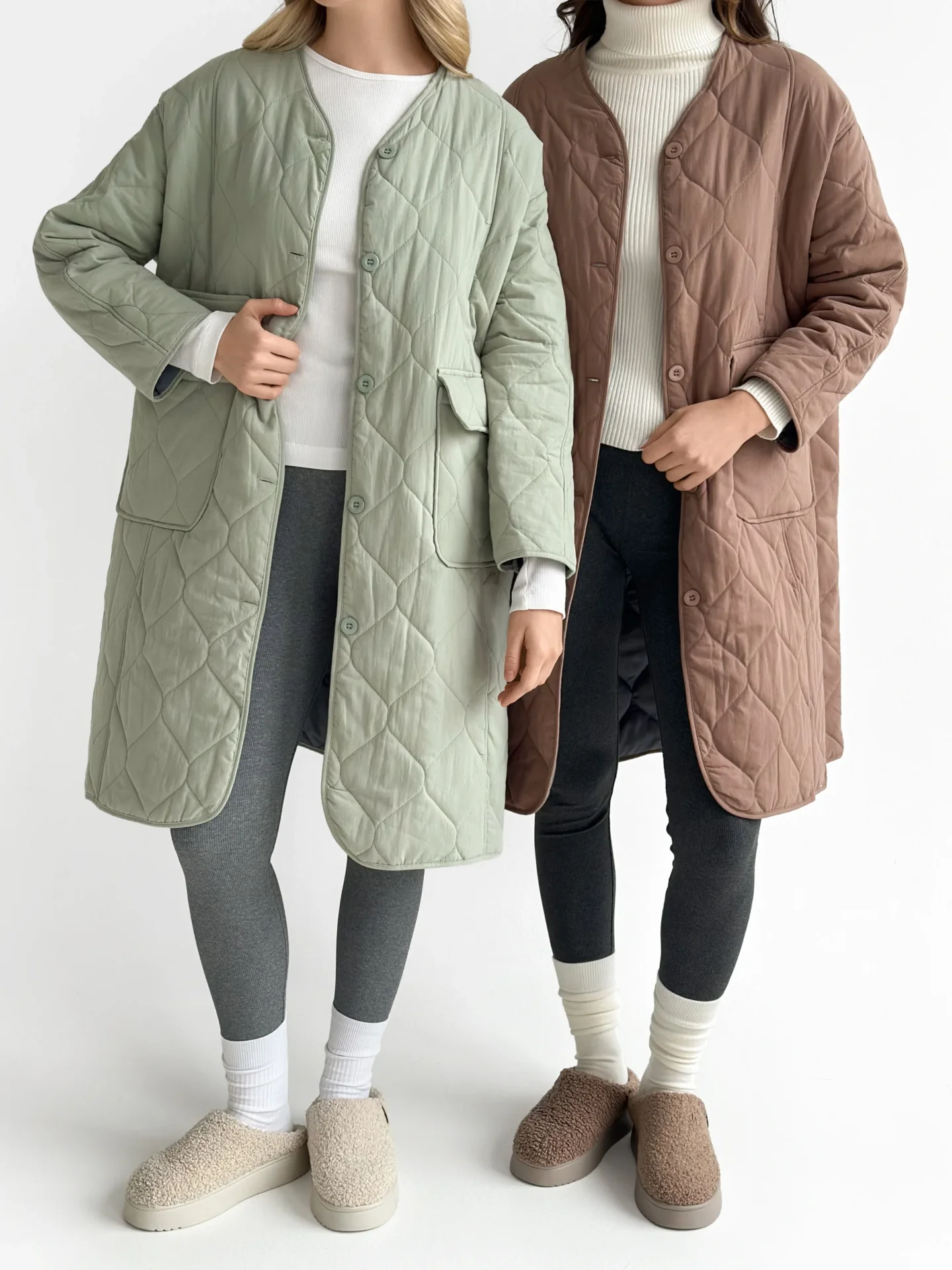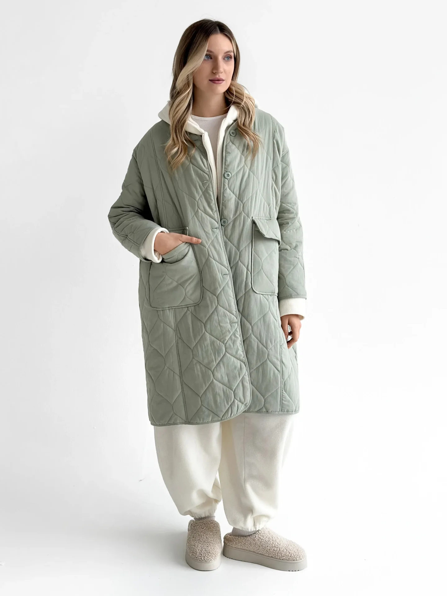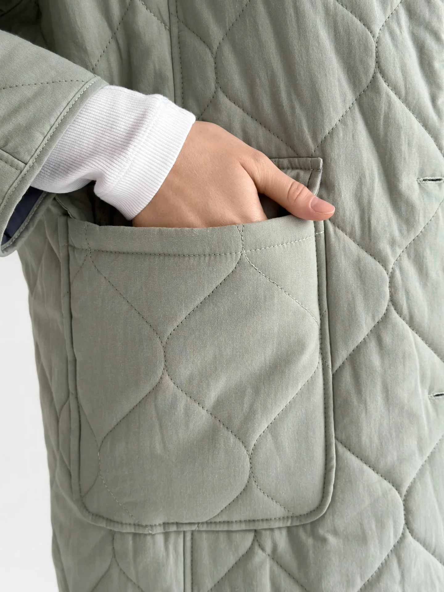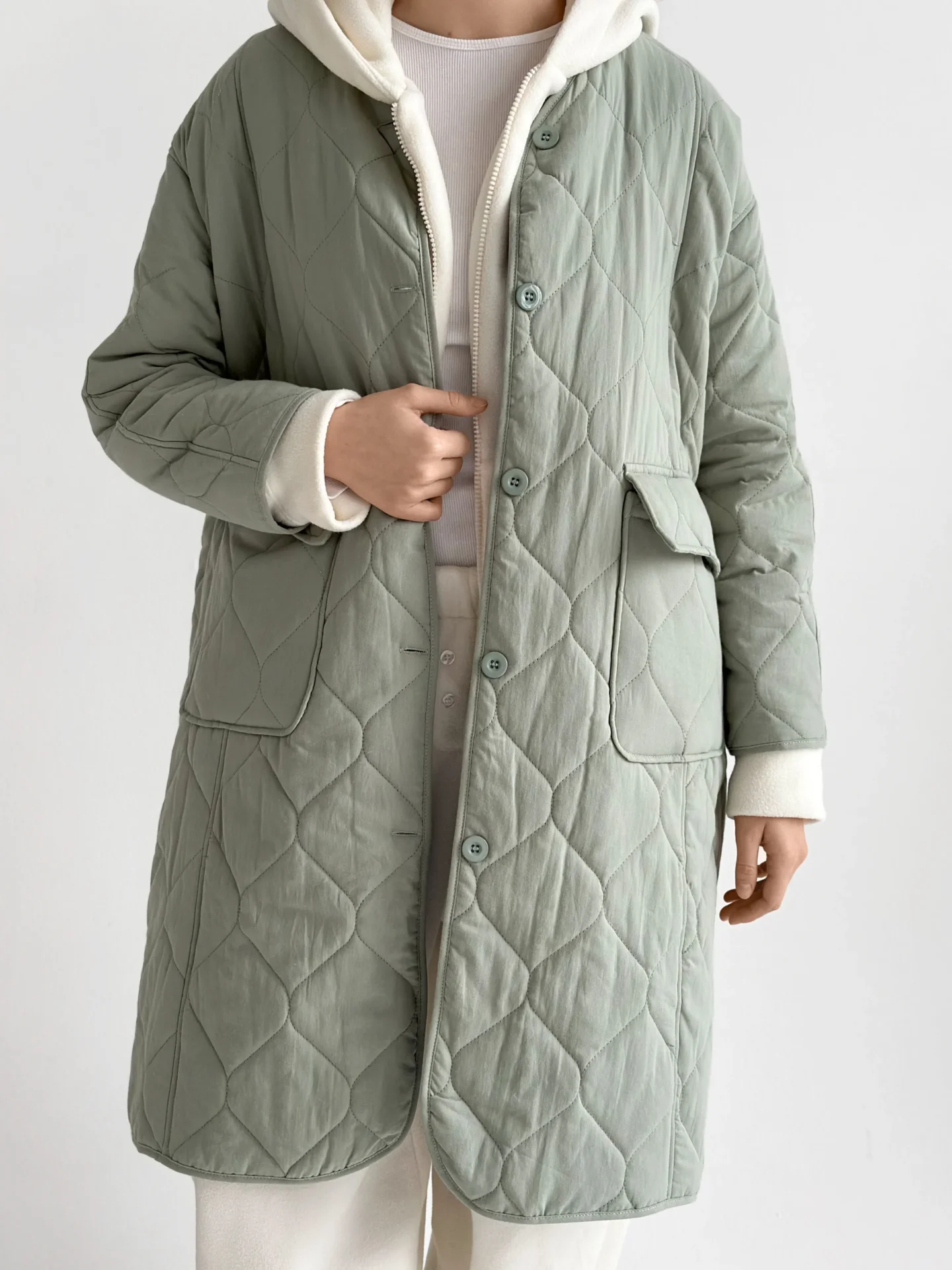 Miękki i lekki płaszcz przejściowy o pikowanej fakturze tworzy schludną sylwetkę i zapewnia codzienny komfort. Praktyczna długość i minimalistyczny design czynią go uniwersalnym wyborem do miejskich stylizacji w chłodniejszą pogodę.