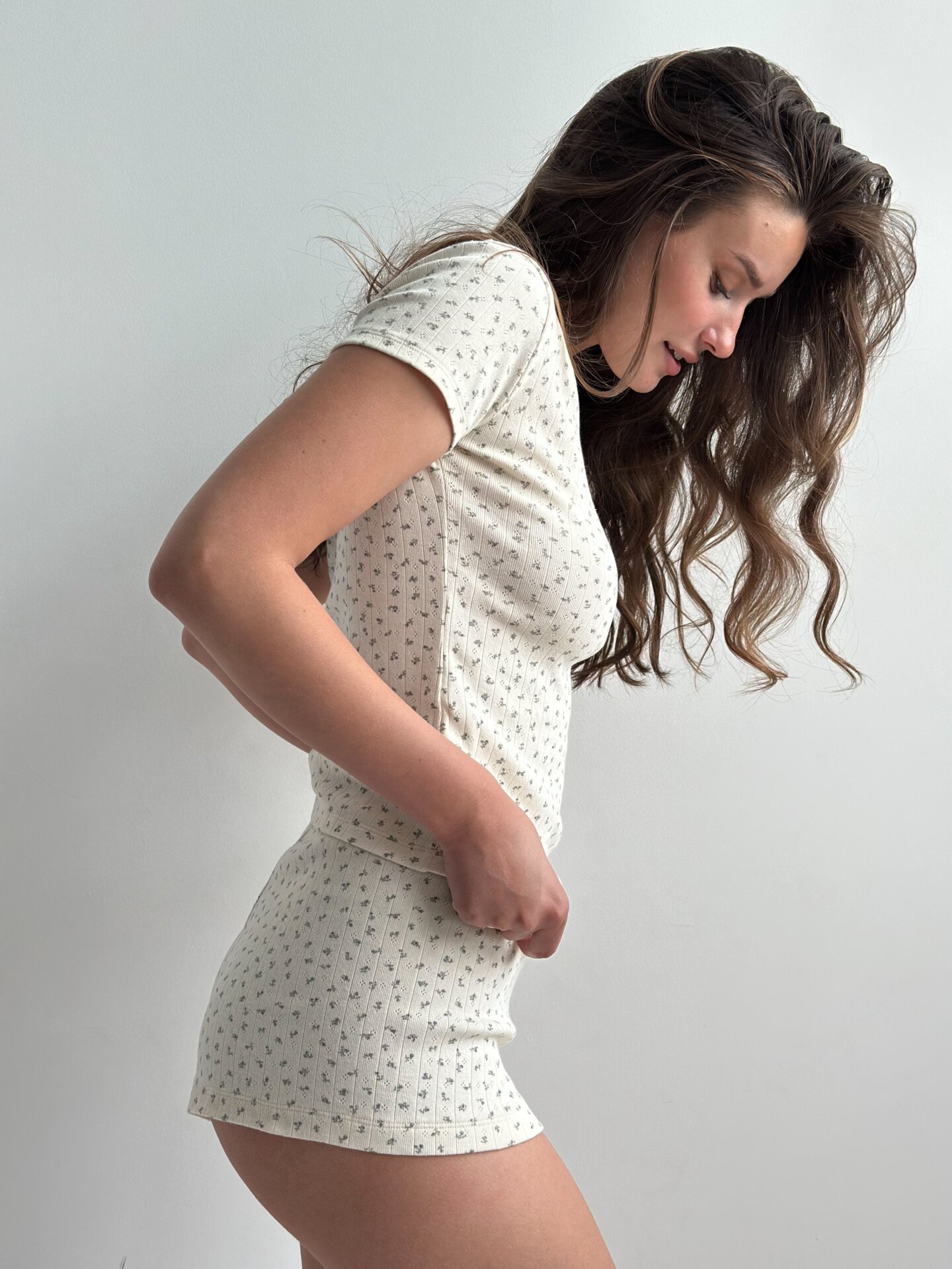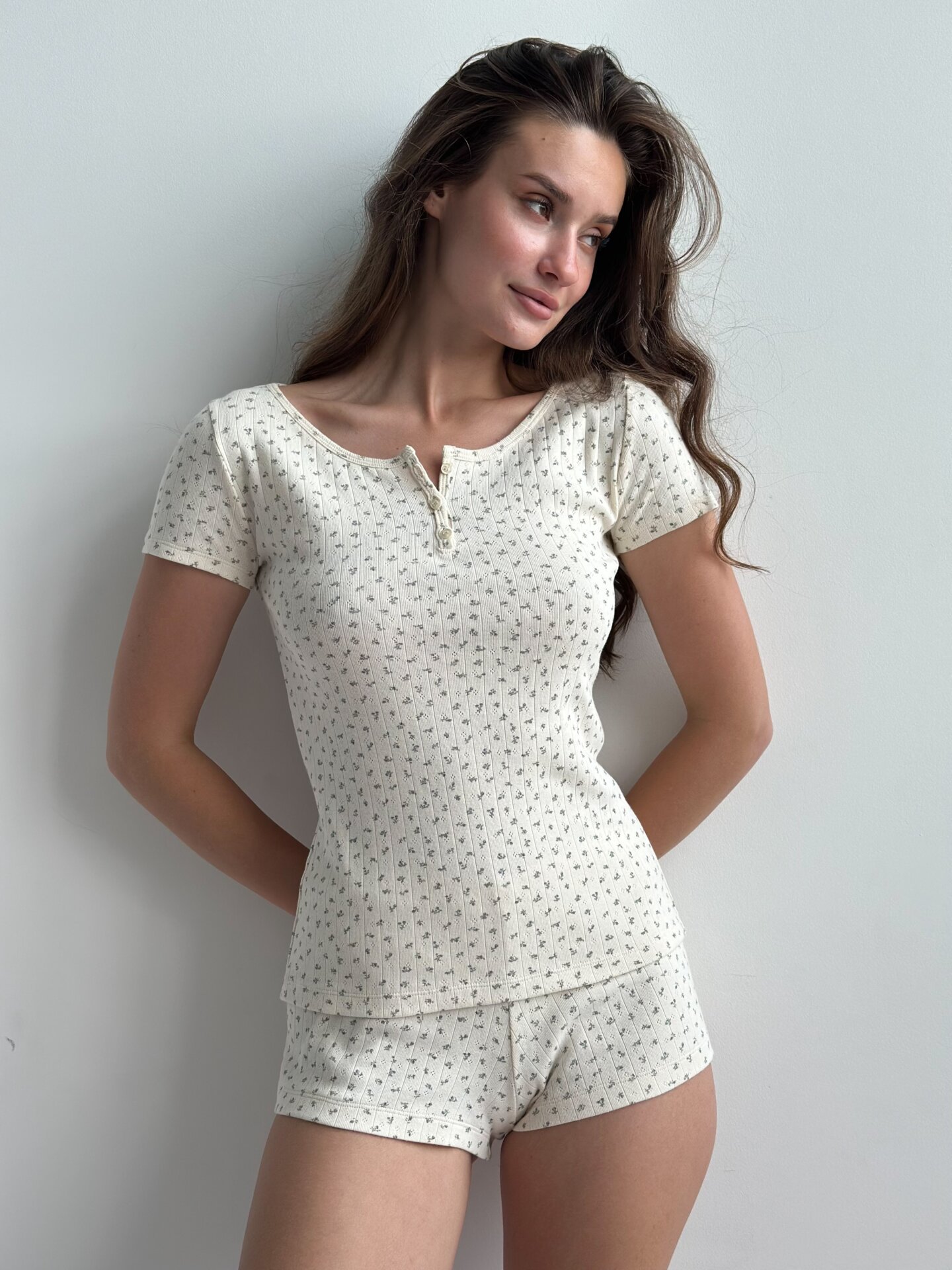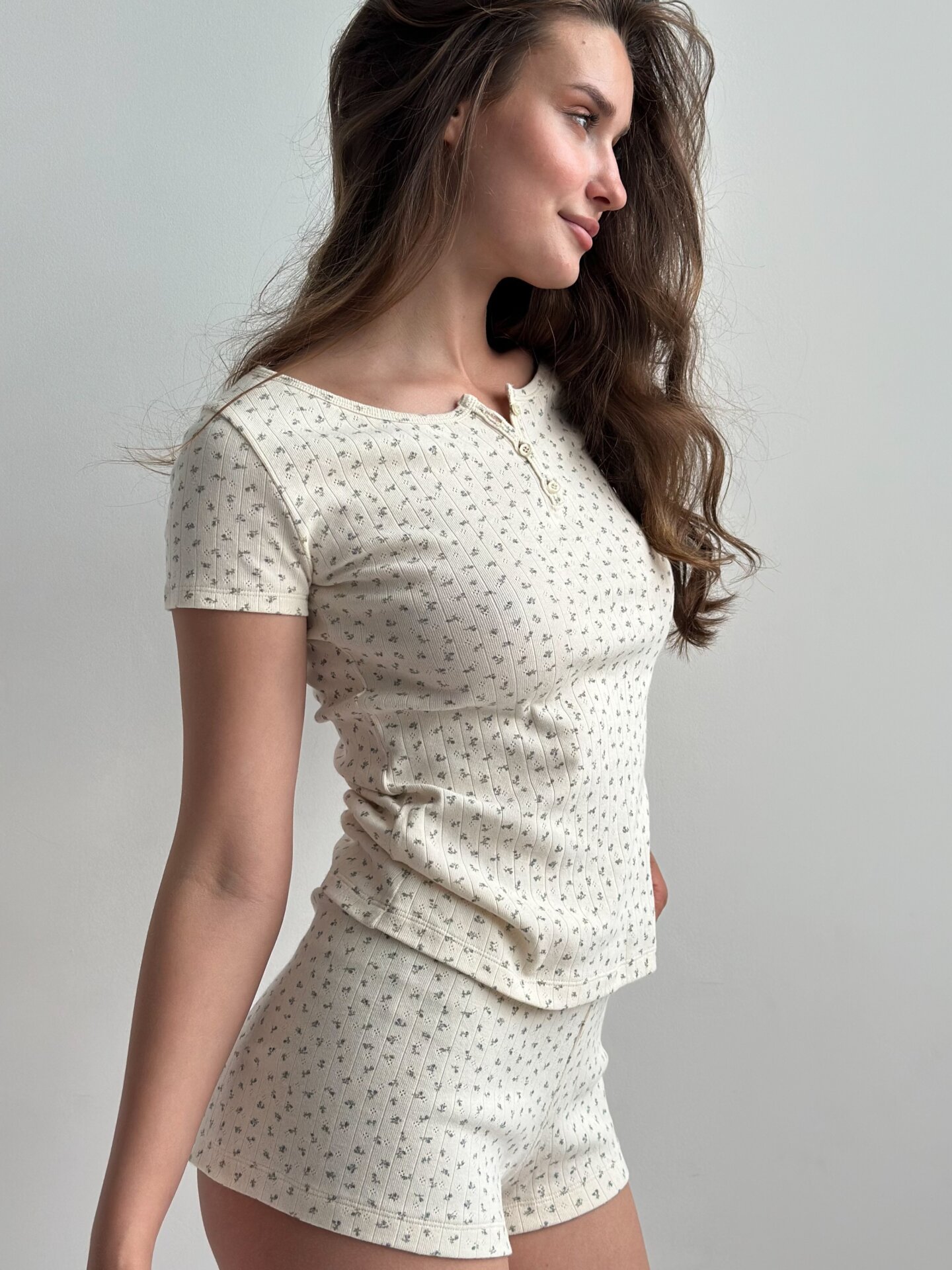 Koszulka z dekoltem na guziki, z ribany prążkowanej, kremowa w niebieskie kwiatki
