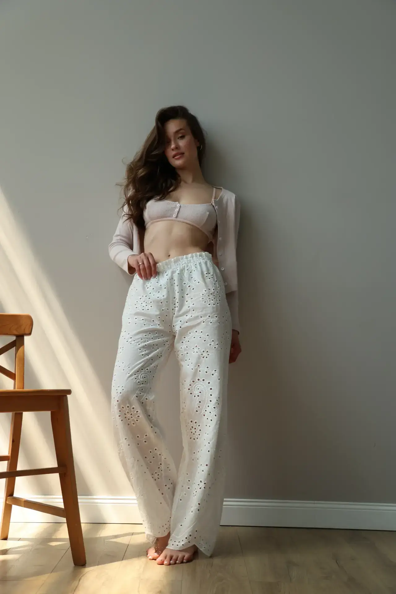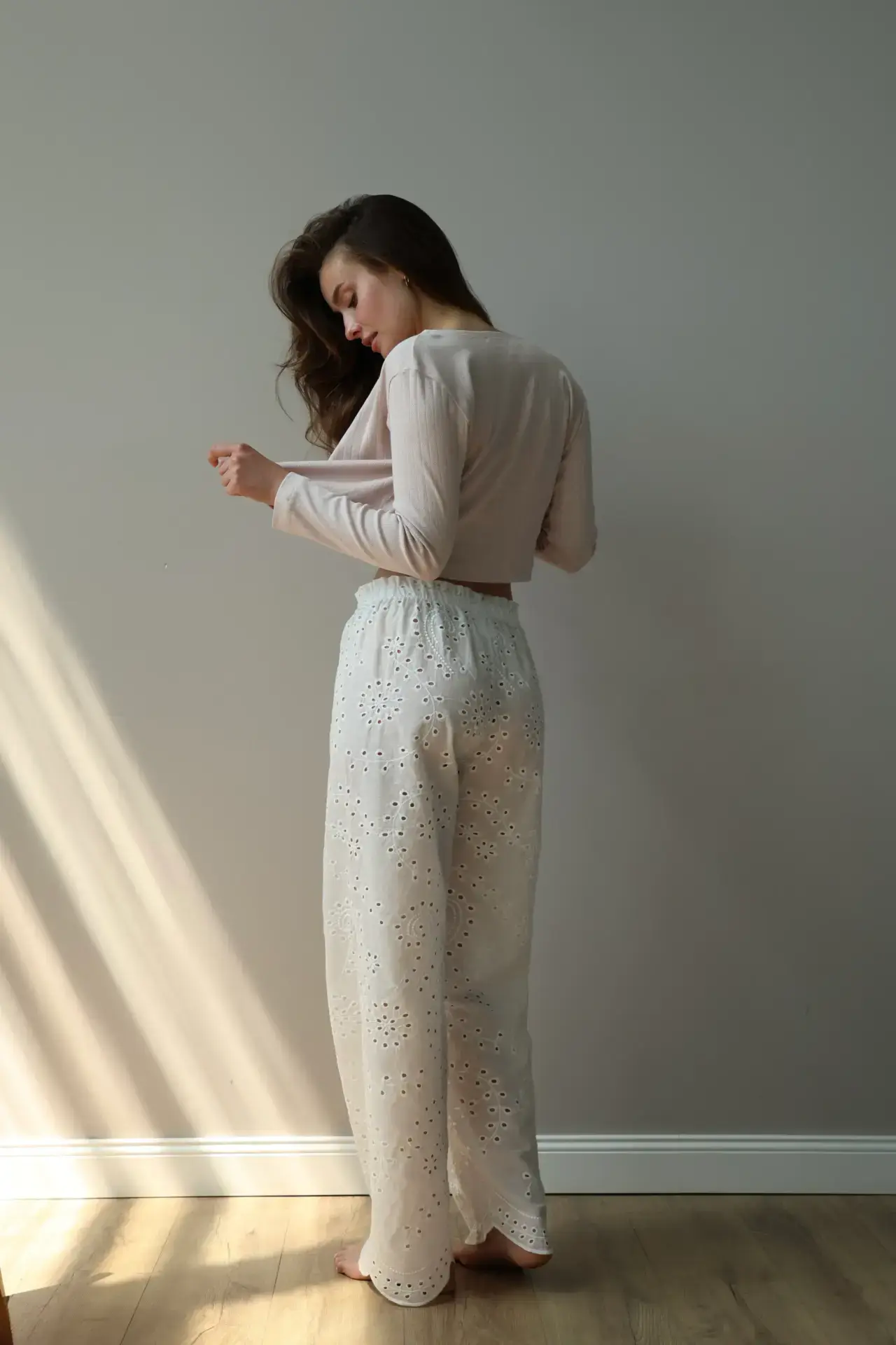 Spodnie Mono z batystu z ażurowym wzorem dają poczucie lekkości i komfortu. Miękka, przewiewna tkanina jest przyjemna w dotyku, a wyrafinowane wzory dodają stylizacji delikatności.
