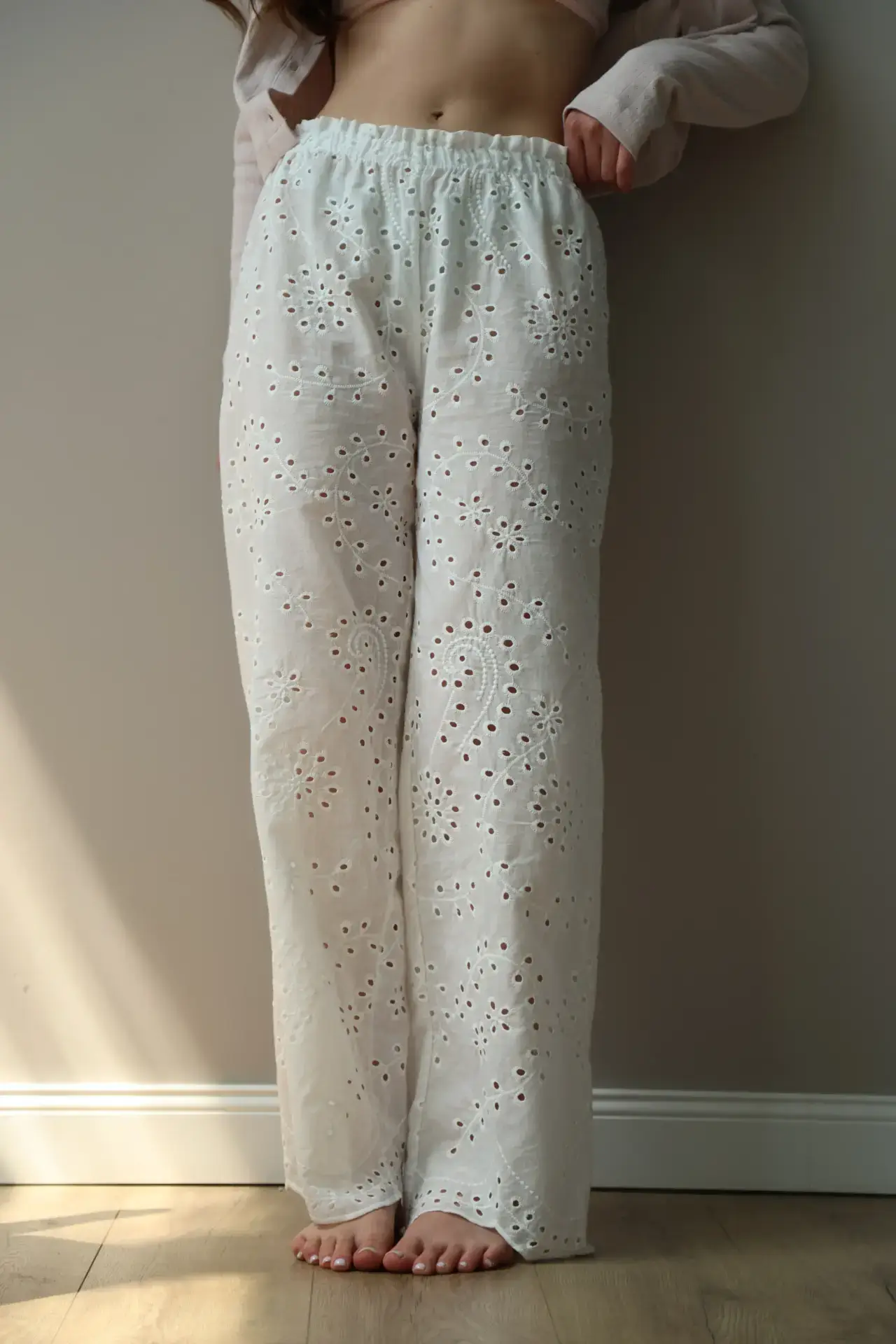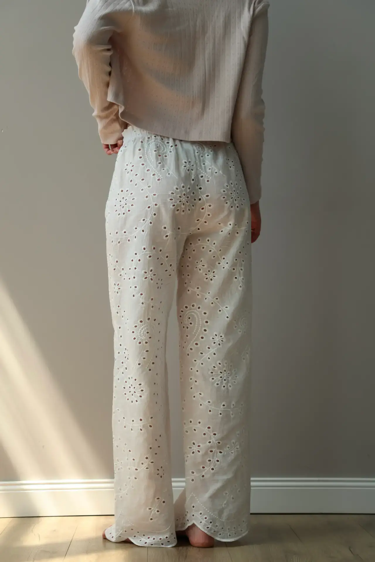 Spodnie Mono z bawełny, haft ażurowy „gałązka”, białe