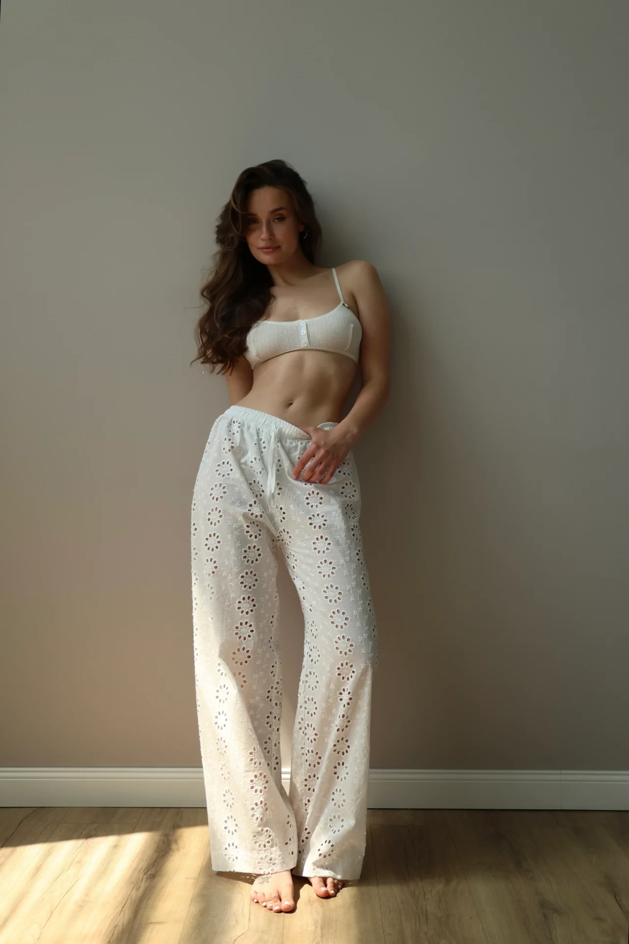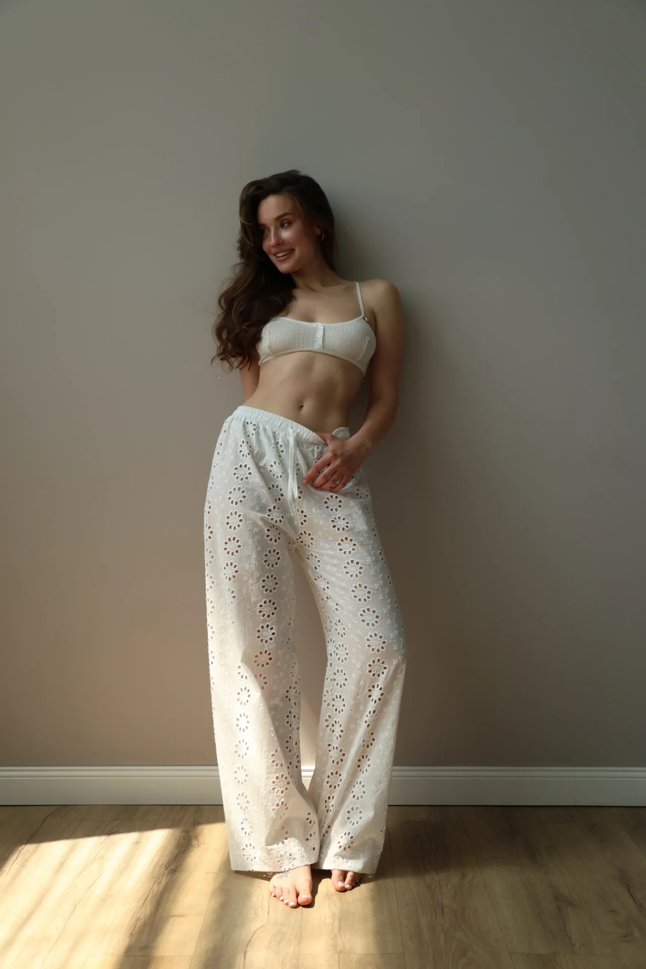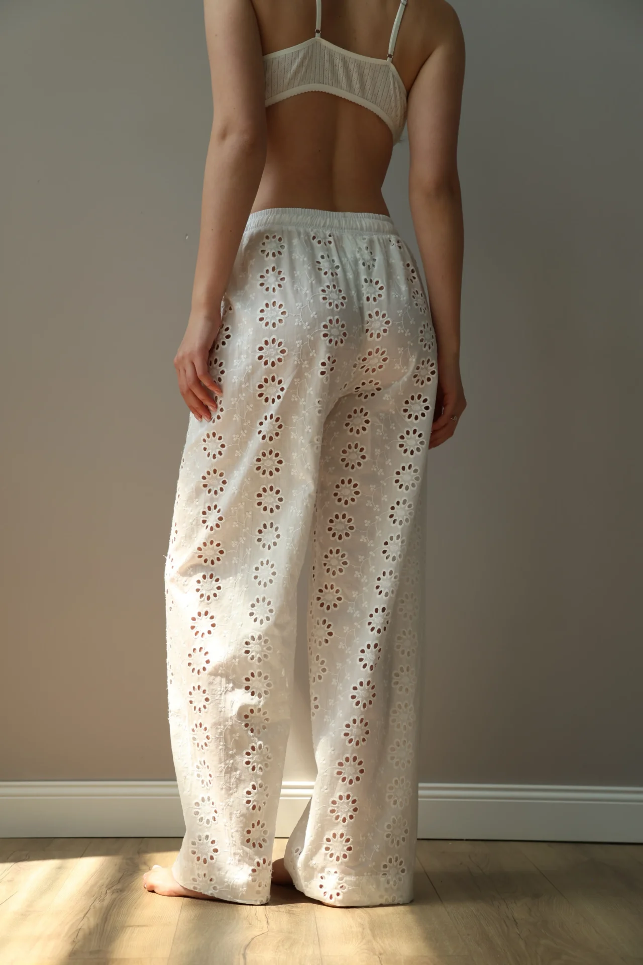 Штани Моно прошва з ажурним дизайном створюють відчуття легкості та затишку. М’яка дихаюча тканина приємна до тіла, вишукані візерунки додають образу ніжності.