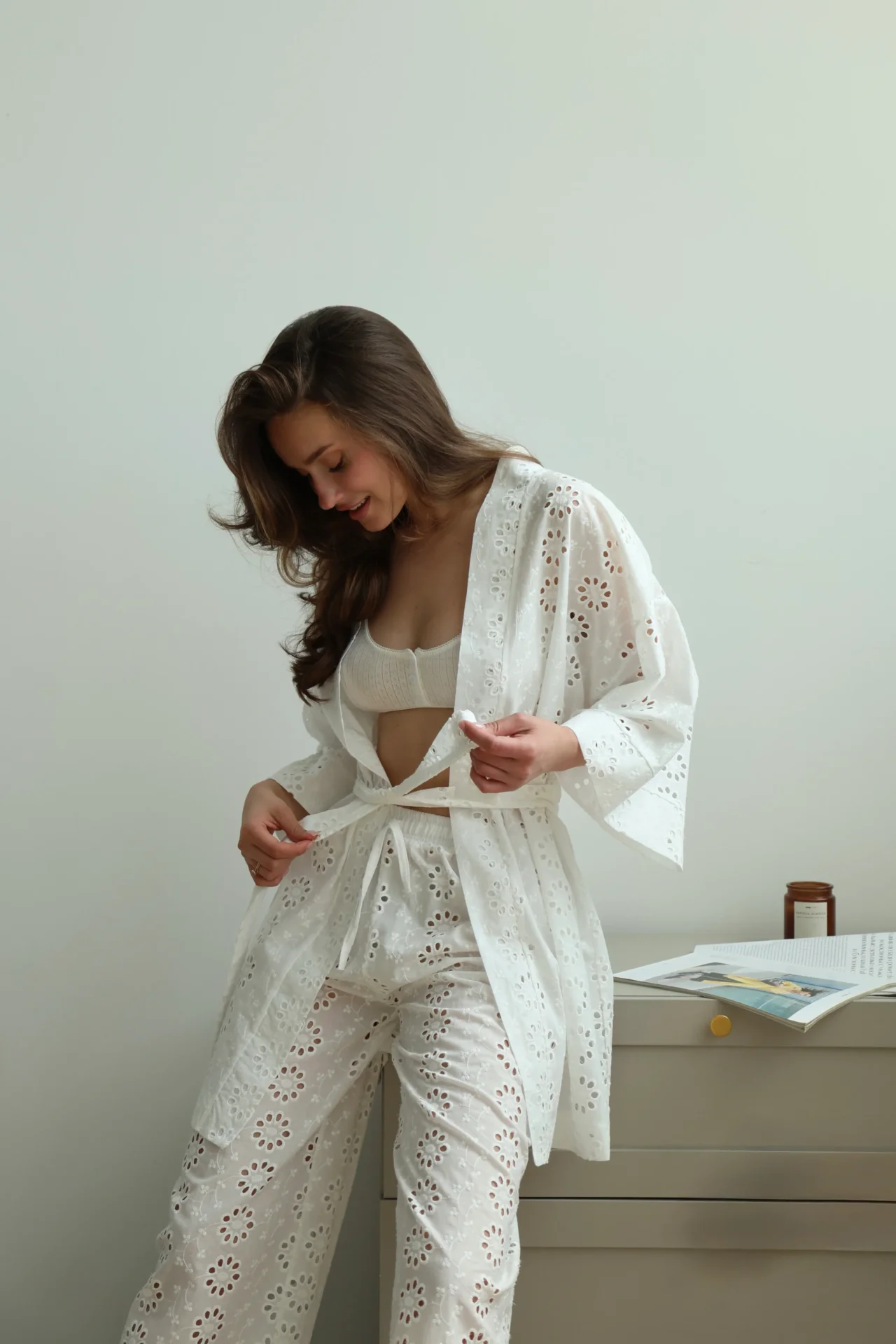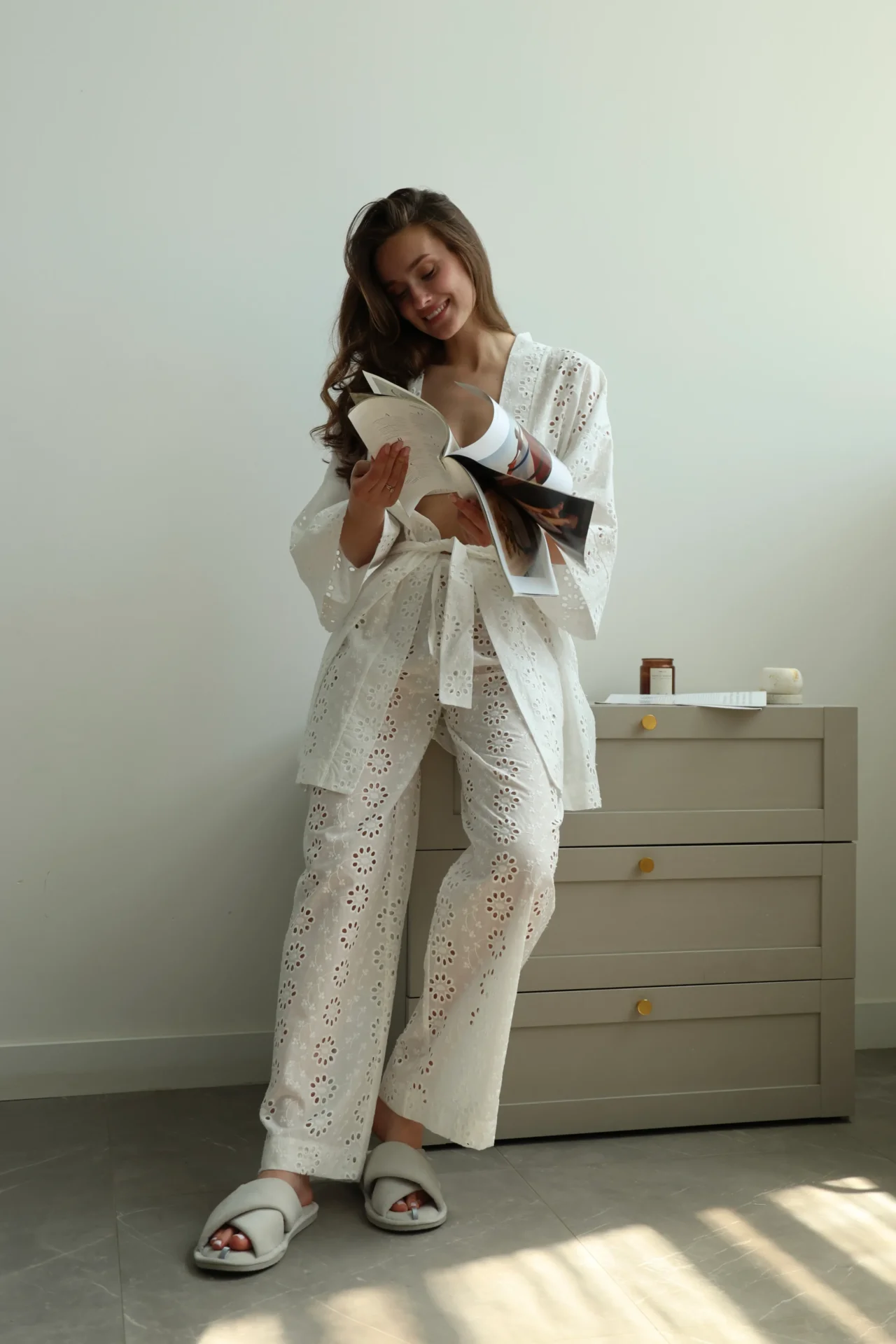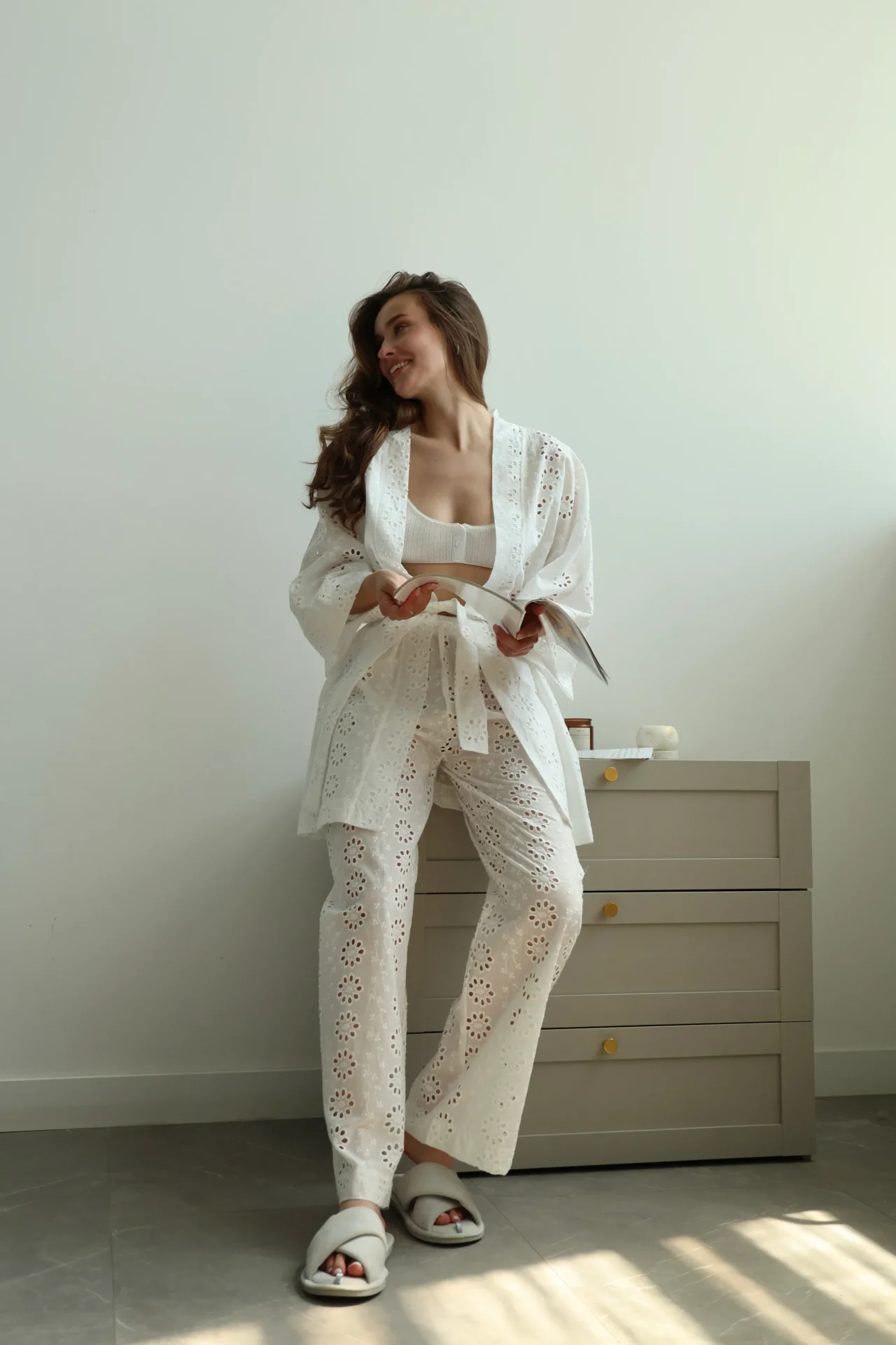 Штани Моно прошва з ажурним дизайном створюють відчуття легкості та затишку. М’яка дихаюча тканина приємна до тіла, вишукані візерунки додають образу ніжності.