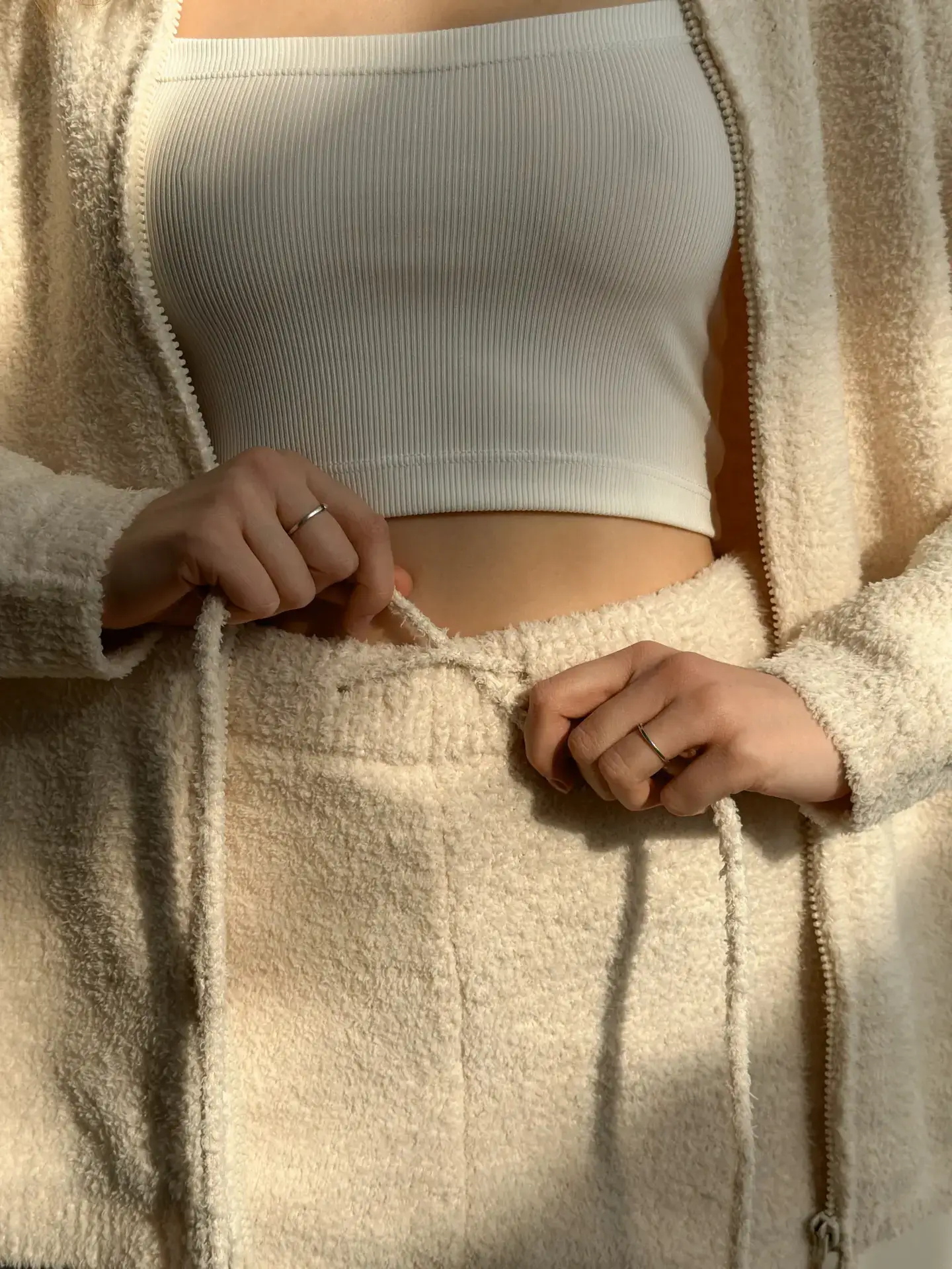 Miękki zestaw dzianinowy: szorty z wysokim stanem i bluza na zamek błyskawiczny. Przyjemny w dotyku materiał zapewnia komfort i wygodę. Idealny do domowego wypoczynku lub stylowych stylizacji.