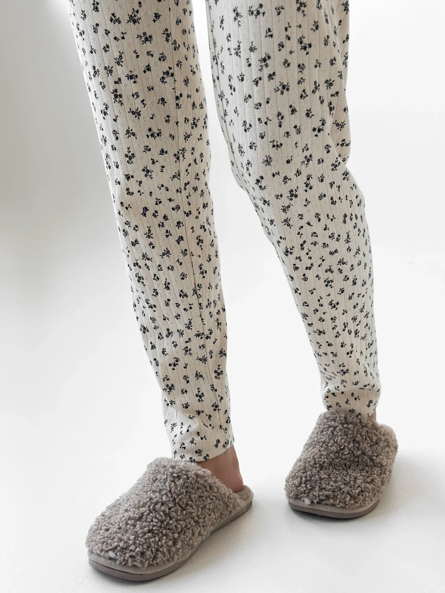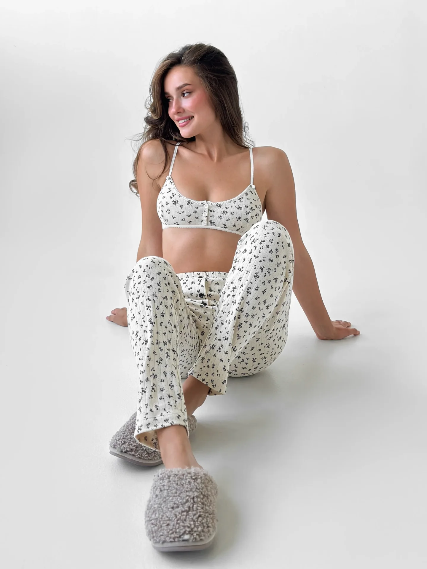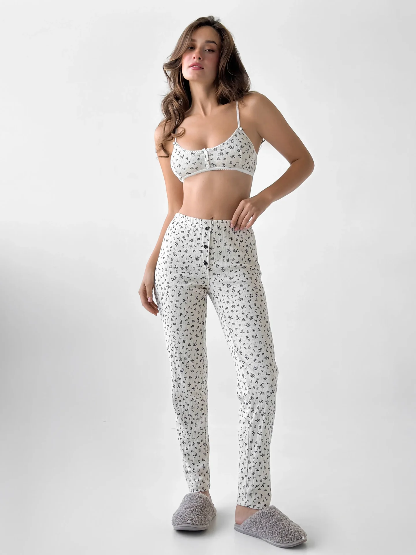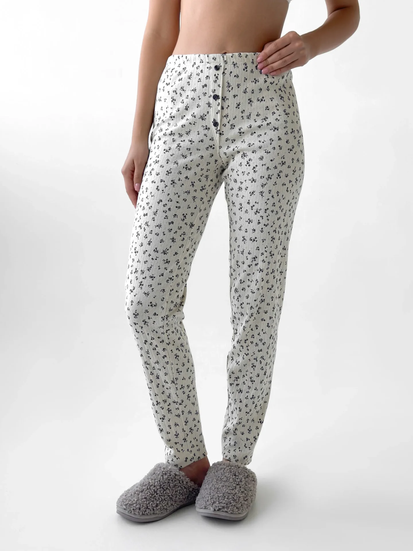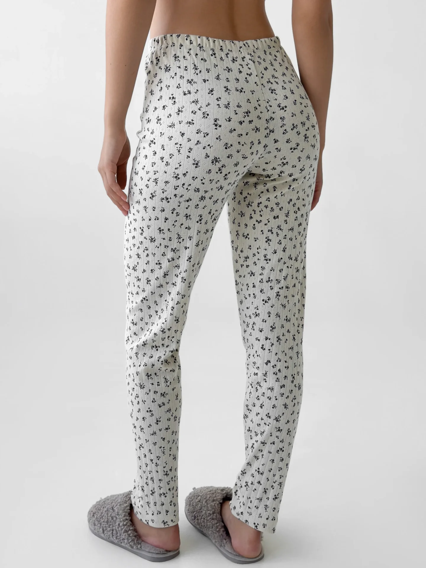 Spodnie joggery z ribany prążkowanej, mleczne w granatowe kwiatki - Miso