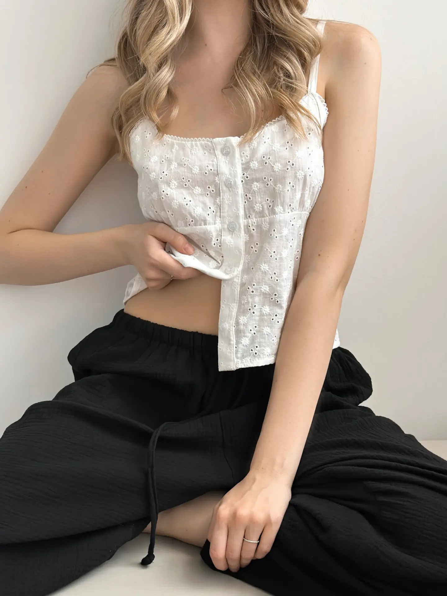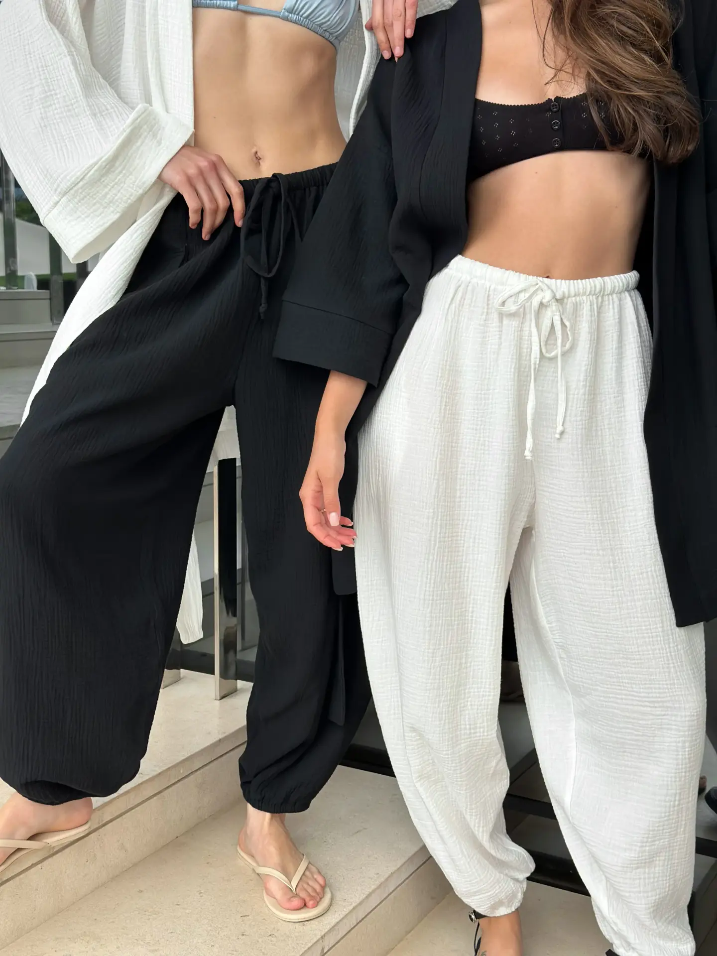 Spodnie Mono – szarawary z dwuwarstwowej muślinowej tkaniny stworzone zostały z myślą o maksymalnym komforcie w ciepłe dni. Lekki, naturalny materiał jest przyjemny dla ciała i dobrze przepuszcza powietrze. Luźny krój nie ogranicza ruchów i nadaje sylwetce swobodny charakter. To idealna propozycja na co dzień, do wypoczynku i podróży.