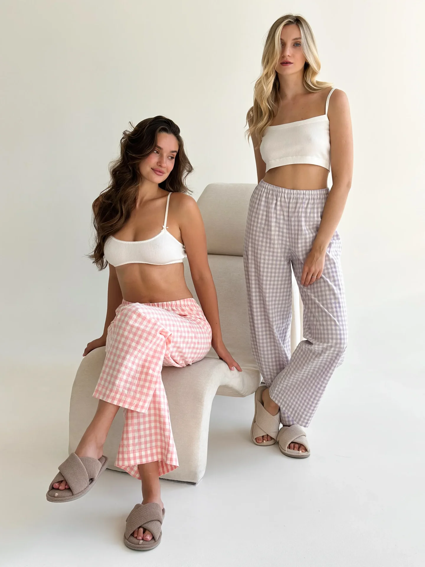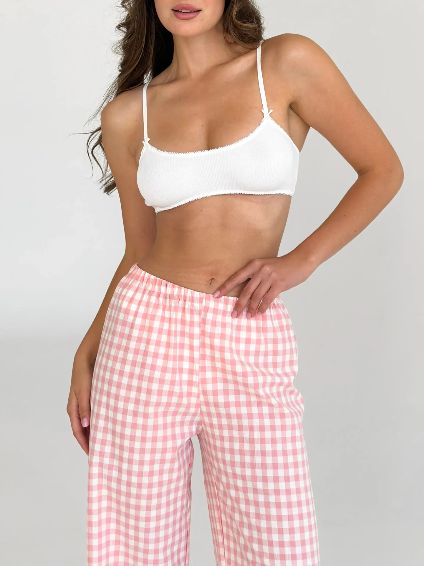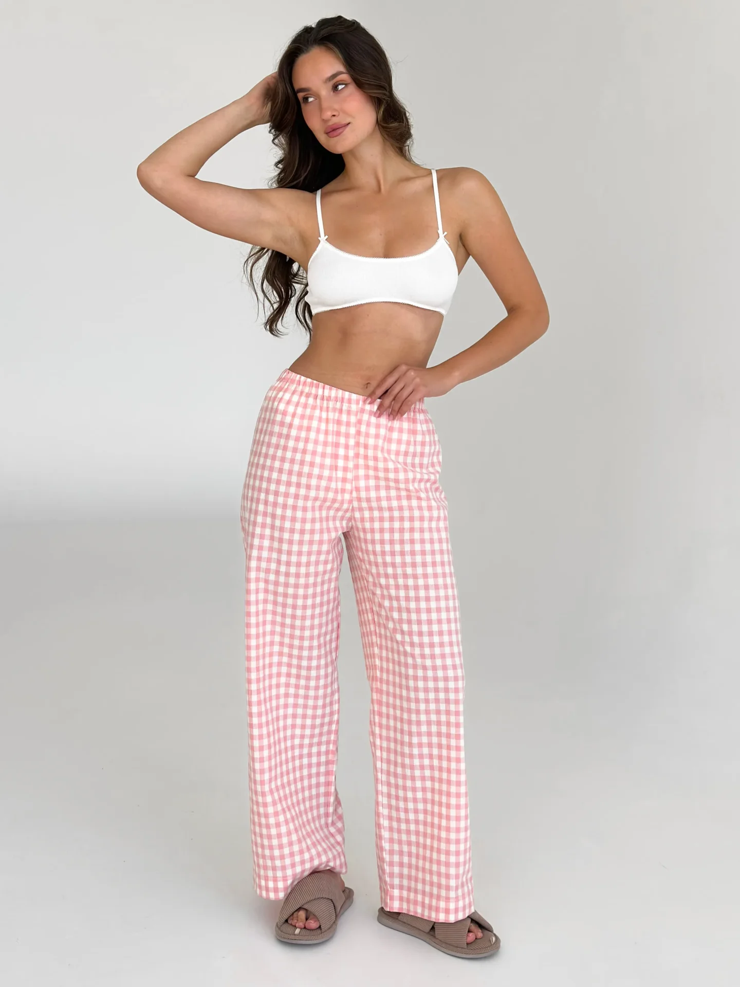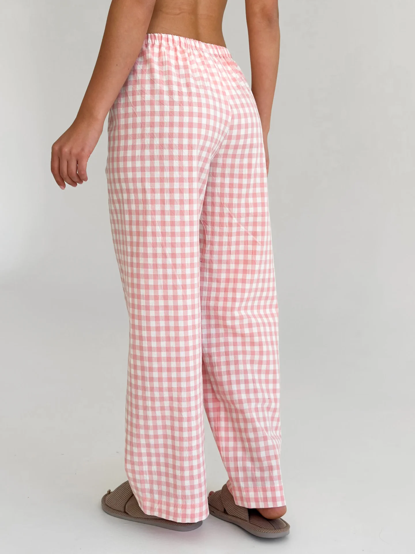 Spodnie Mono z bawełny pranej, mleczne w różową kratkę