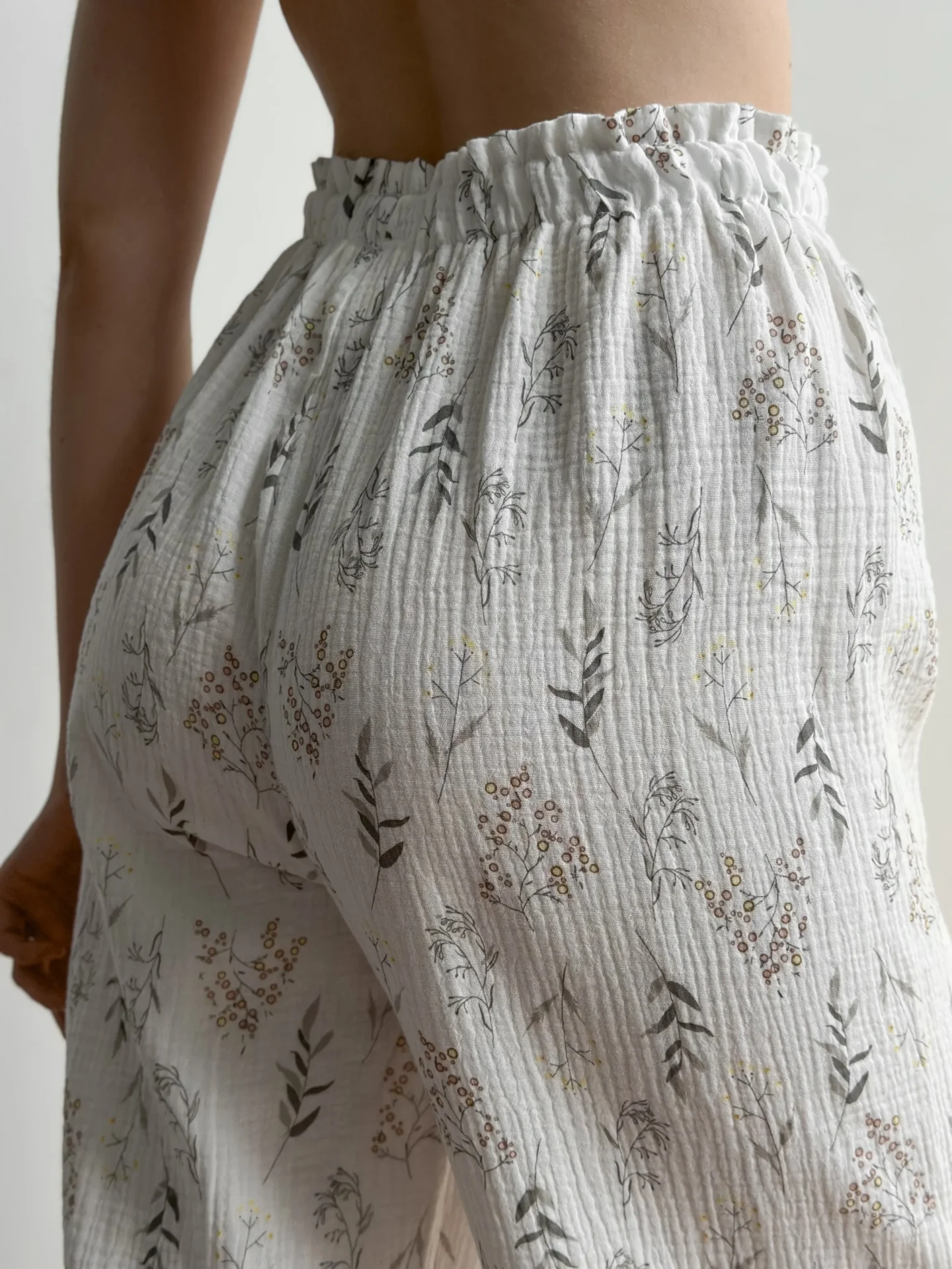 Spodnie Mono z muślinu, białe w polne kwiaty - Miso