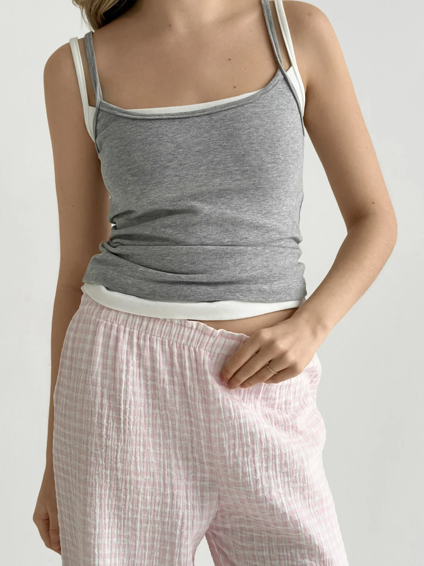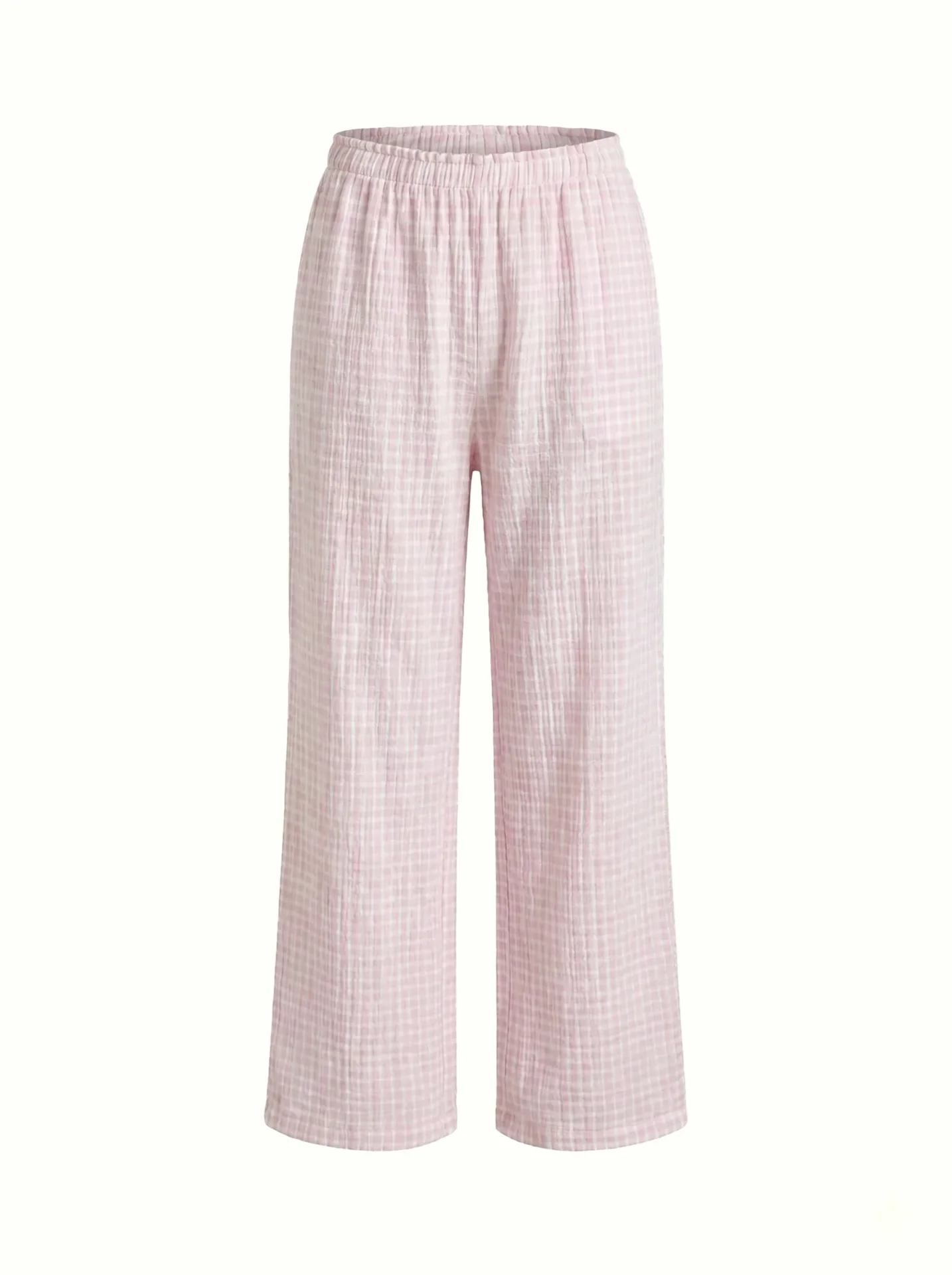 Spodnie Mono z muślinu dwuwarstwowego, mleczne w różową kratkę