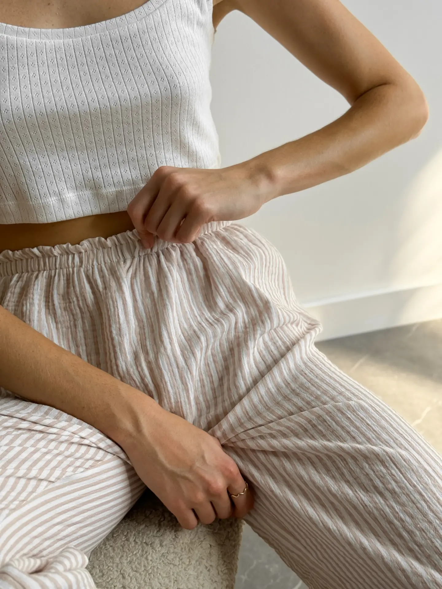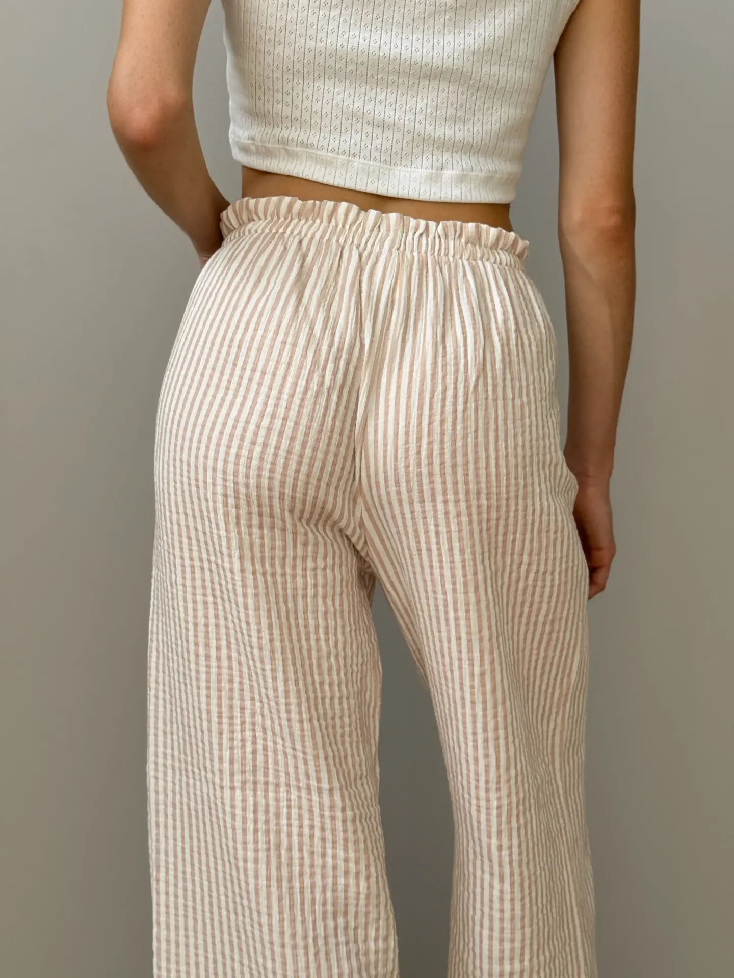 Spodnie Mono z muślinu, w beżowe paski