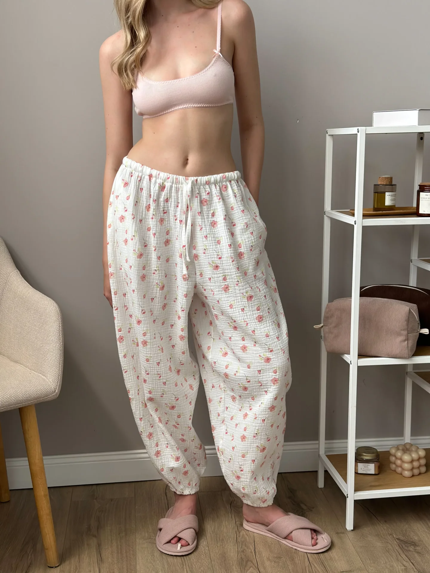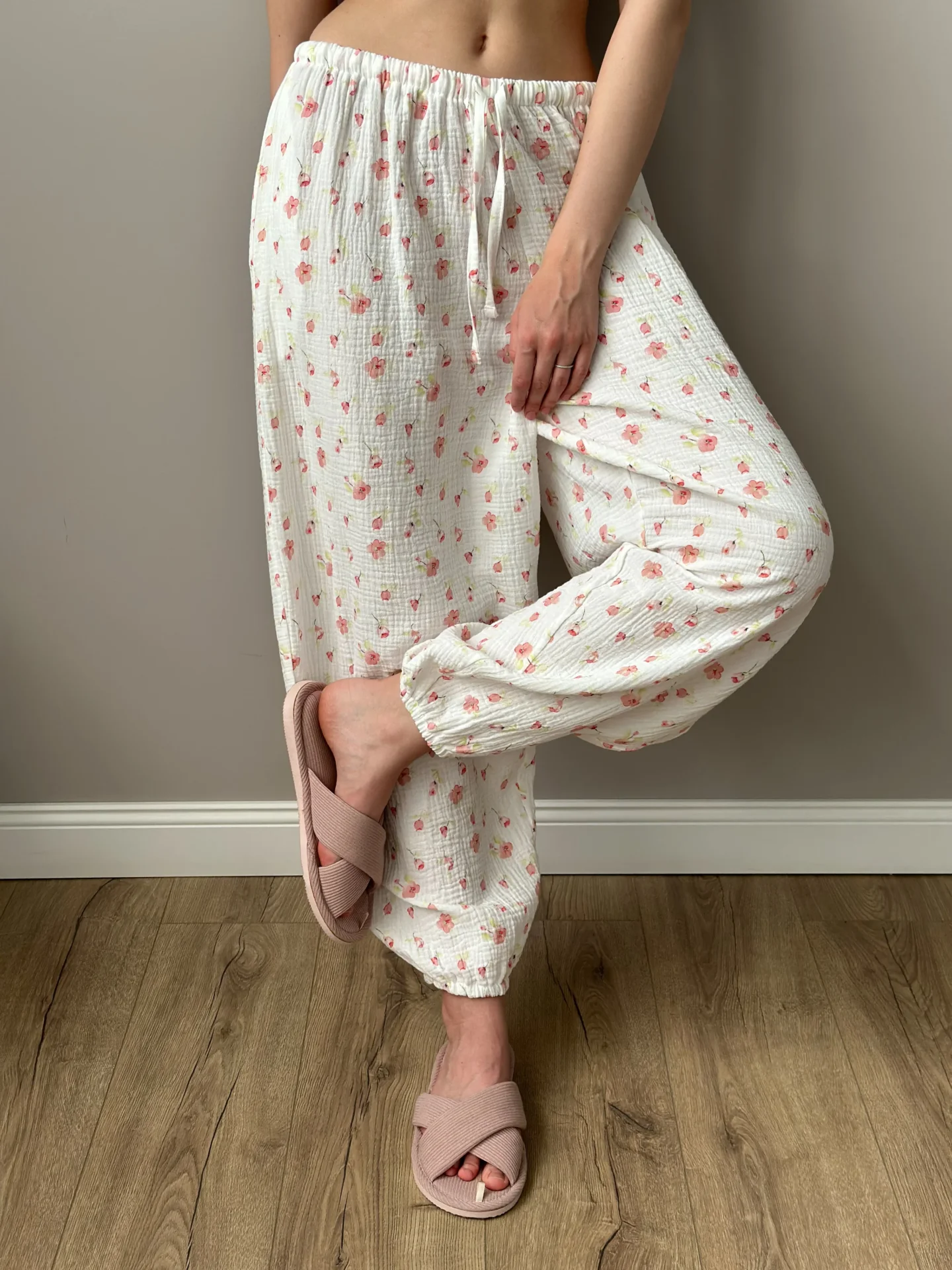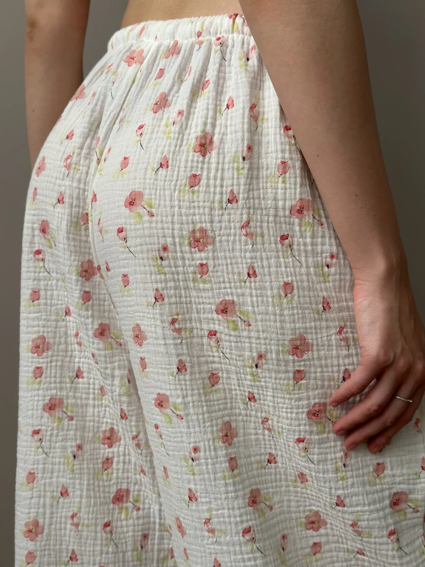 Spodnie szarawary z muślinu dwuwarstwowego, białe w akwarelowe wzory