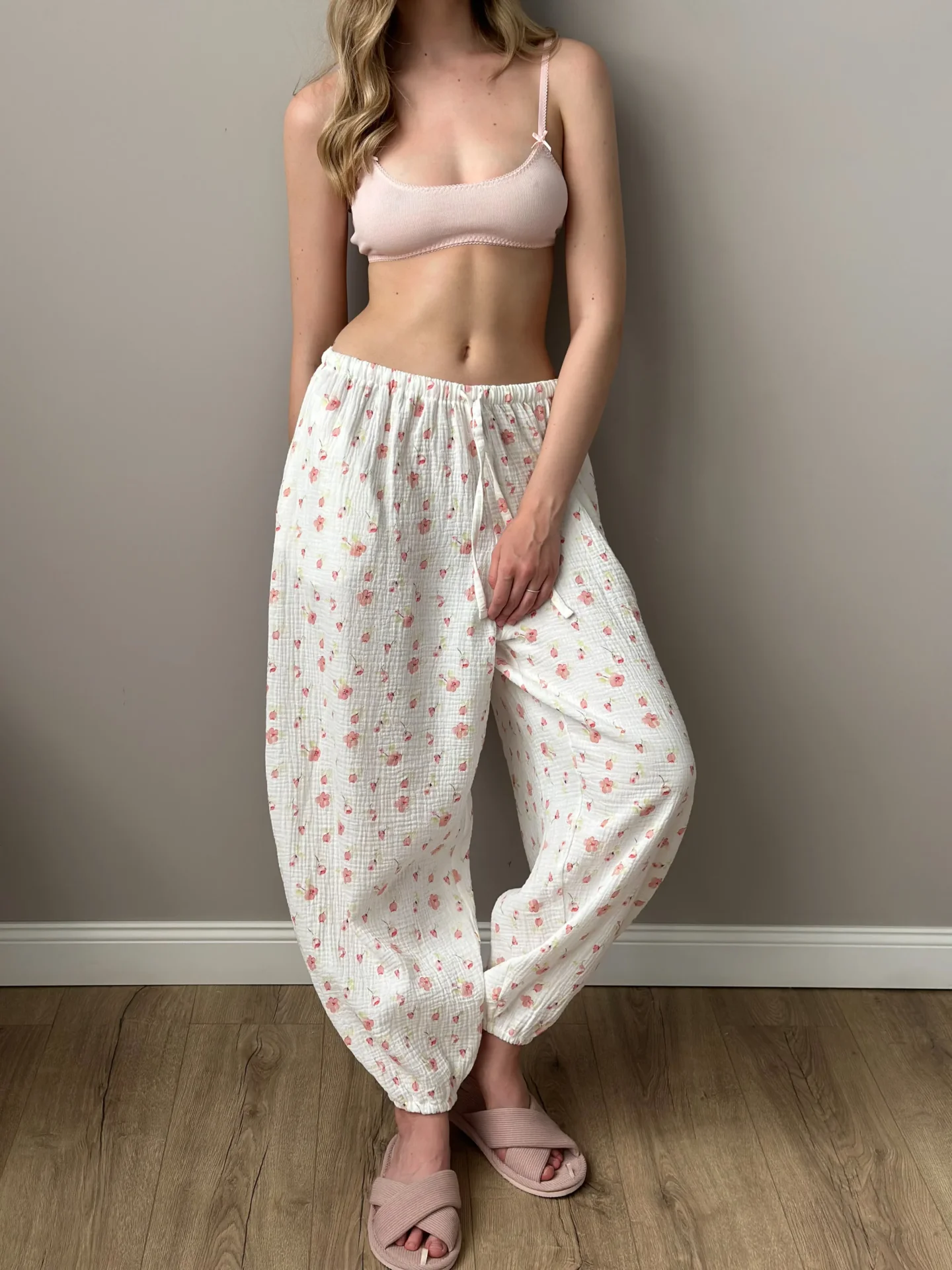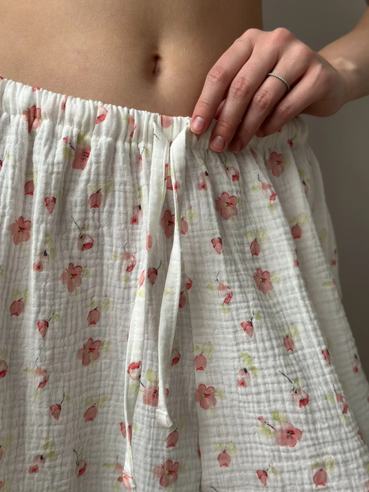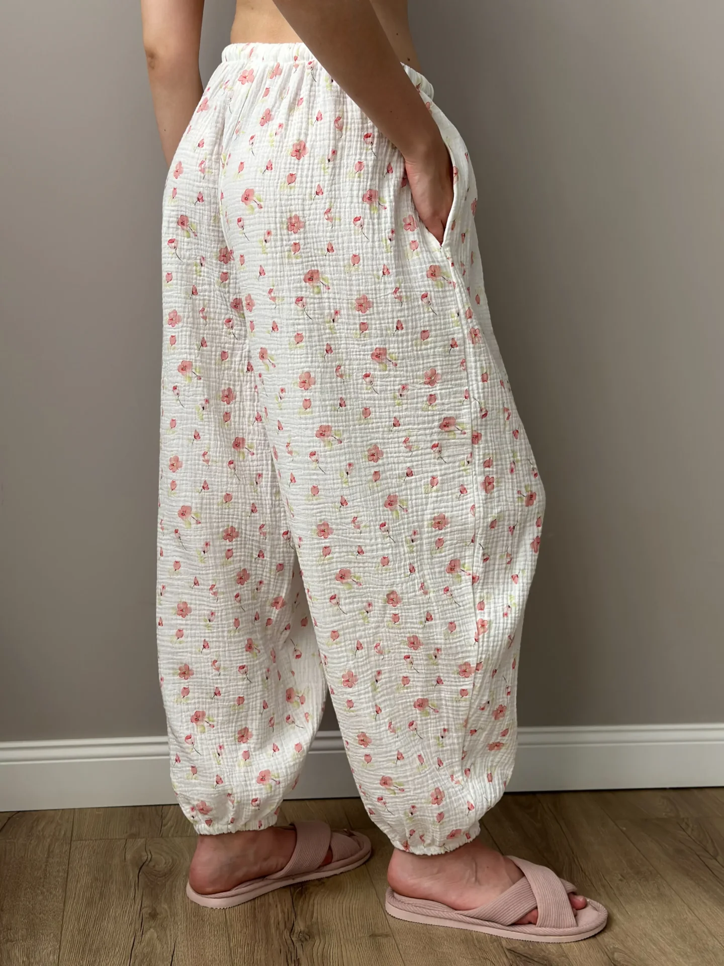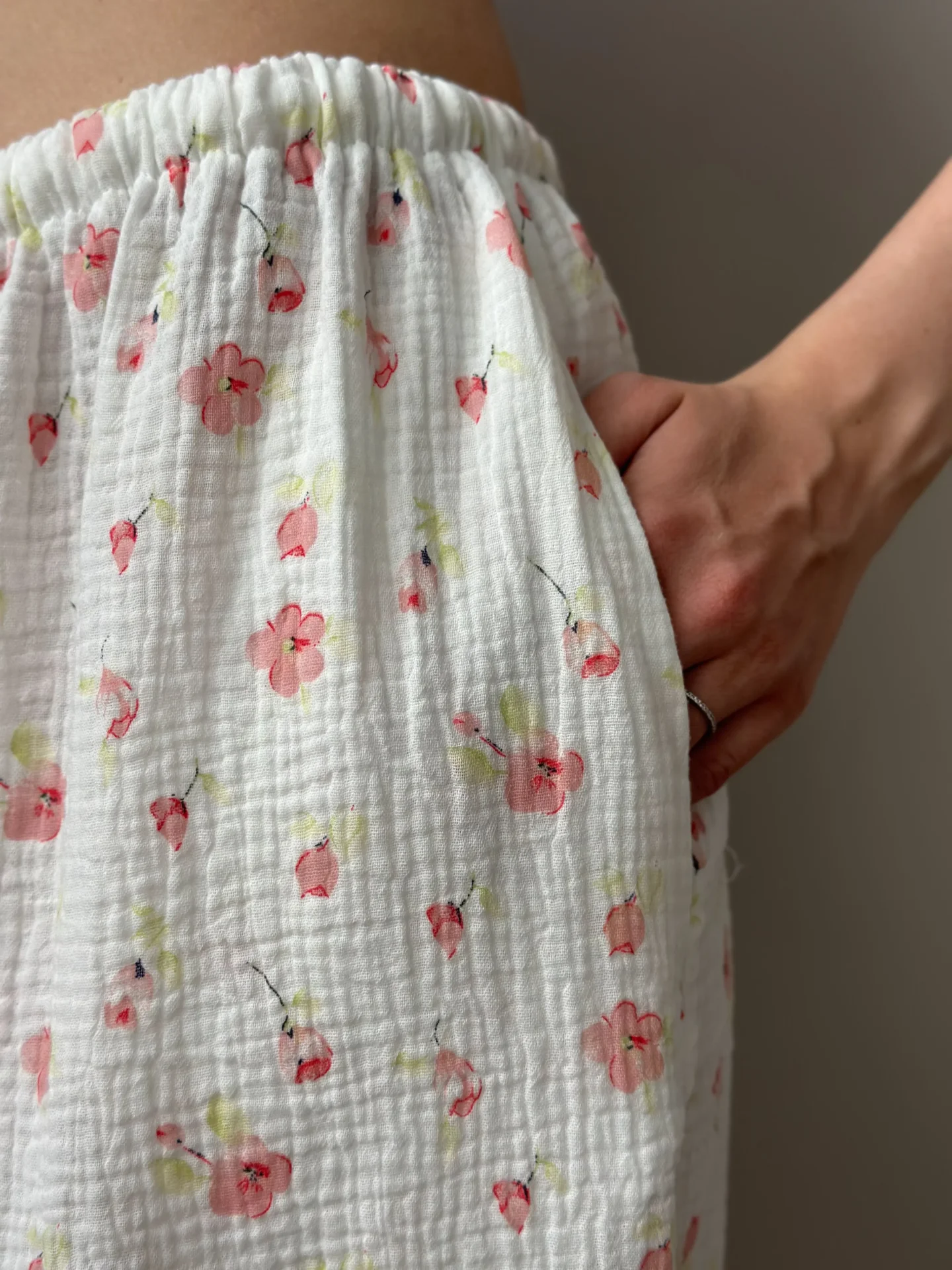 Spodnie szarawary z muślinu dwuwarstwowego, białe w akwarelowe wzory
