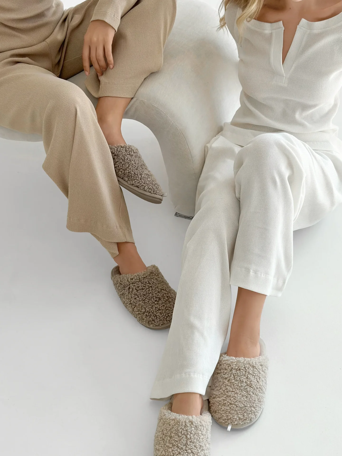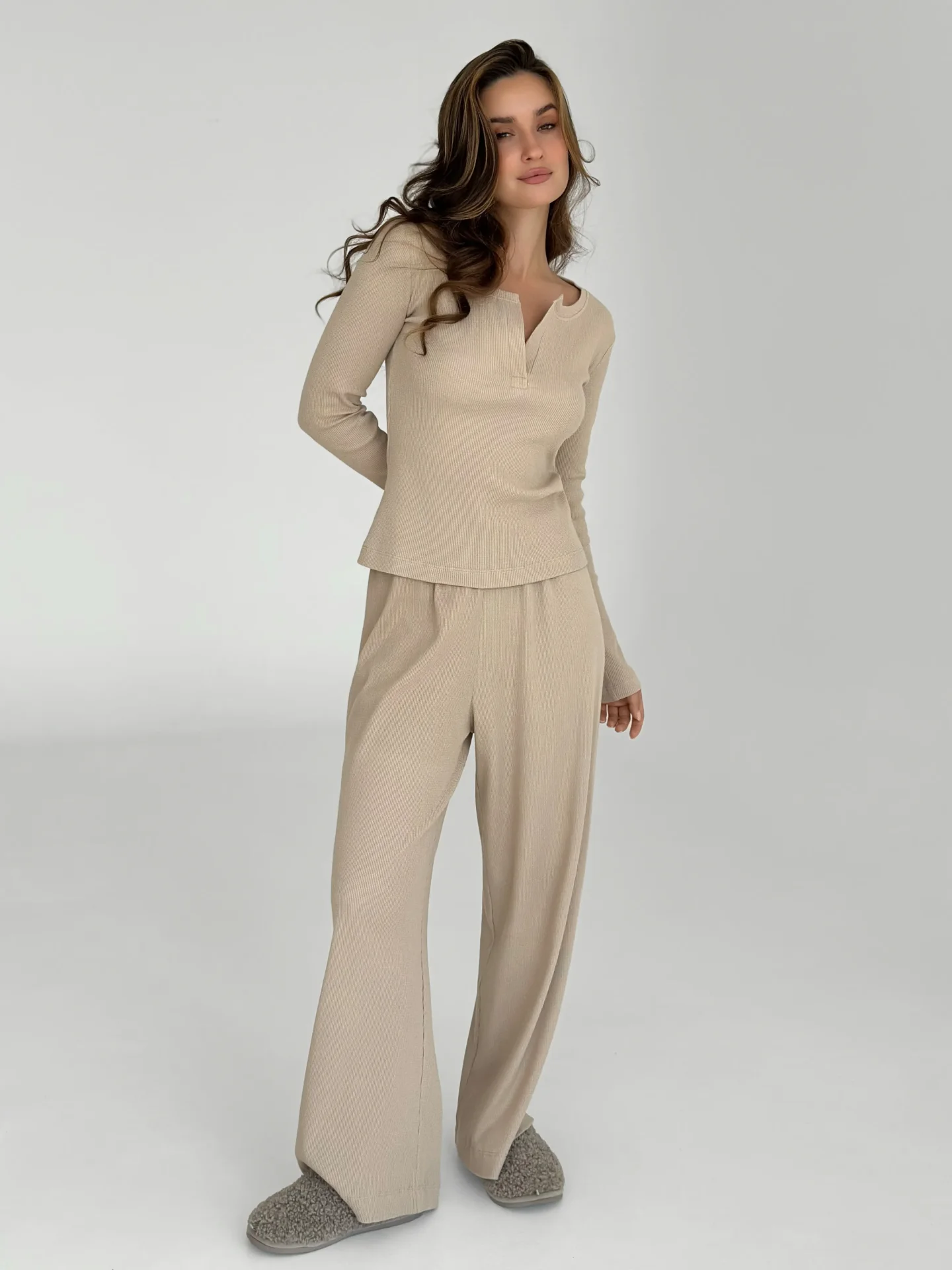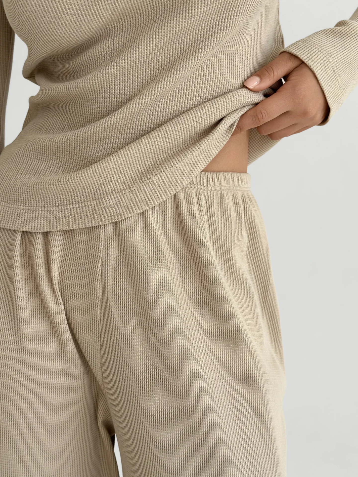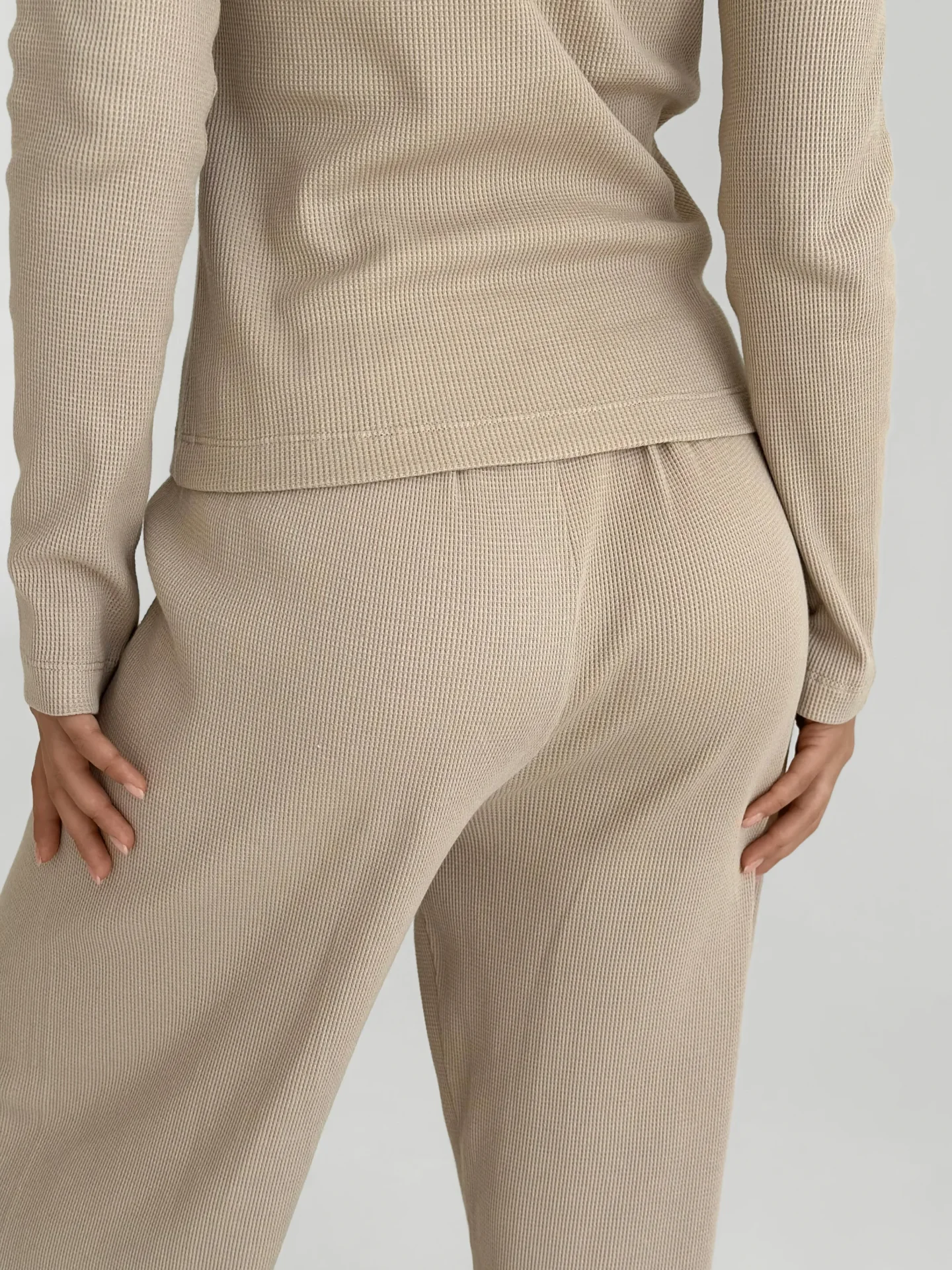 Spodnie szerokie z dzianiny waflowej, beżowe - Miso