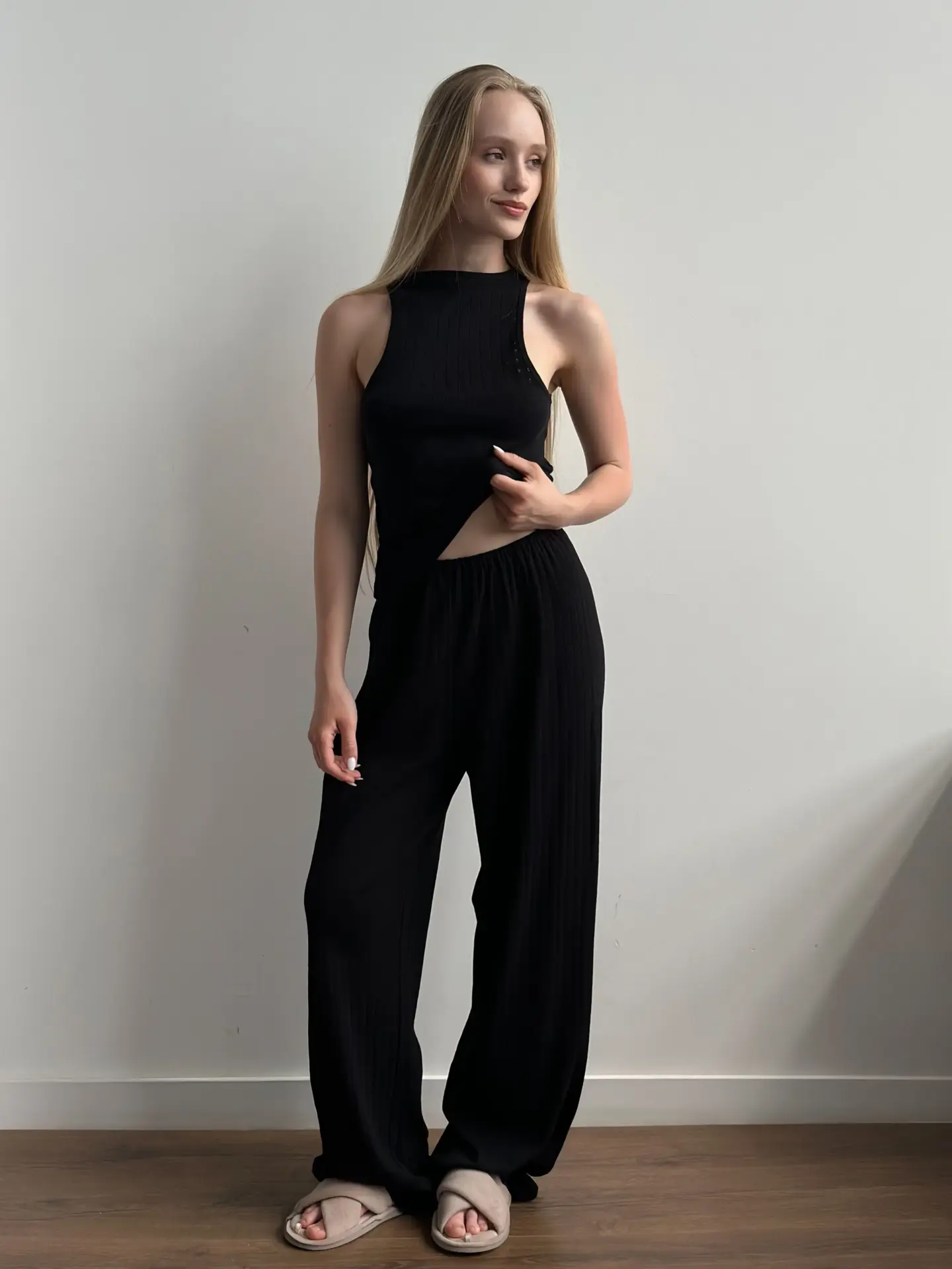 Wygodne i stylowe szerokie spodnie z ribany. Miękki, oddychający materiał zapewnia wygodę noszenia. Idealne zarówno do domu, jak i do komfortowego snu.
