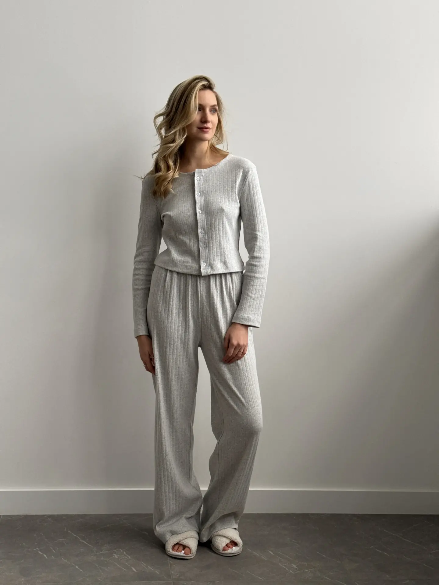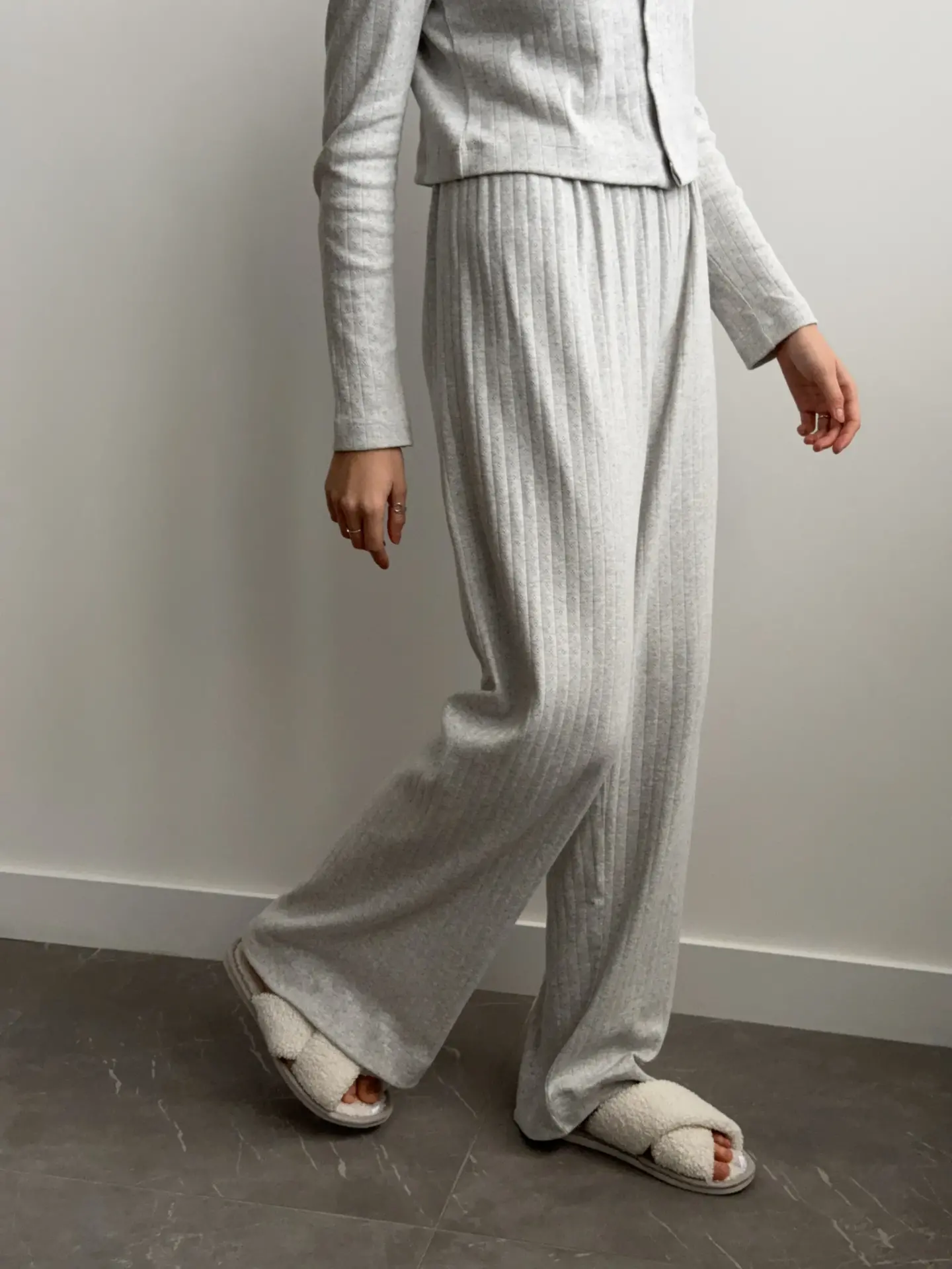 Wygodne i stylowe szerokie spodnie z ribany. Miękki, oddychający materiał zapewnia wygodę noszenia. Idealne zarówno do domu, jak i do komfortowego snu.