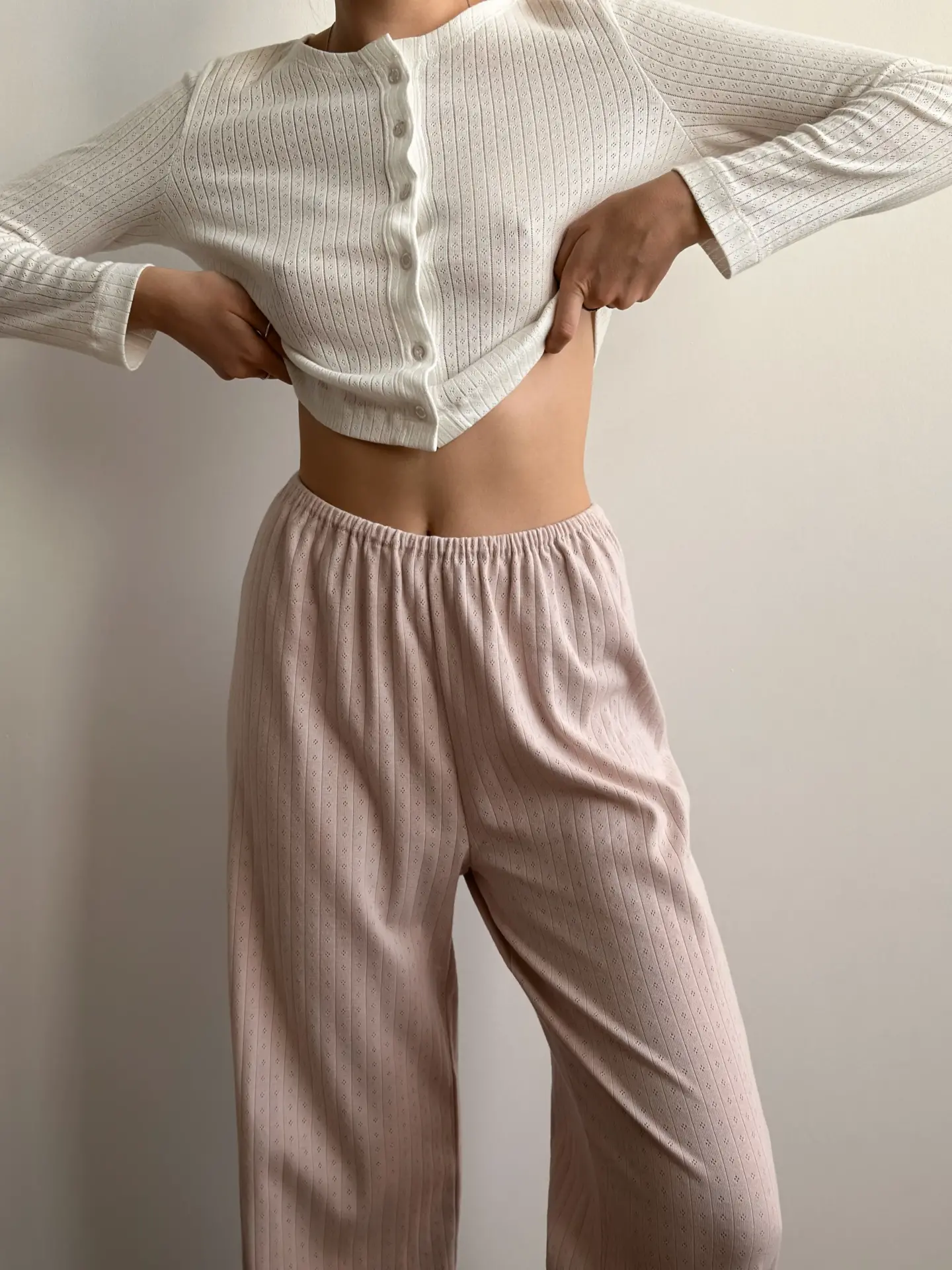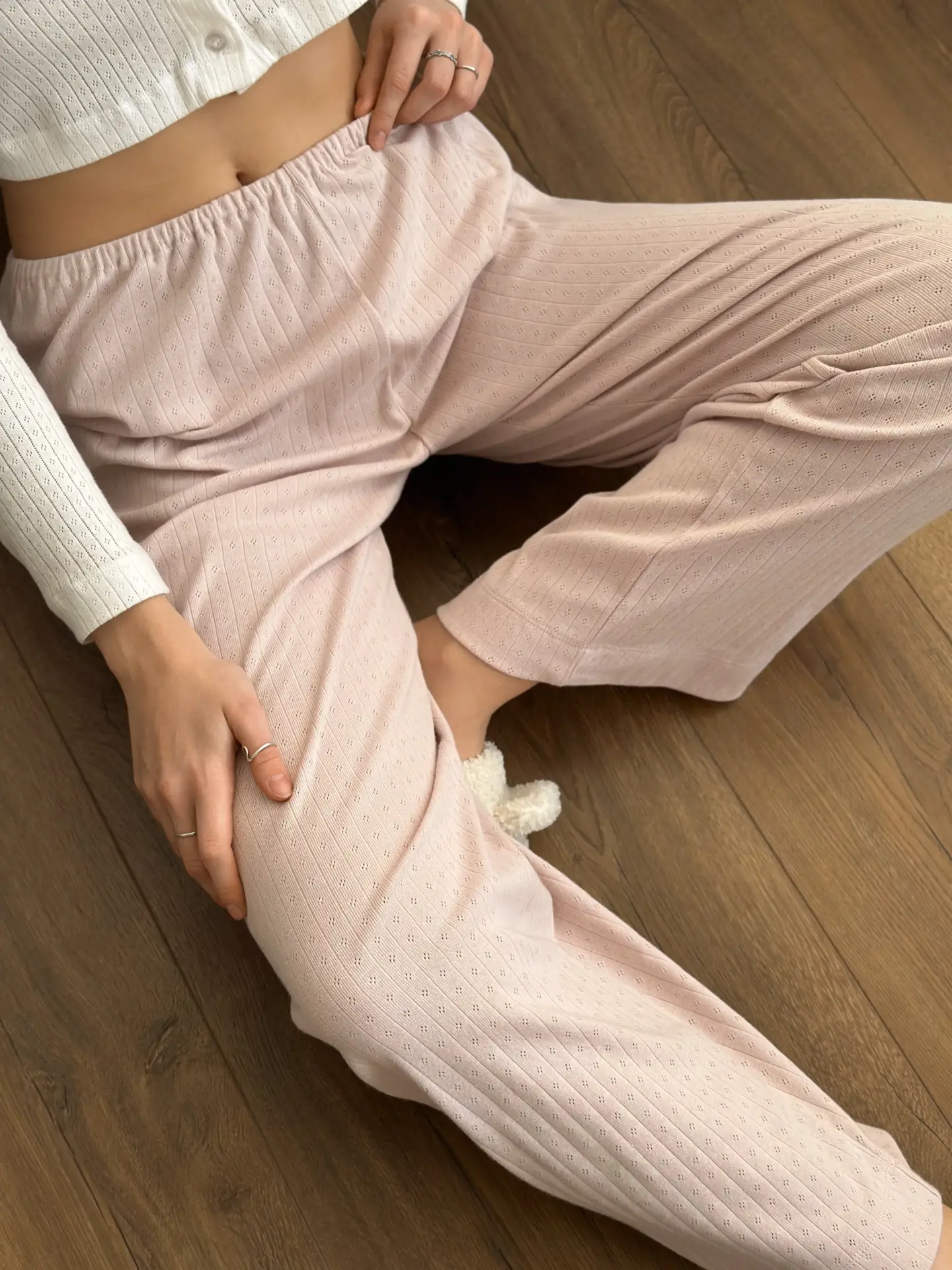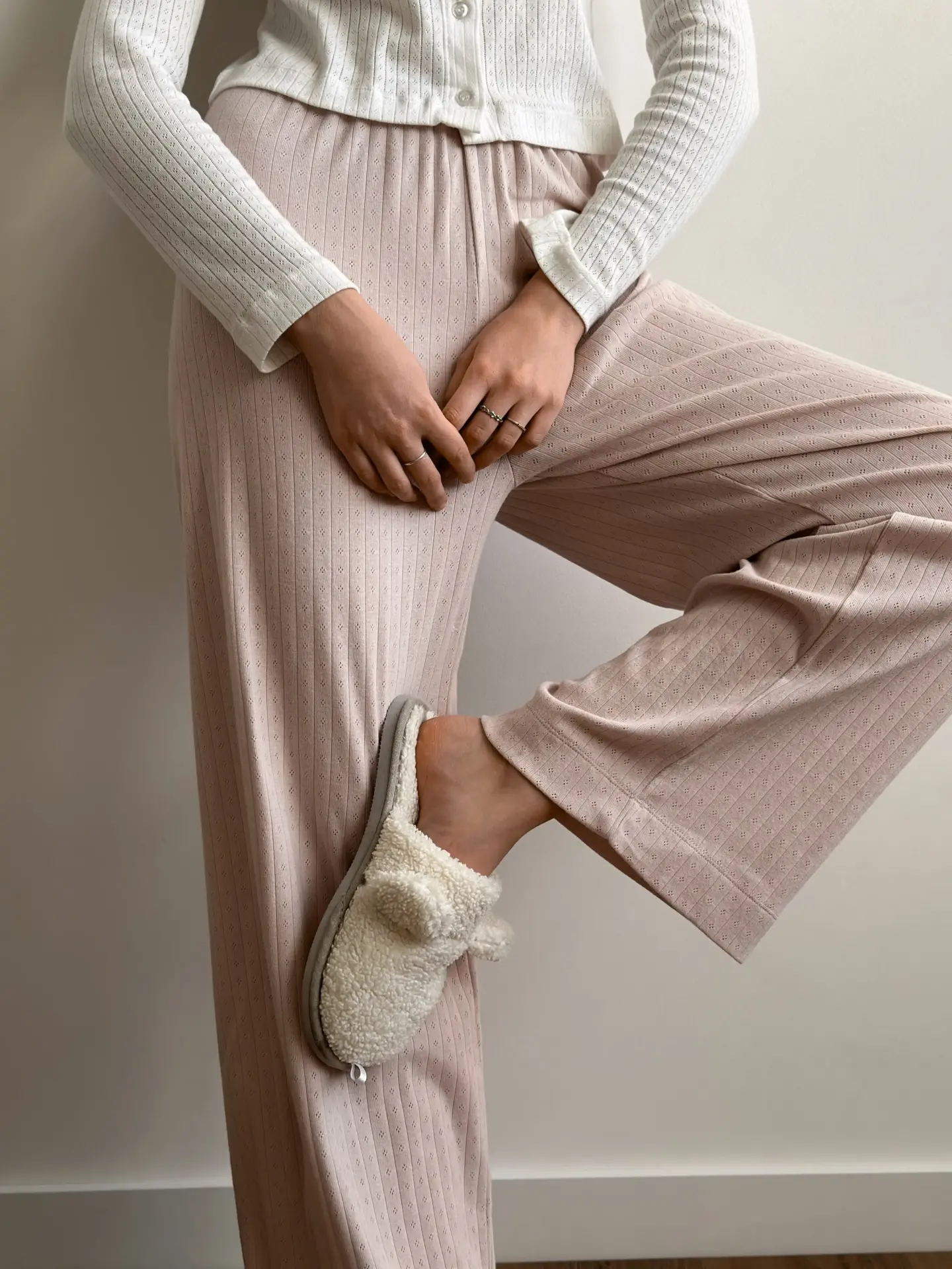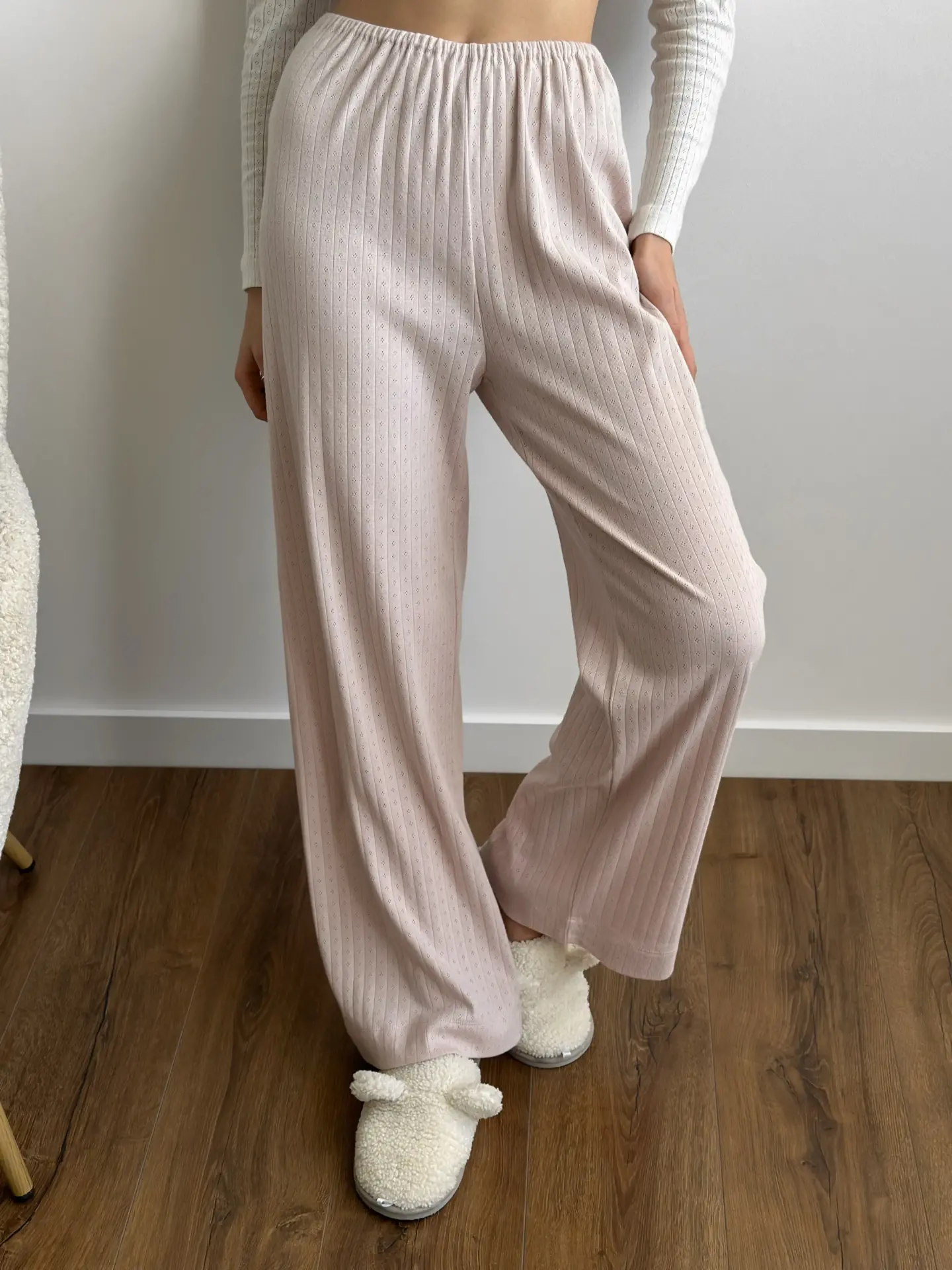 Wygodne i stylowe szerokie spodnie z ribany. Miękki, oddychający materiał zapewnia wygodę noszenia. Idealne zarówno do domu, jak i do komfortowego snu.