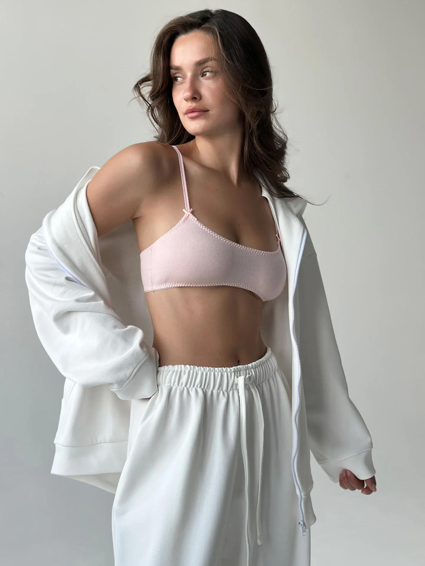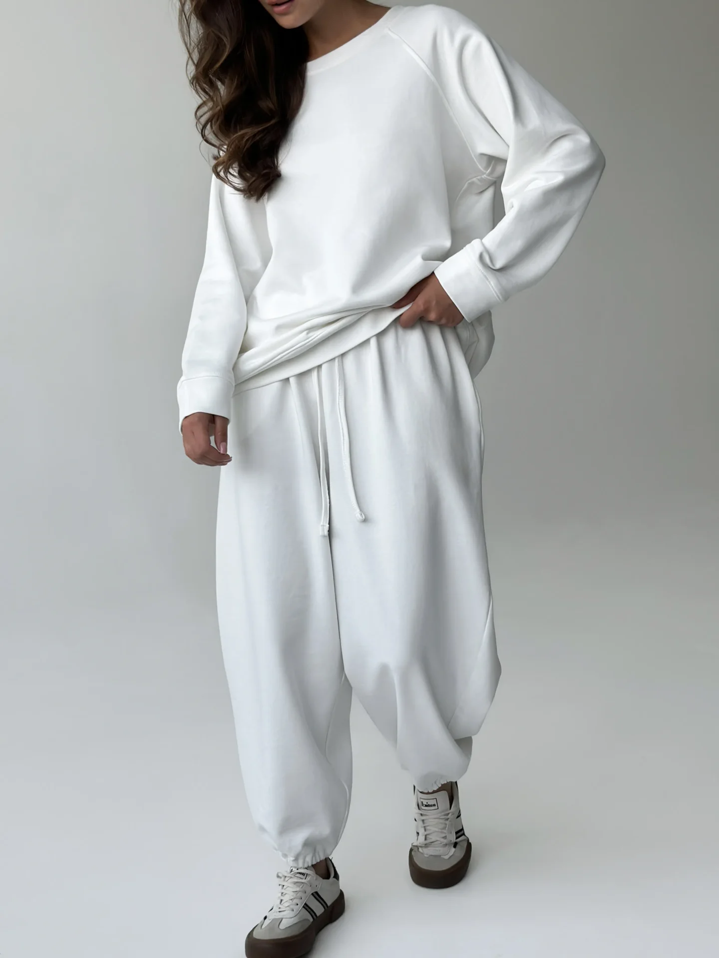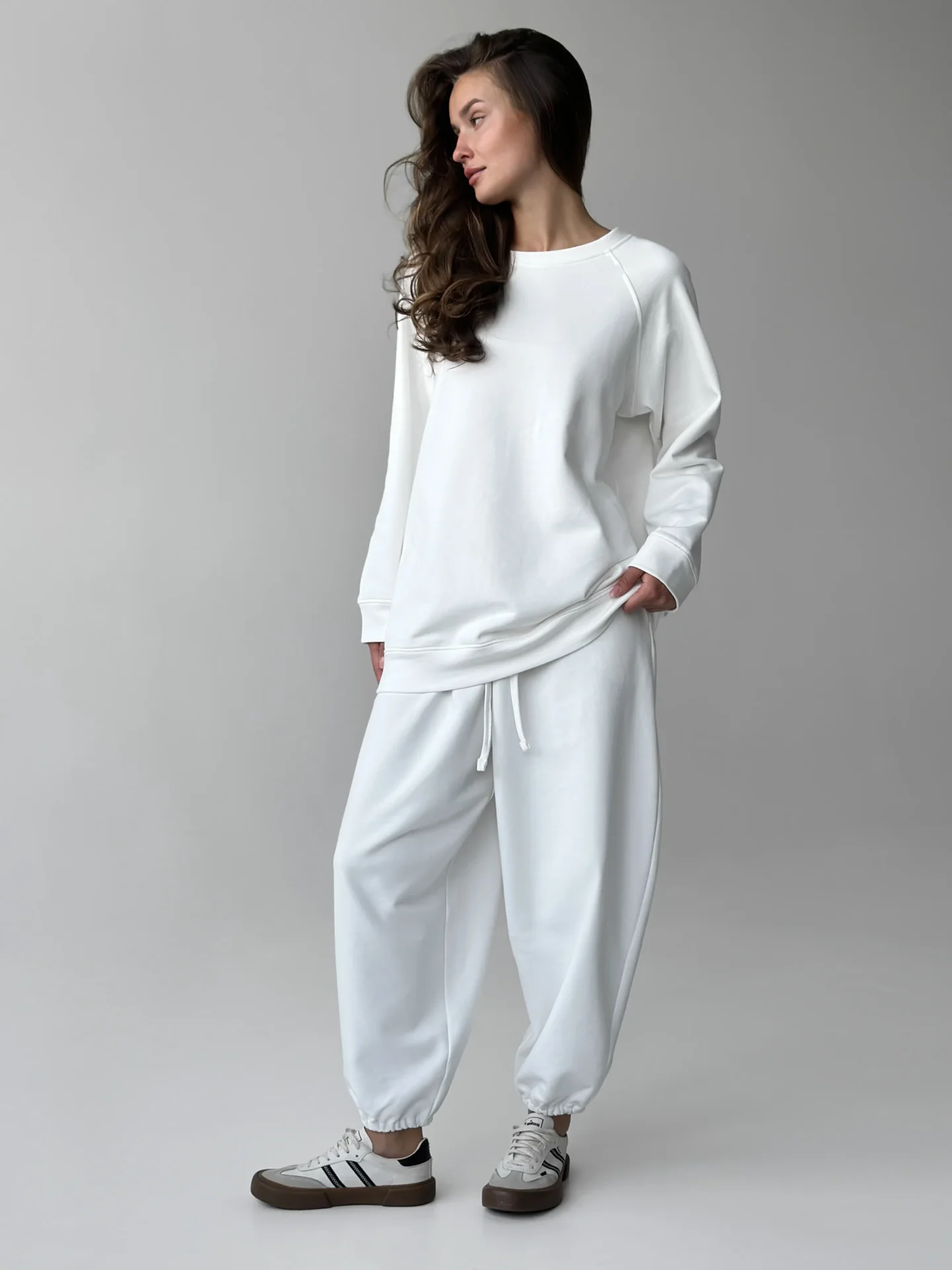 Spodnie z bawełnianej dzianiny na bazie miękkiej 3-nitki. Komfortowe, ciepłe i przyjemne dla skóry — idealne na co dzień i na spacery. Uniwersalny wybór na chłodniejsze dni.