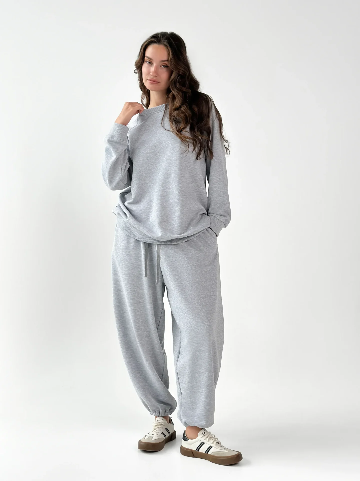 Spodnie z bawełnianej dzianiny na bazie miękkiej 3-nitki. Komfortowe, ciepłe i przyjemne dla skóry — idealne na co dzień i na spacery. Uniwersalny wybór na chłodniejsze dni.