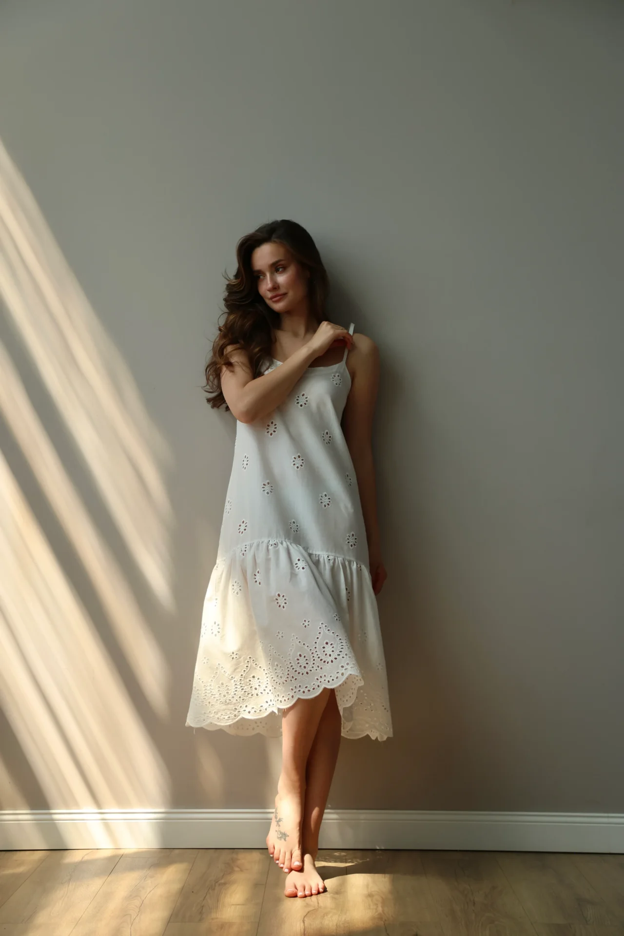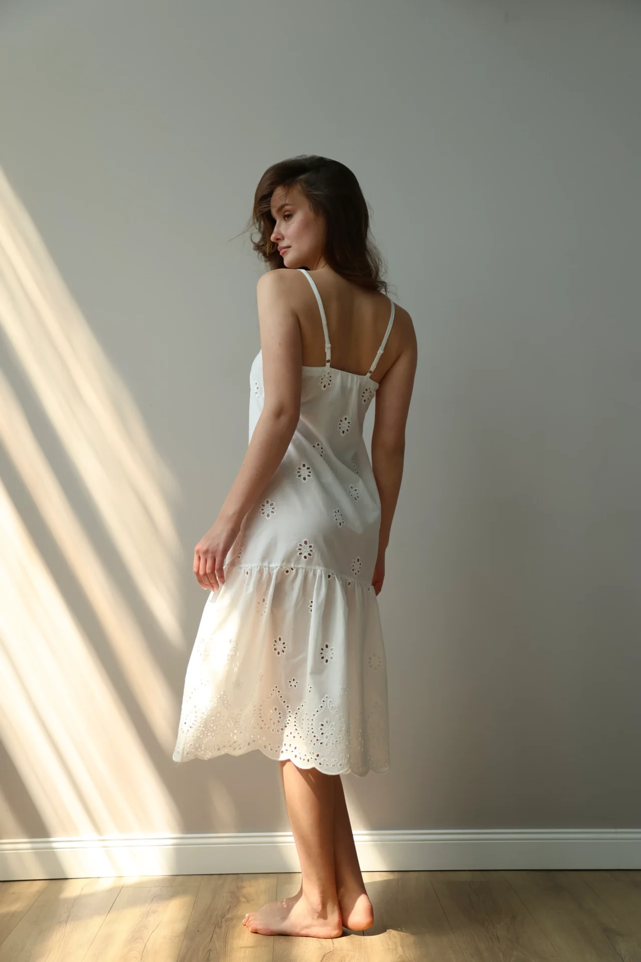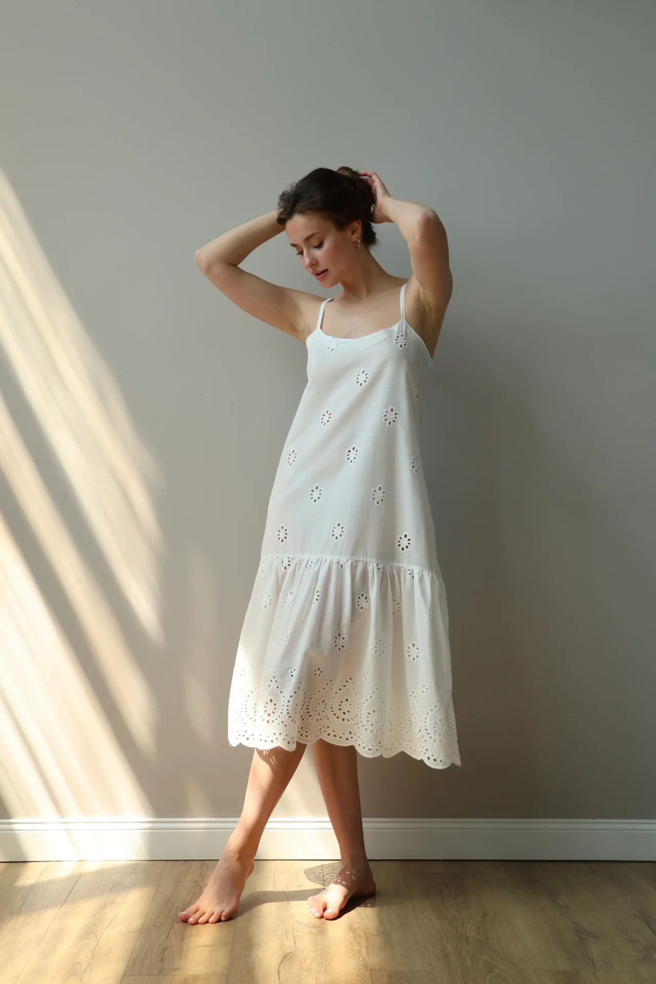 Sukienka na ramiączkach z haftowanej tkaniny z ażurowym wzorem tworzy lekki i romantyczny wygląd. Miękki, naturalny materiał jest przyjemny w dotyku i dobrze oddycha. Odpowiednia do domu, na relaks lub letnie spacery.