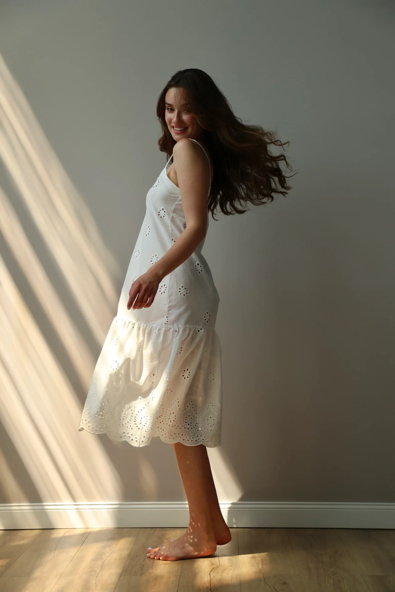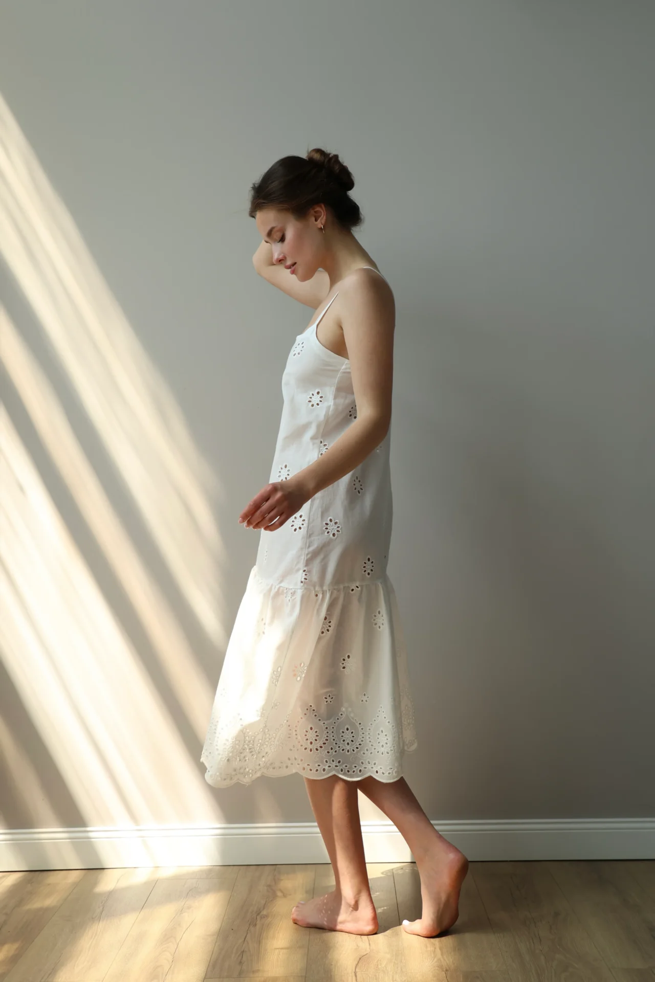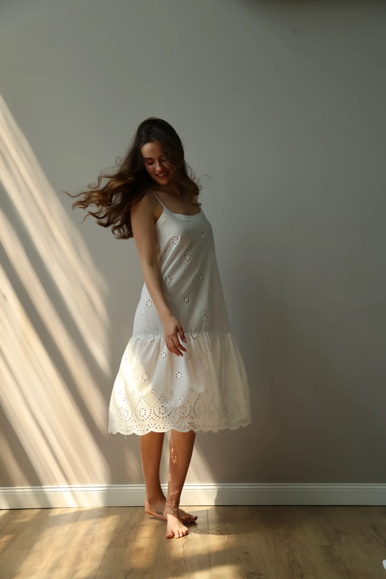 Sukienka na ramiączkach z haftowanej tkaniny z ażurowym wzorem tworzy lekki i romantyczny wygląd. Miękki, naturalny materiał jest przyjemny w dotyku i dobrze oddycha. Odpowiednia do domu, na relaks lub letnie spacery.
