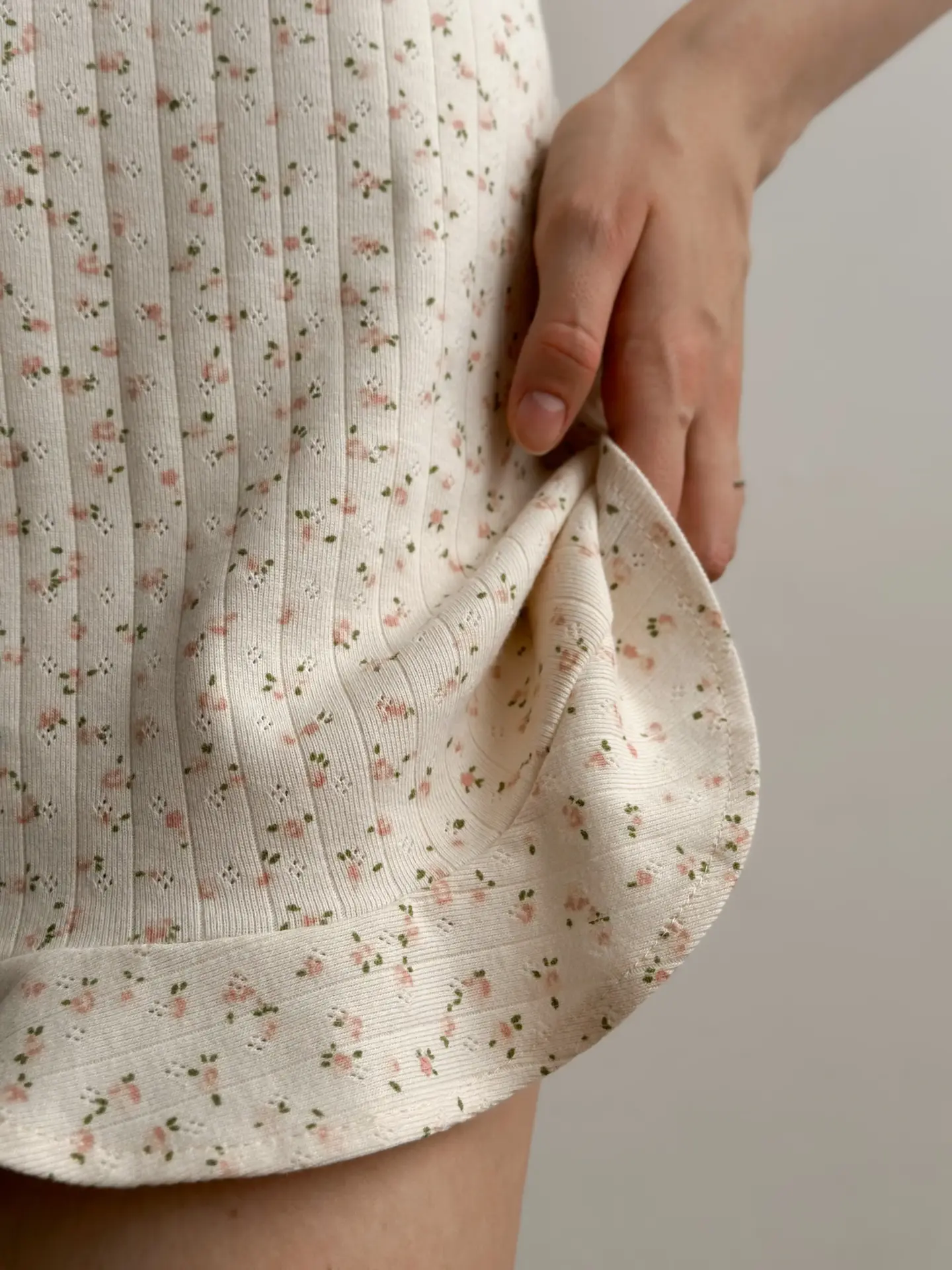 Sukienka nocna kopertowa z ribany prążkowanej, kremowa w różowe kwiatki