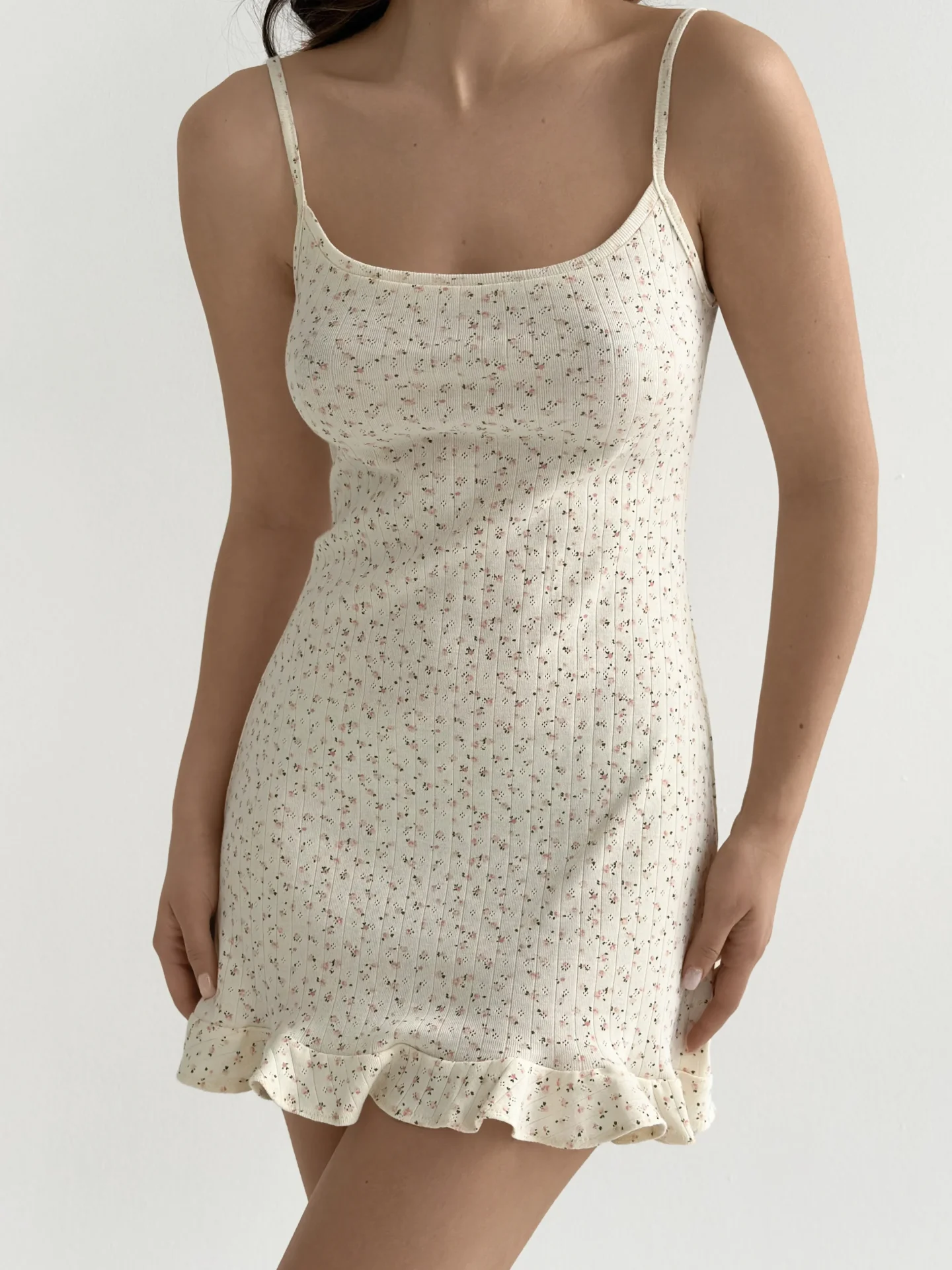 Sukienka nocna z falbankami, z ribany prążkowanej, kremowa w różowe kwiatki - Miso