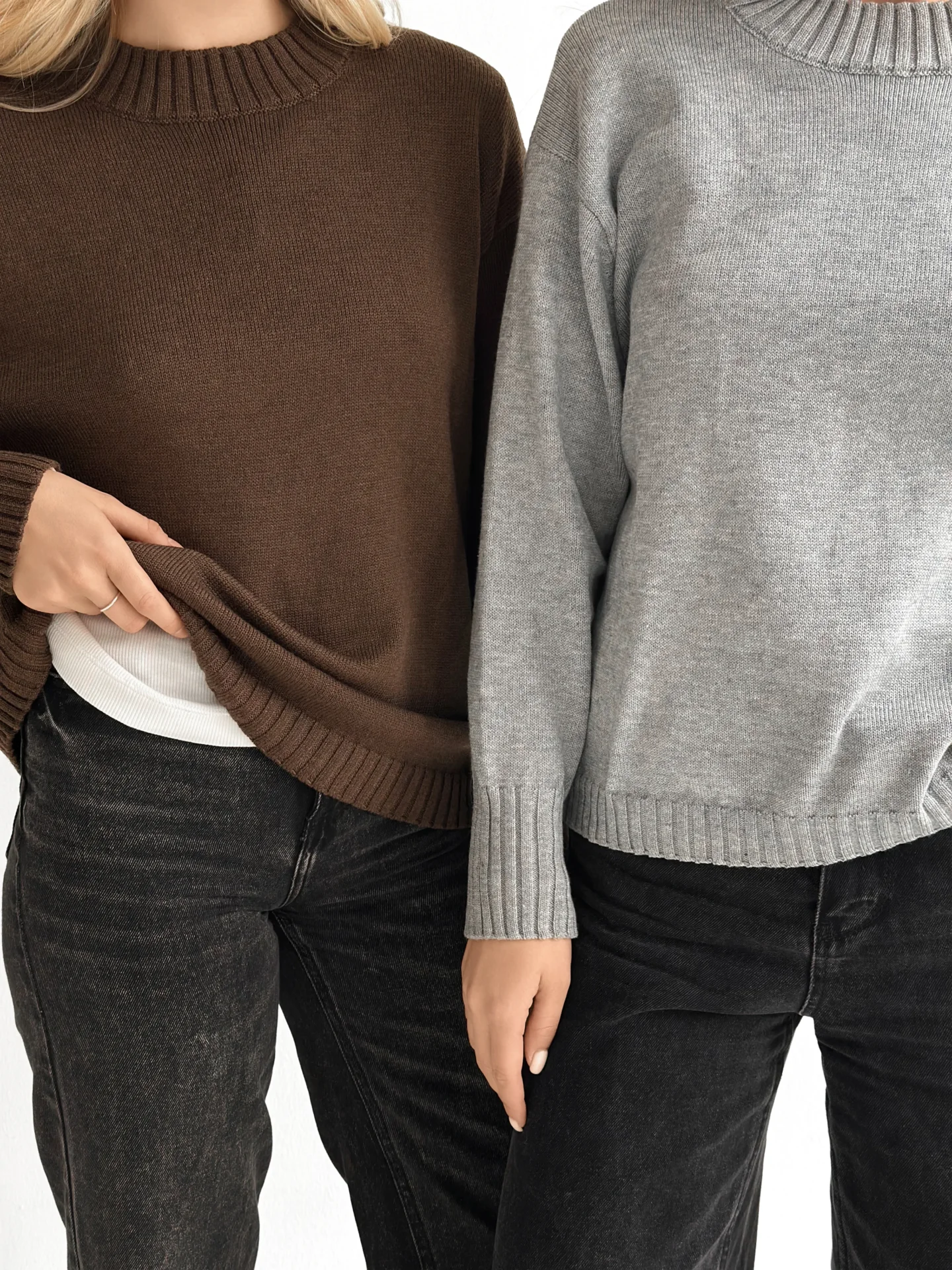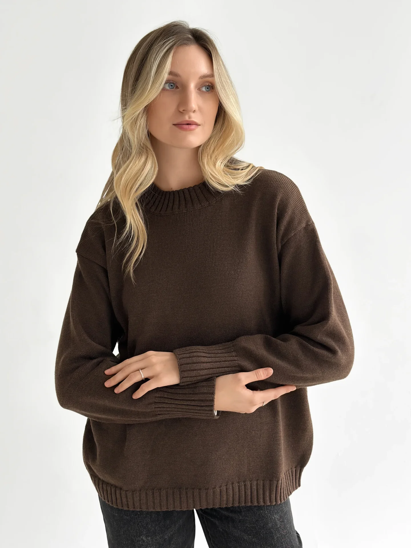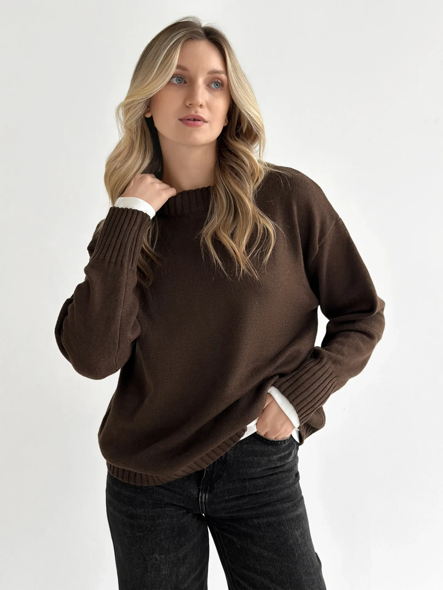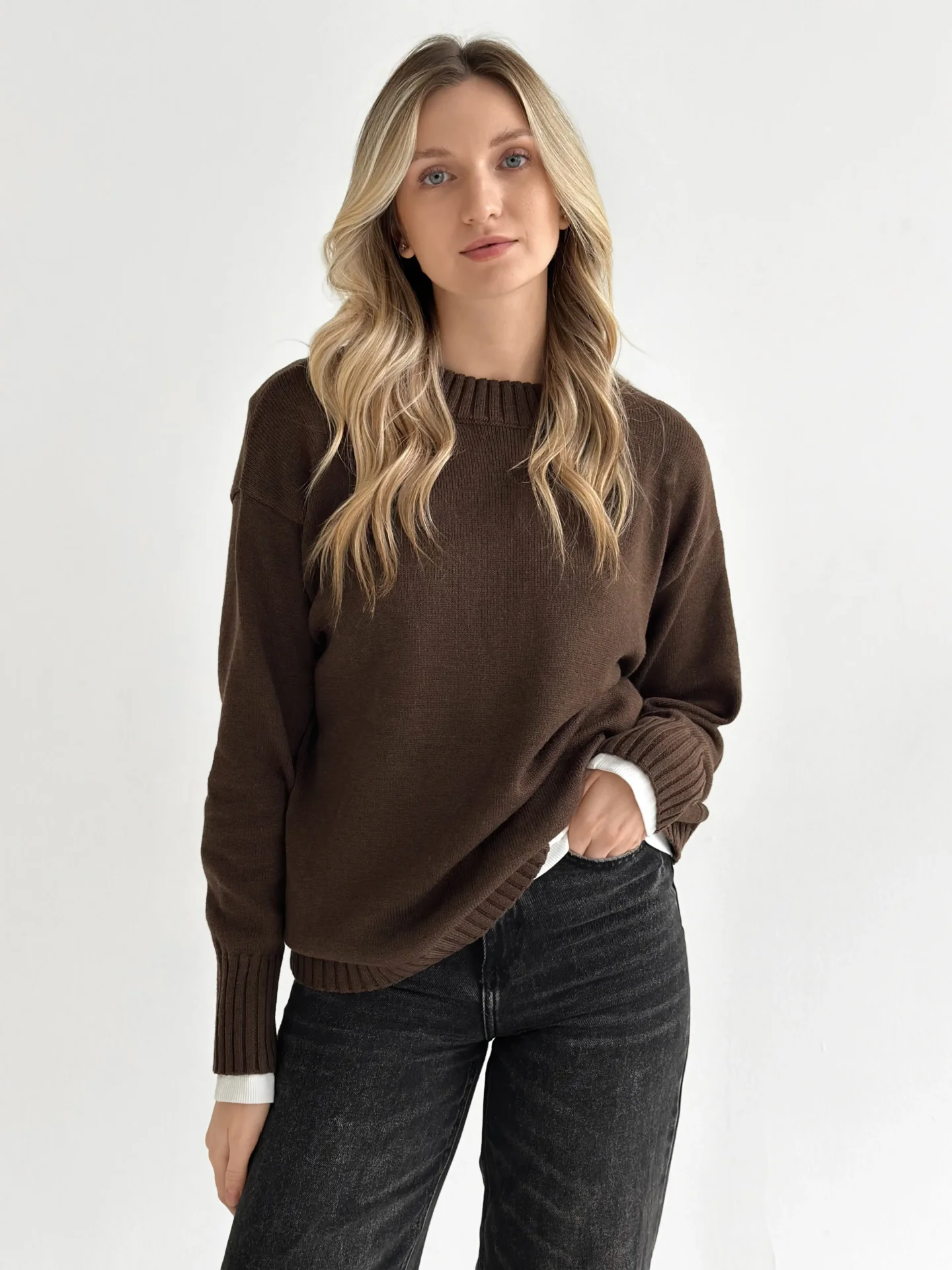 Sweter dziany stworzony dla ciepła i codziennego komfortu. Miękka przędza przyjemnie otula, a minimalistyczny design sprawia, że model jest uniwersalny do różnych stylizacji. Idealny wybór na przytulne dni i stylowe, codzienne looki.