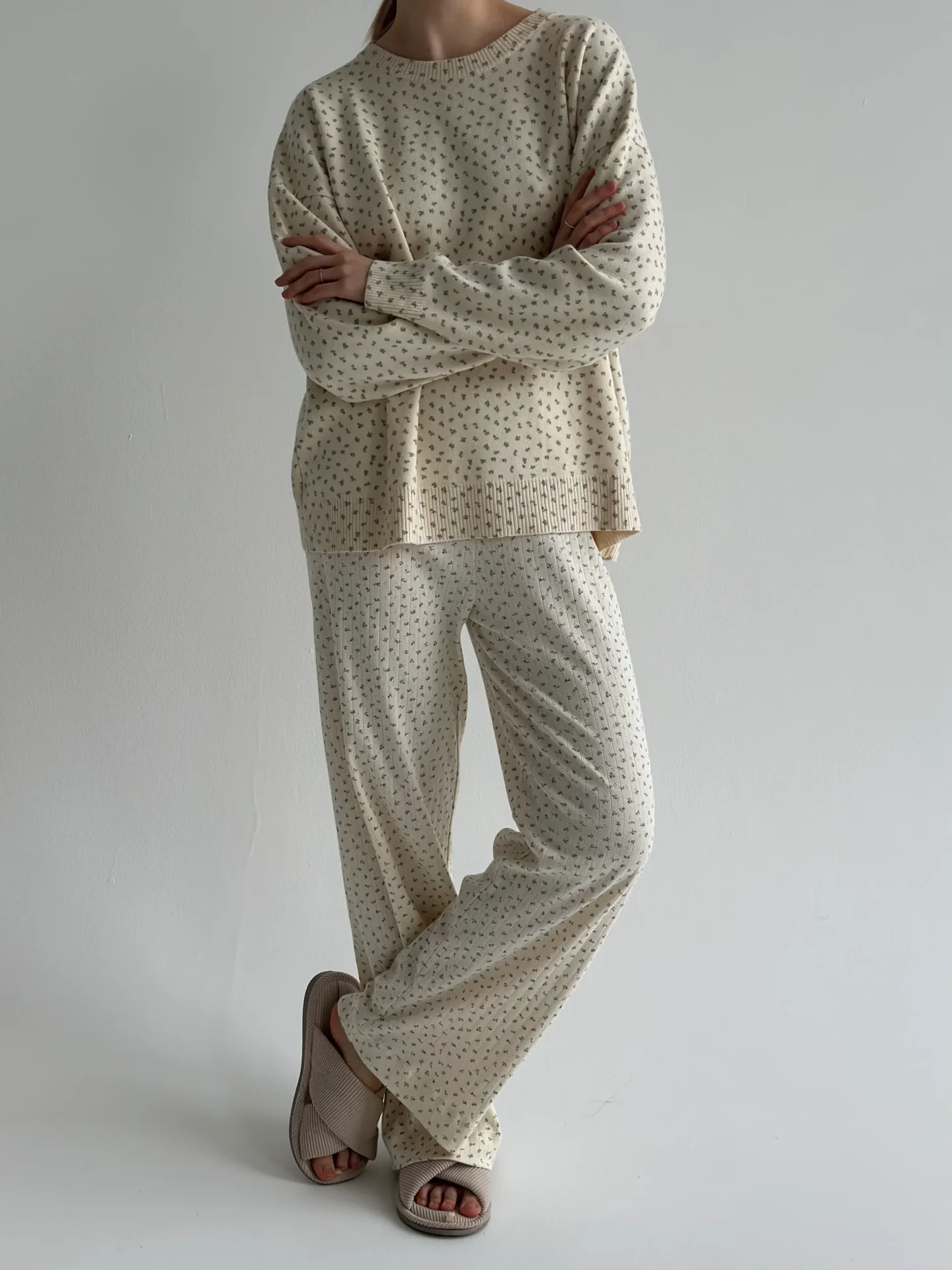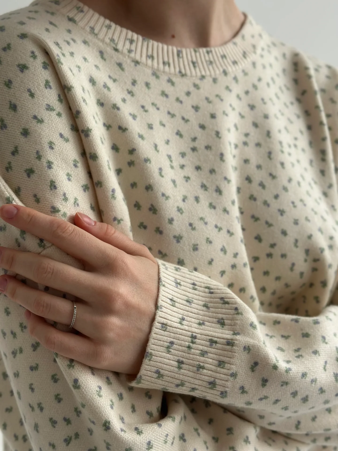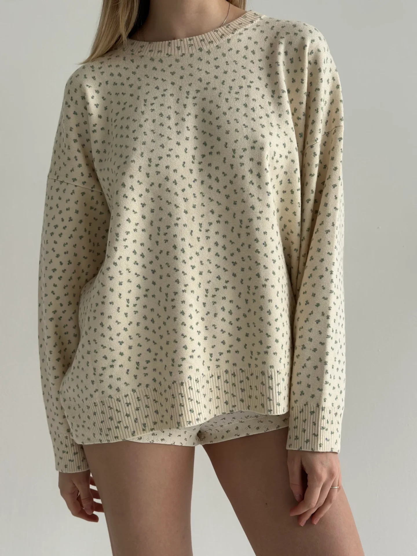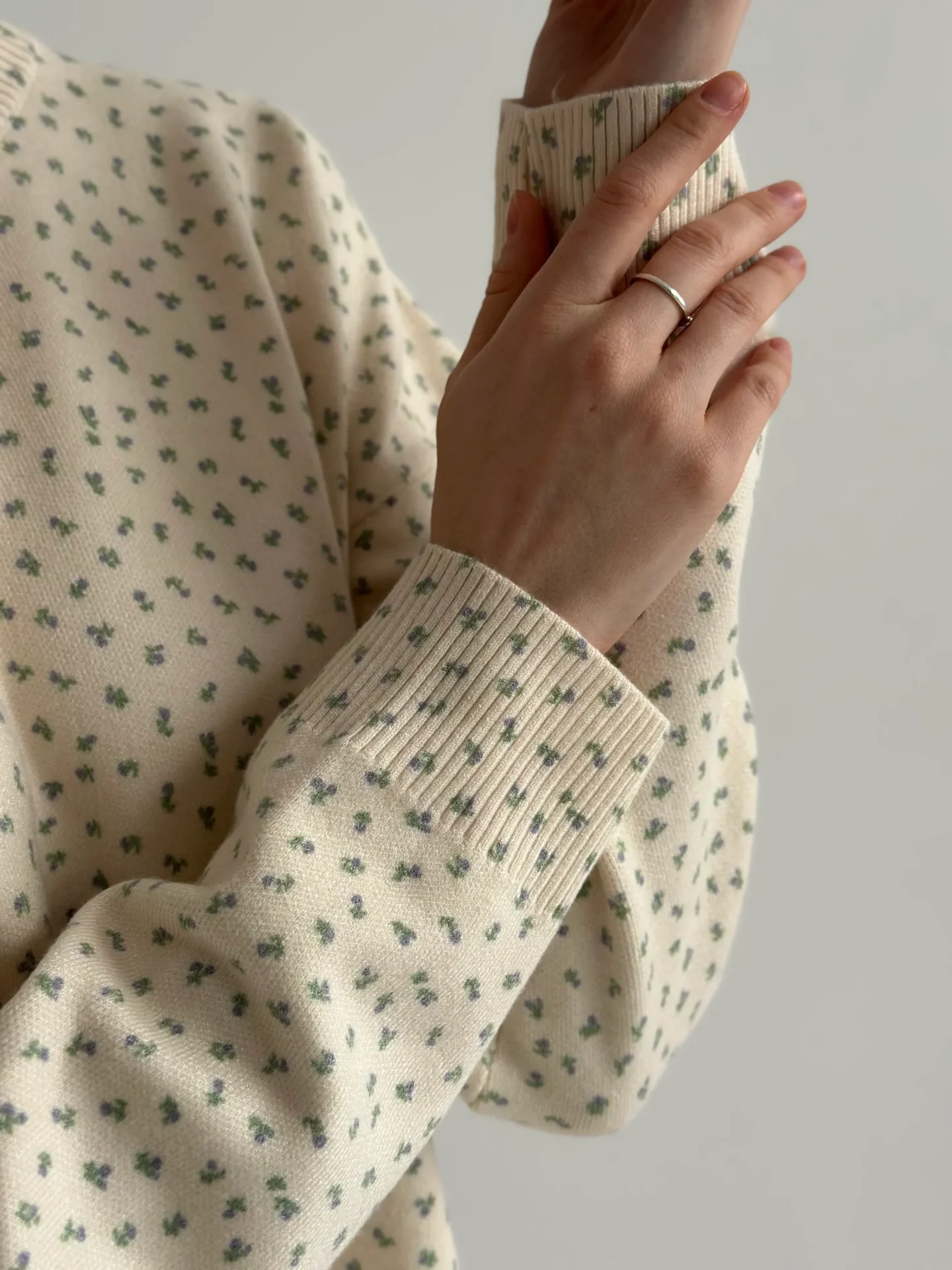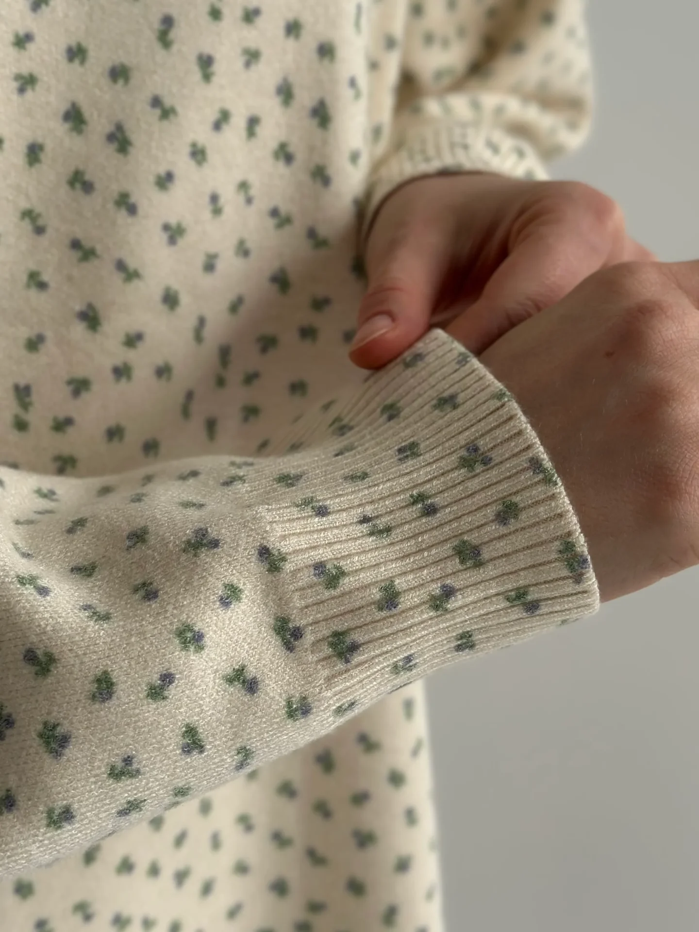 Sweter dziany, kremowy w niebieskie kwiatki