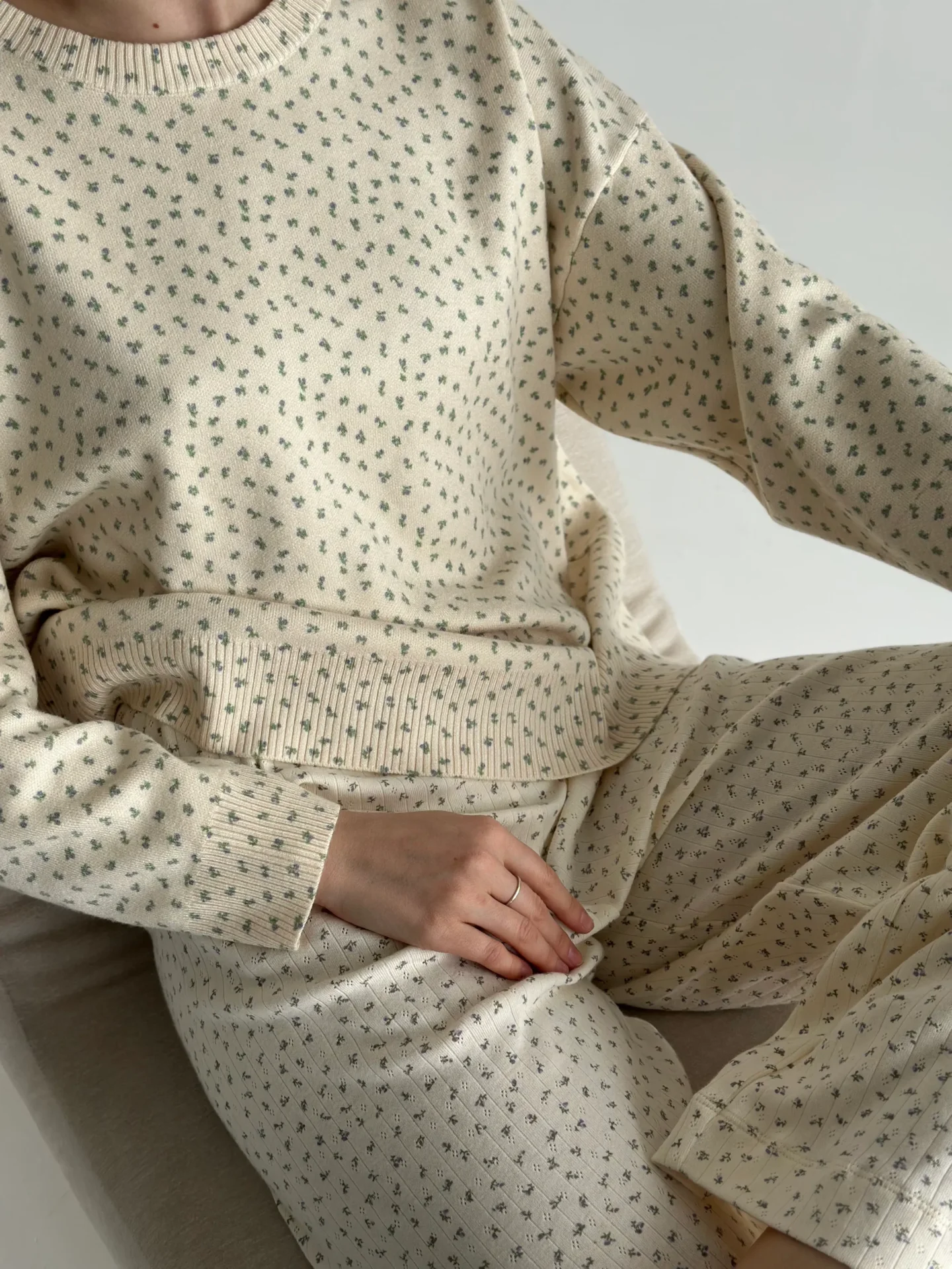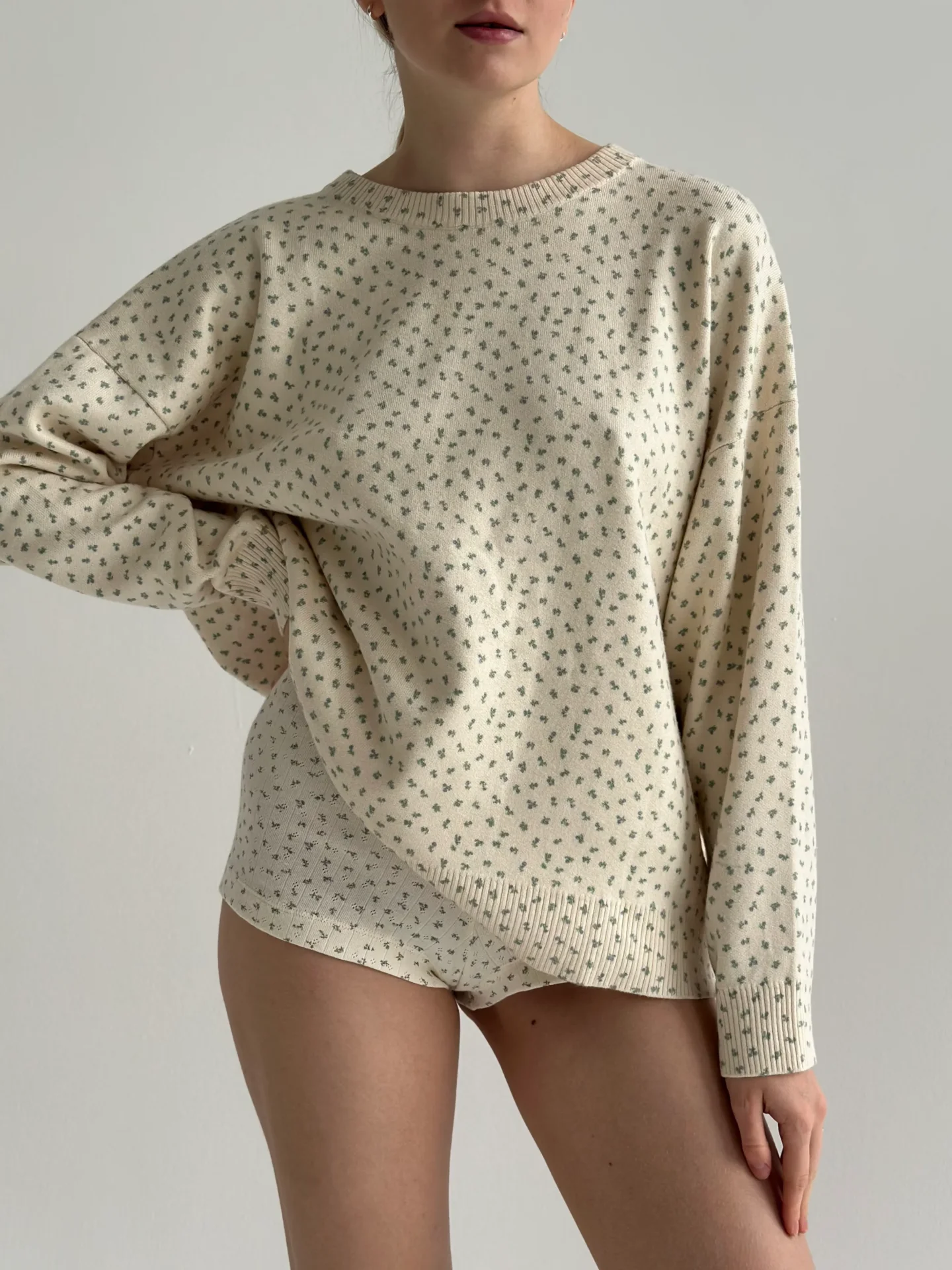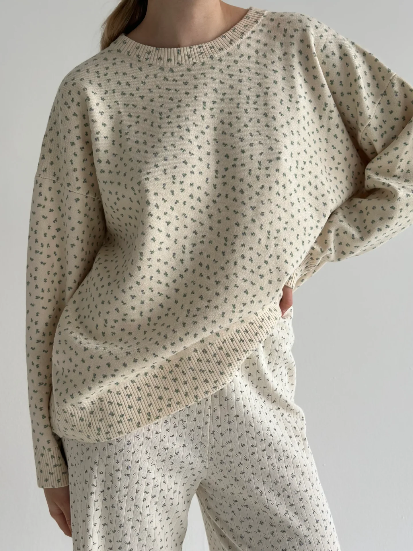 Sweter dziany, kremowy w niebieskie kwiatki - Miso