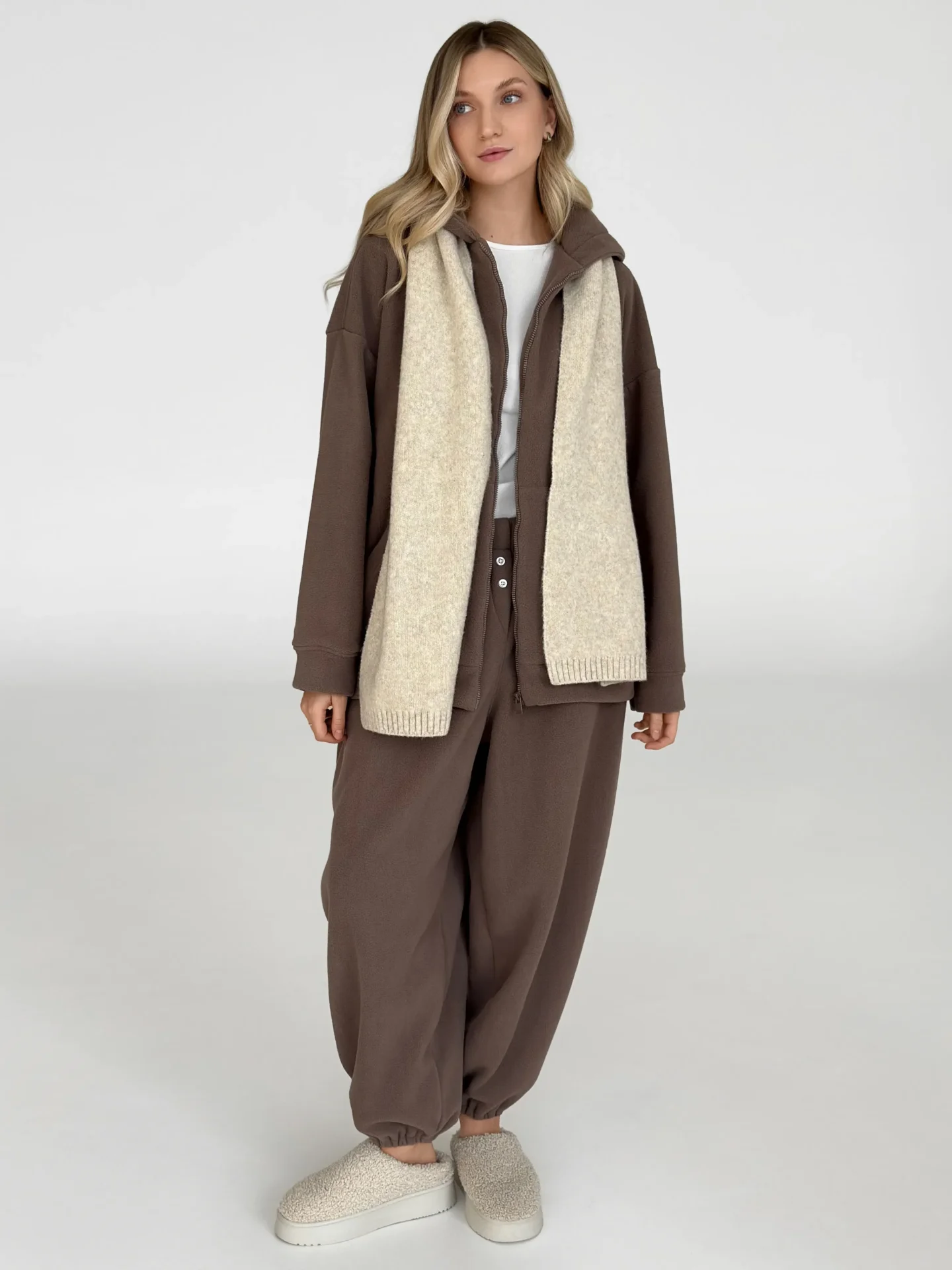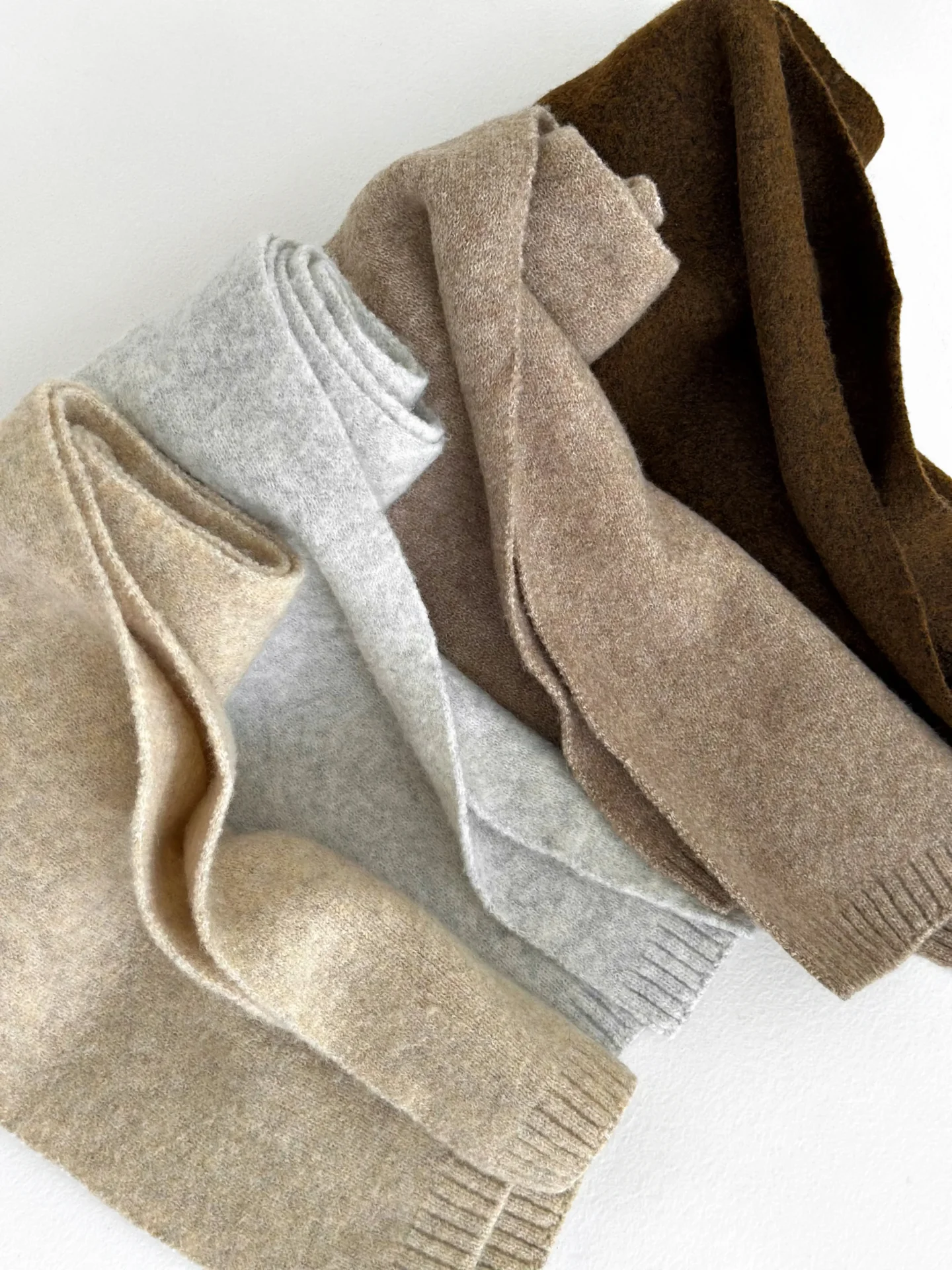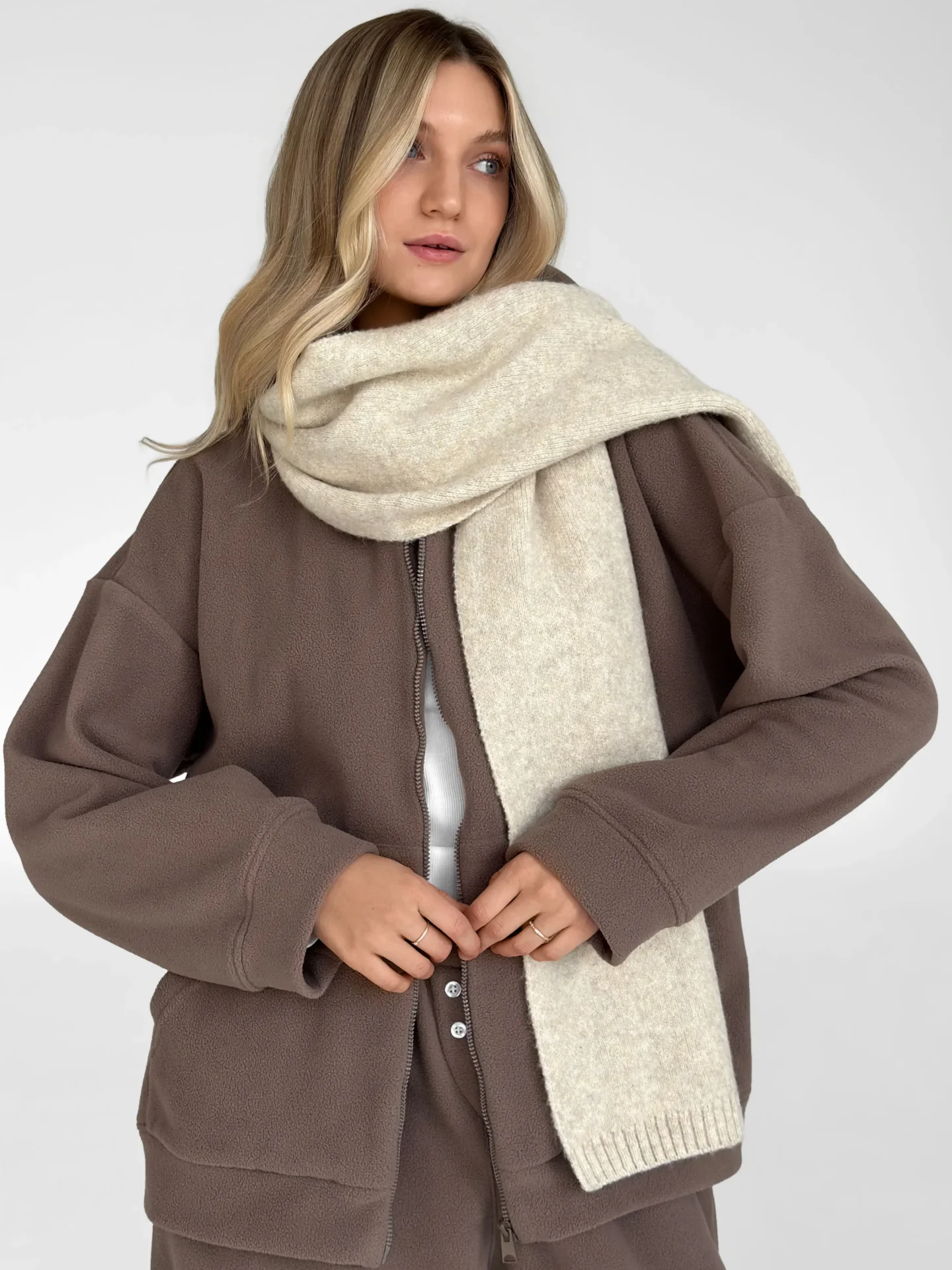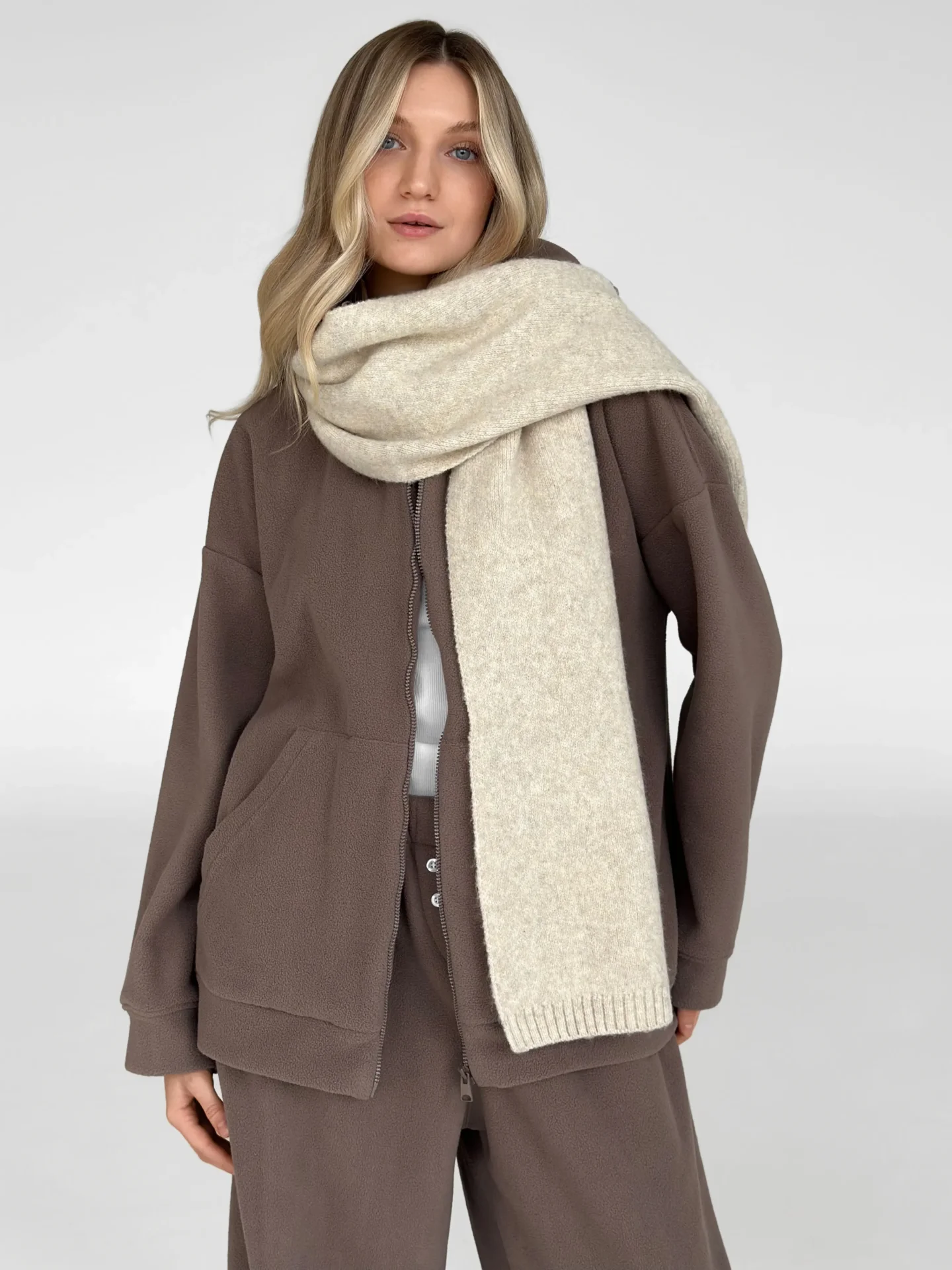 Szal wykonany z miękkiej, puszystej włóczki zapewnia uczucie ciepła i przytulności. Starannie wykonany splot i stonowane odcienie dodają elegancji każdej stylizacji. Idealny dodatek na zimowy sezon — doskonale pasuje do płaszcza, puchowej kurtki czy swetra.