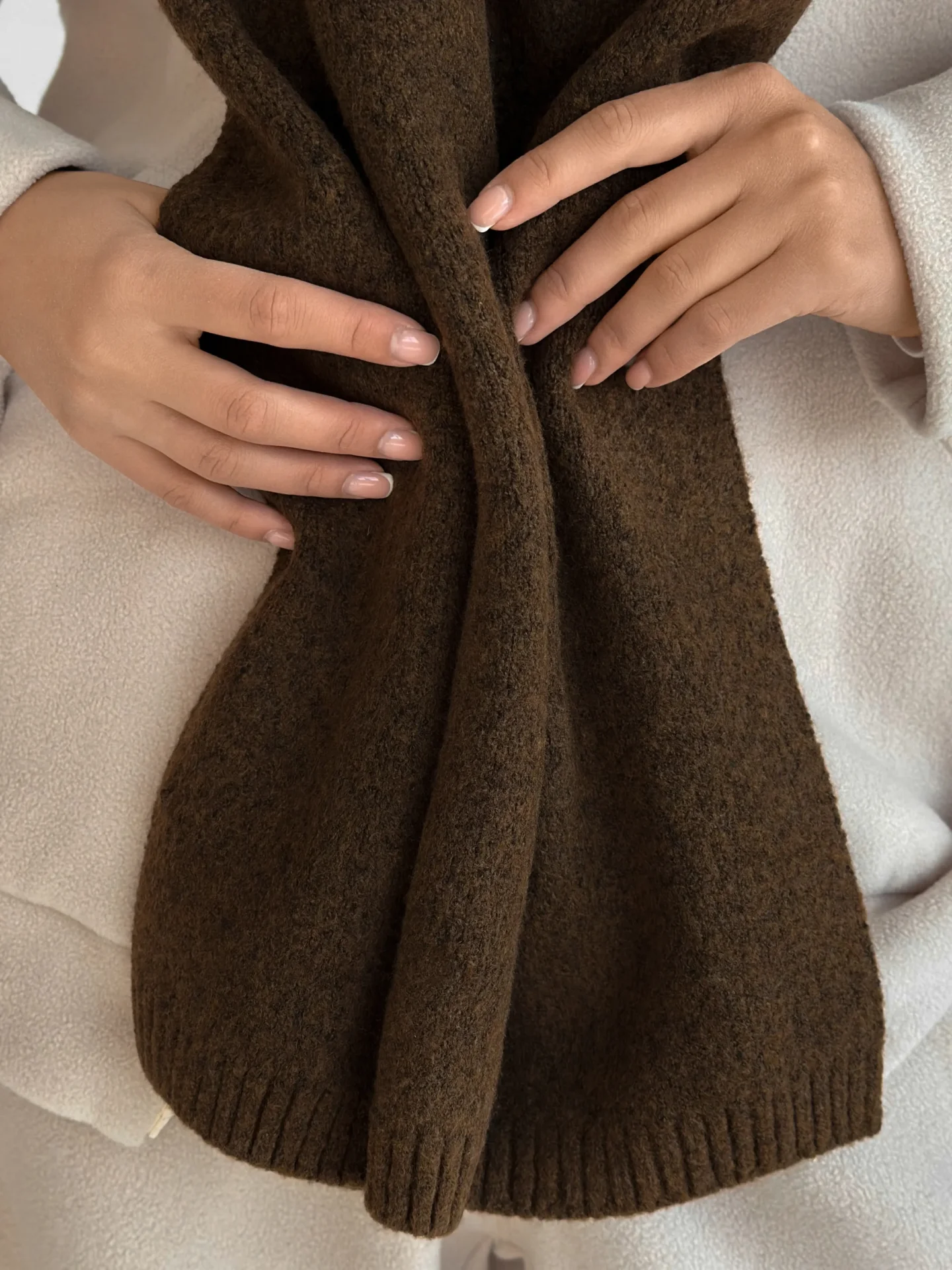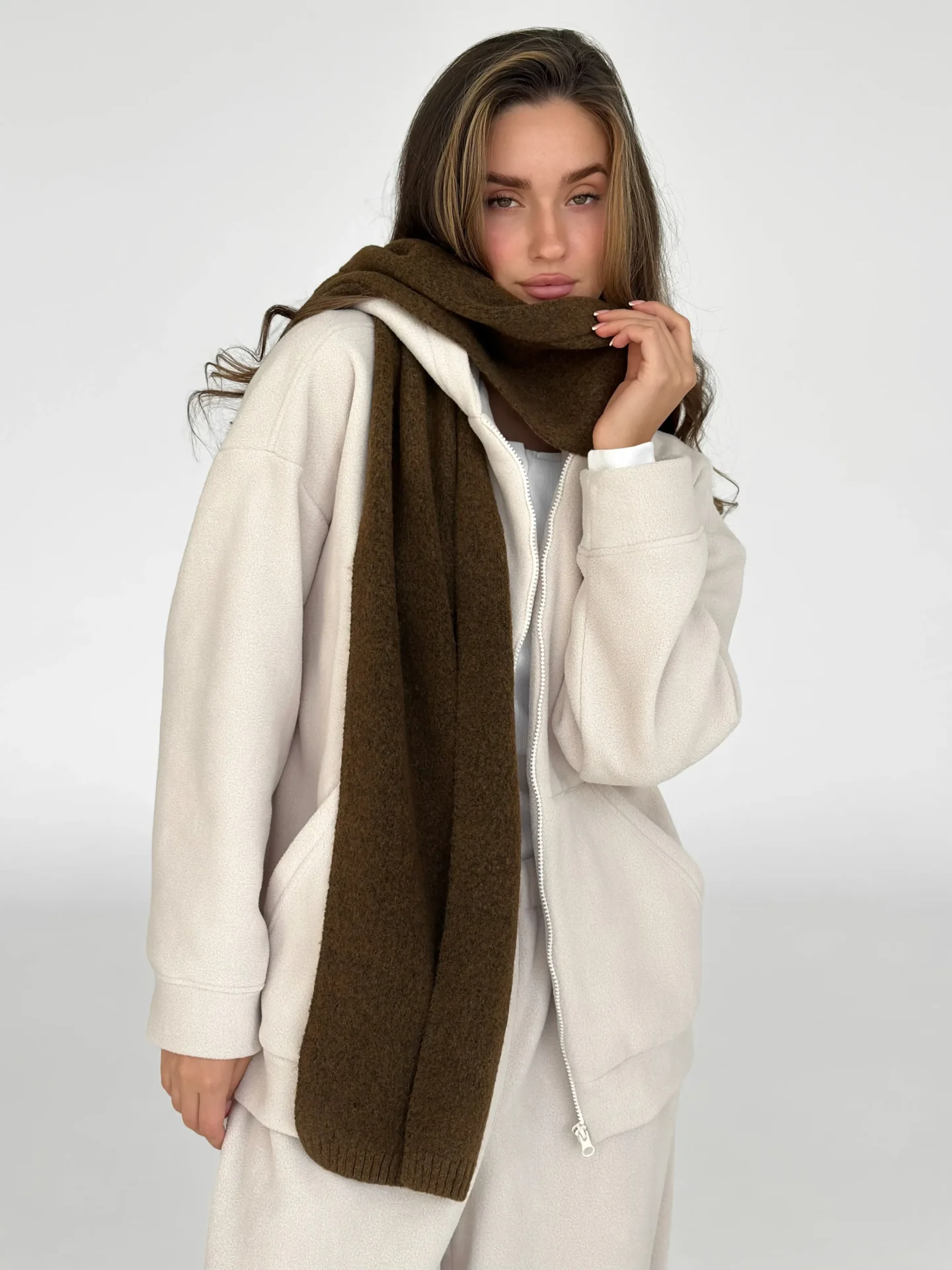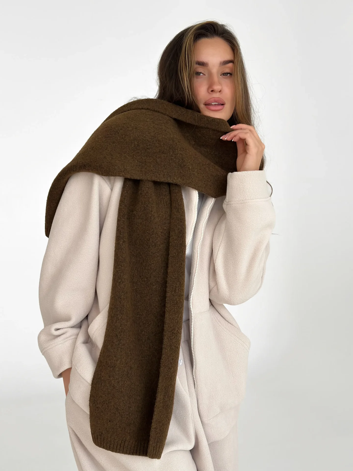 Szal wykonany z miękkiej, puszystej włóczki zapewnia uczucie ciepła i przytulności. Starannie wykonany splot i stonowane odcienie dodają elegancji każdej stylizacji. Idealny dodatek na zimowy sezon — doskonale pasuje do płaszcza, puchowej kurtki czy swetra.