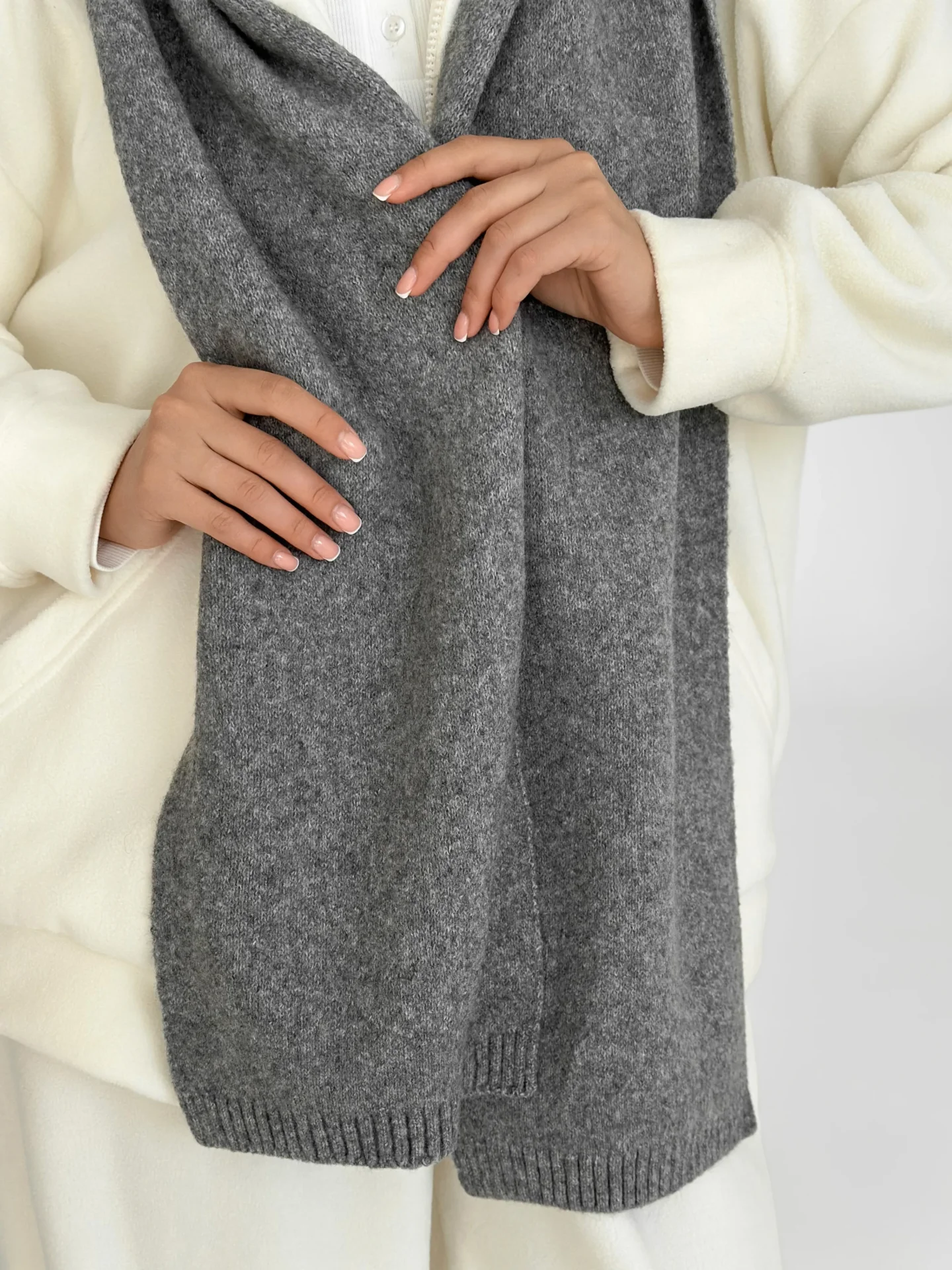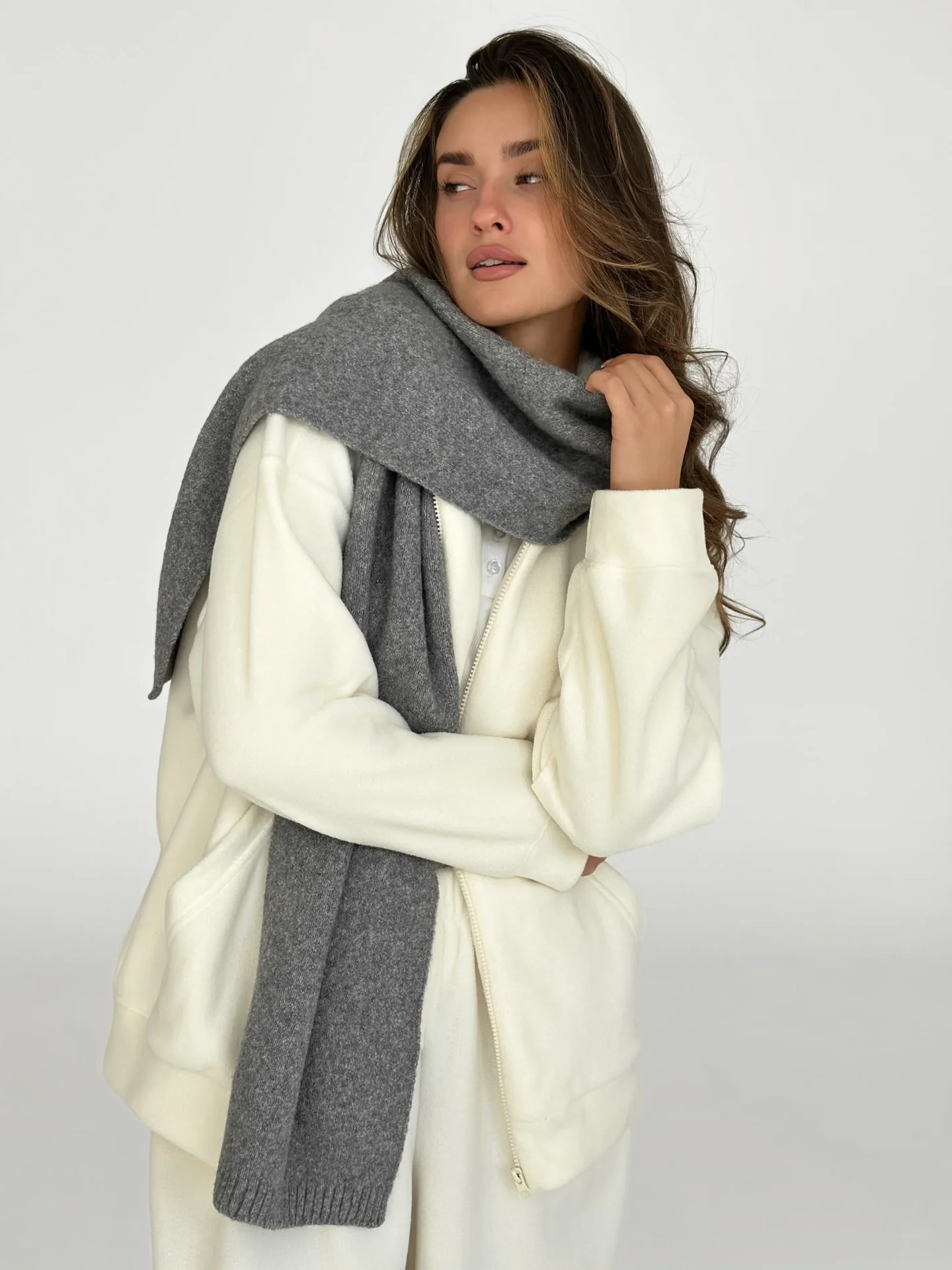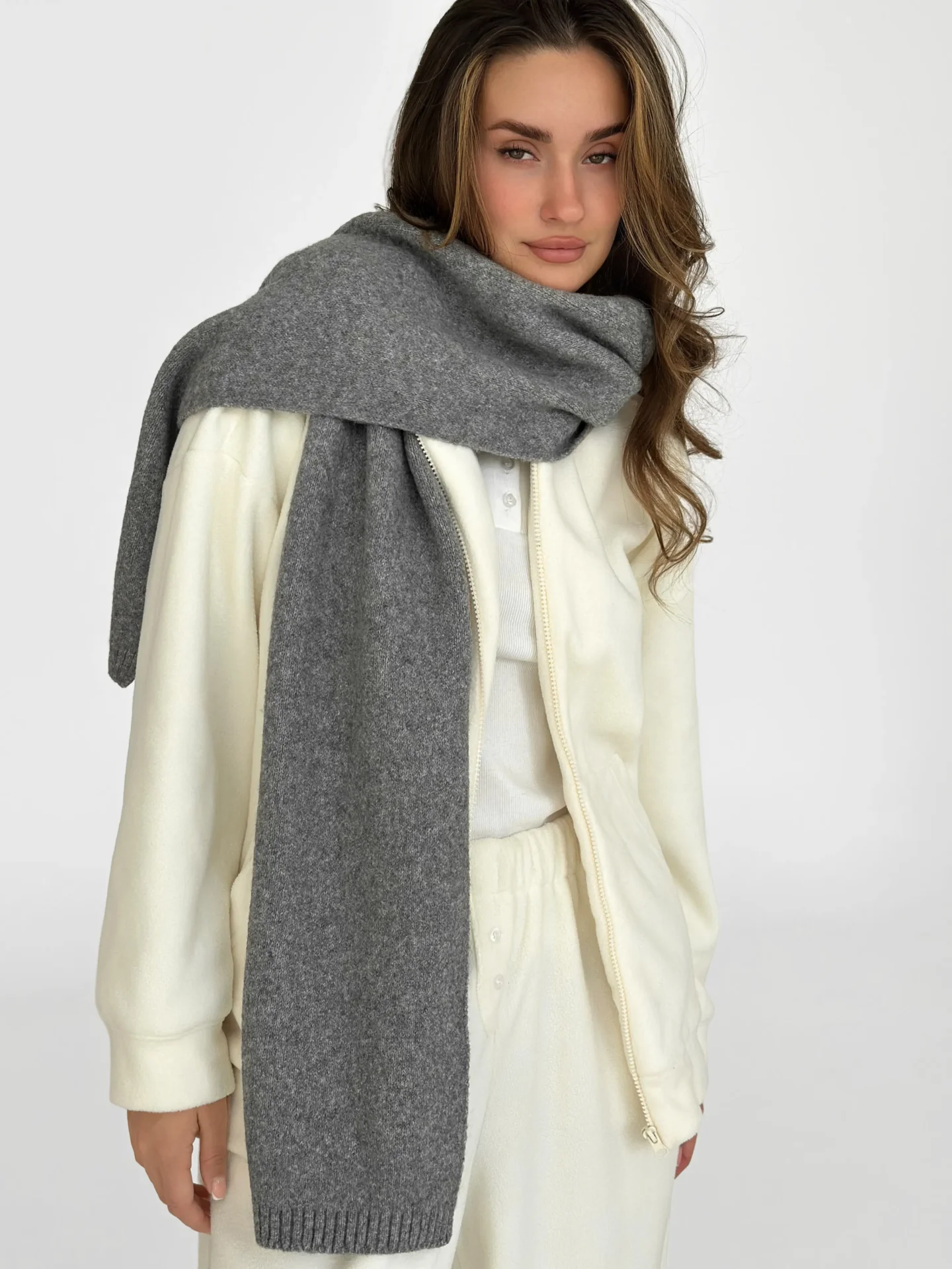 Szal wykonany z miękkiej, puszystej włóczki zapewnia uczucie ciepła i przytulności. Starannie wykonany splot i stonowane odcienie dodają elegancji każdej stylizacji. Idealny dodatek na zimowy sezon — doskonale pasuje do płaszcza, puchowej kurtki czy swetra.