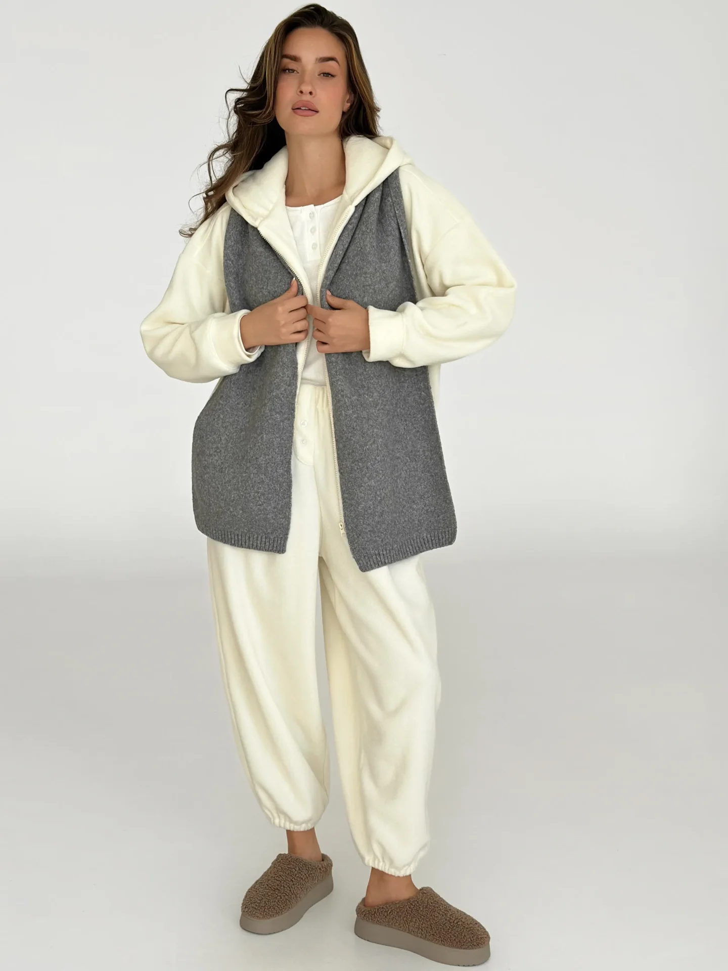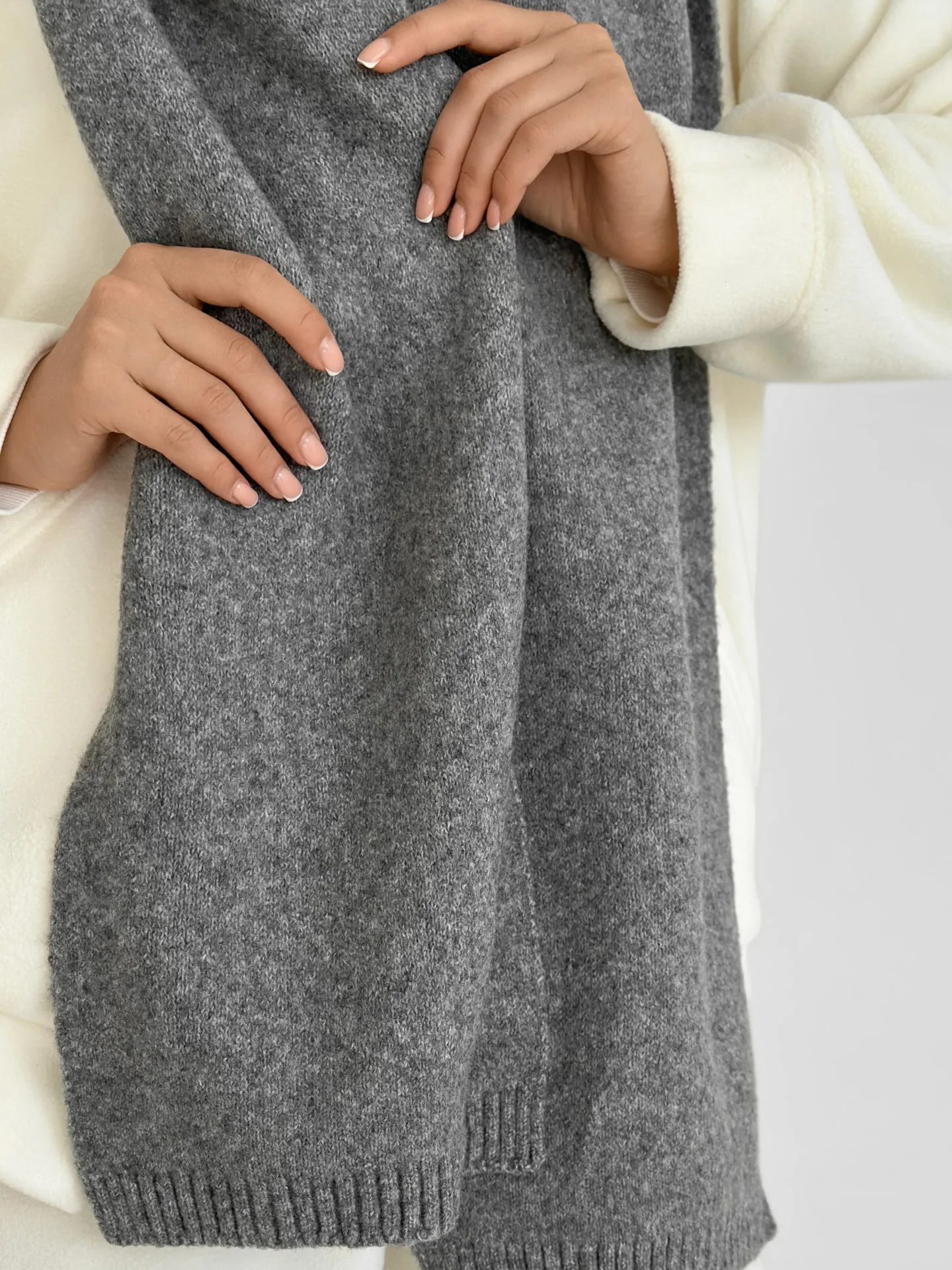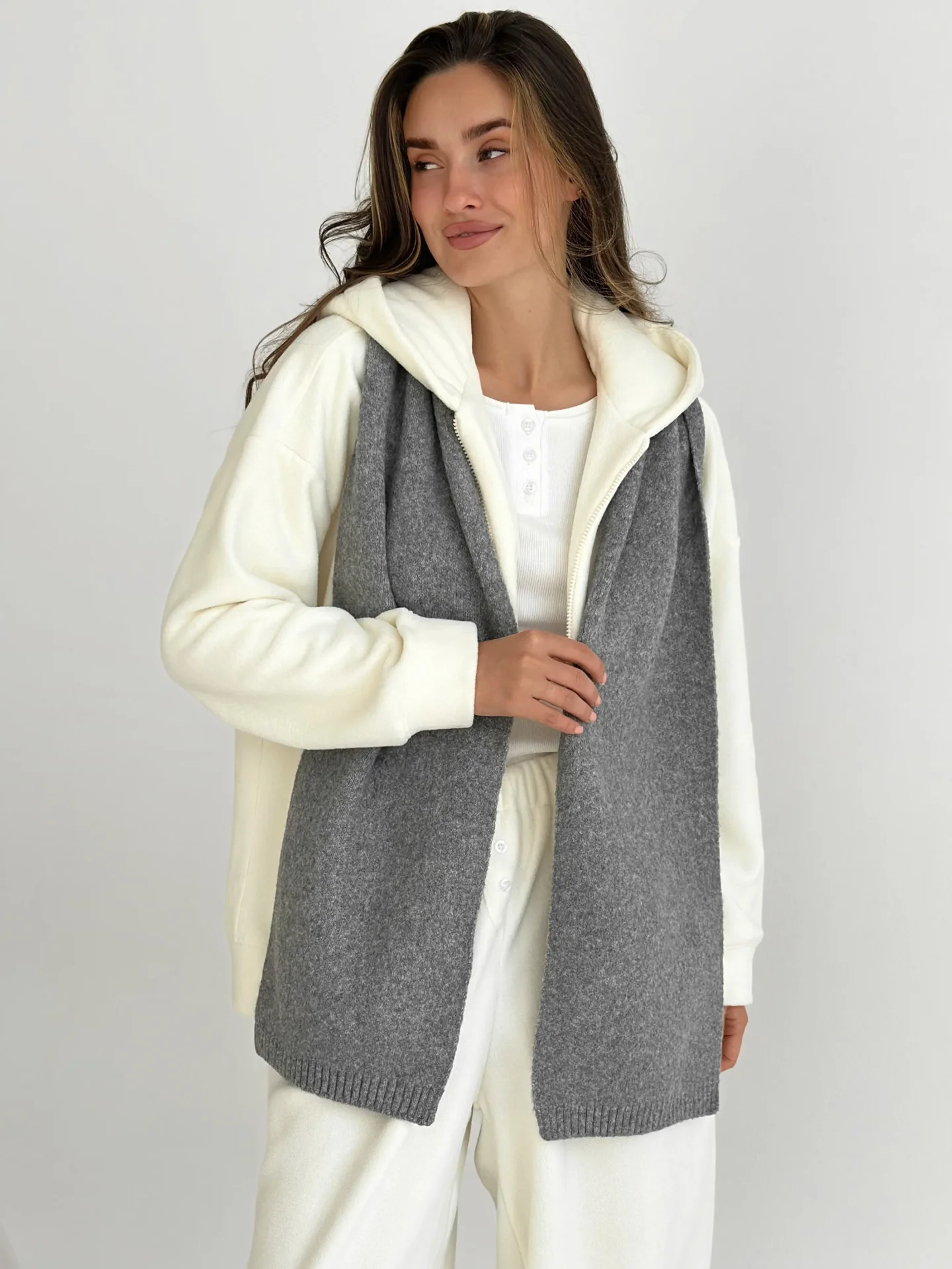 Szal wykonany z miękkiej, puszystej włóczki zapewnia uczucie ciepła i przytulności. Starannie wykonany splot i stonowane odcienie dodają elegancji każdej stylizacji. Idealny dodatek na zimowy sezon — doskonale pasuje do płaszcza, puchowej kurtki czy swetra.
