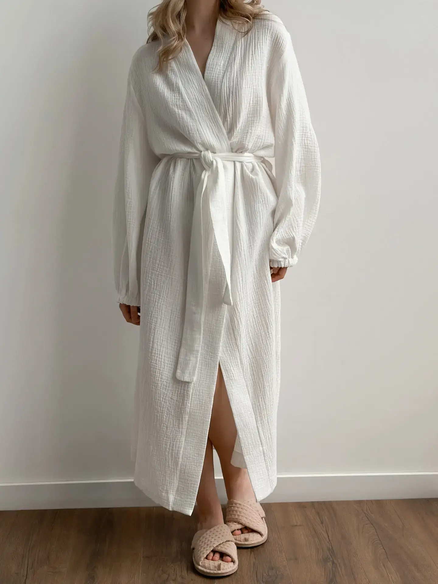 Długi szlafrok z muślinu zapewnia komfort i lekkość podczas codziennego noszenia. Naturalna, oddychająca tkanina jest przyjemna dla ciała i daje poczucie wygody. Prosty, stonowany fason sprawdzi się w domu, podczas wypoczynku lub letnich wyjazdów.
