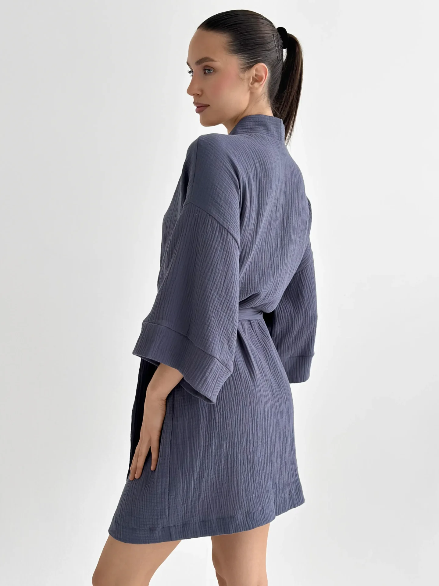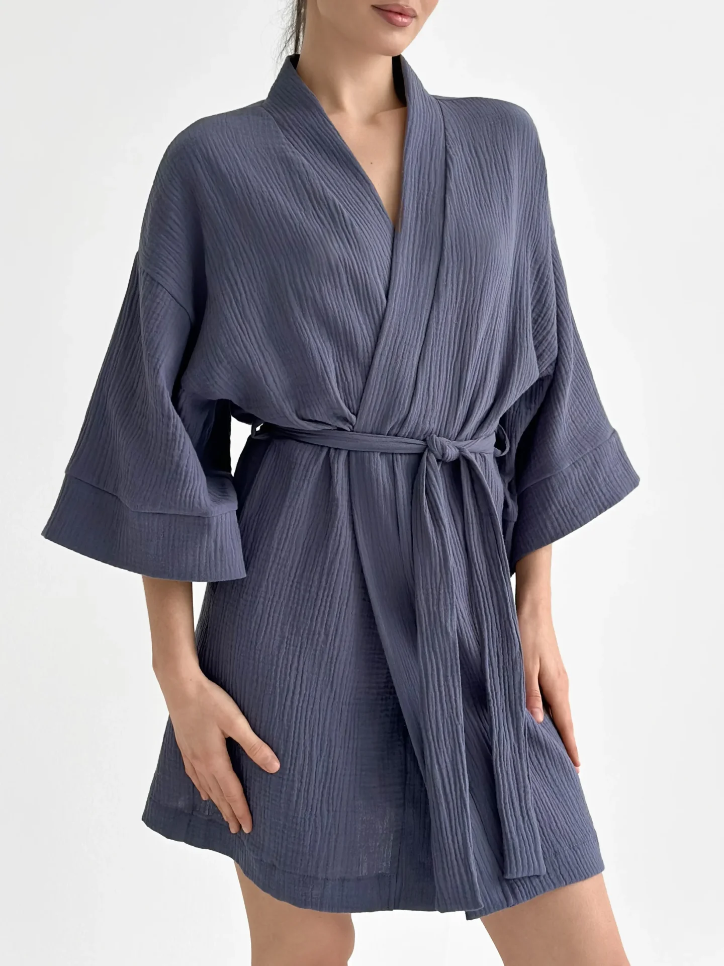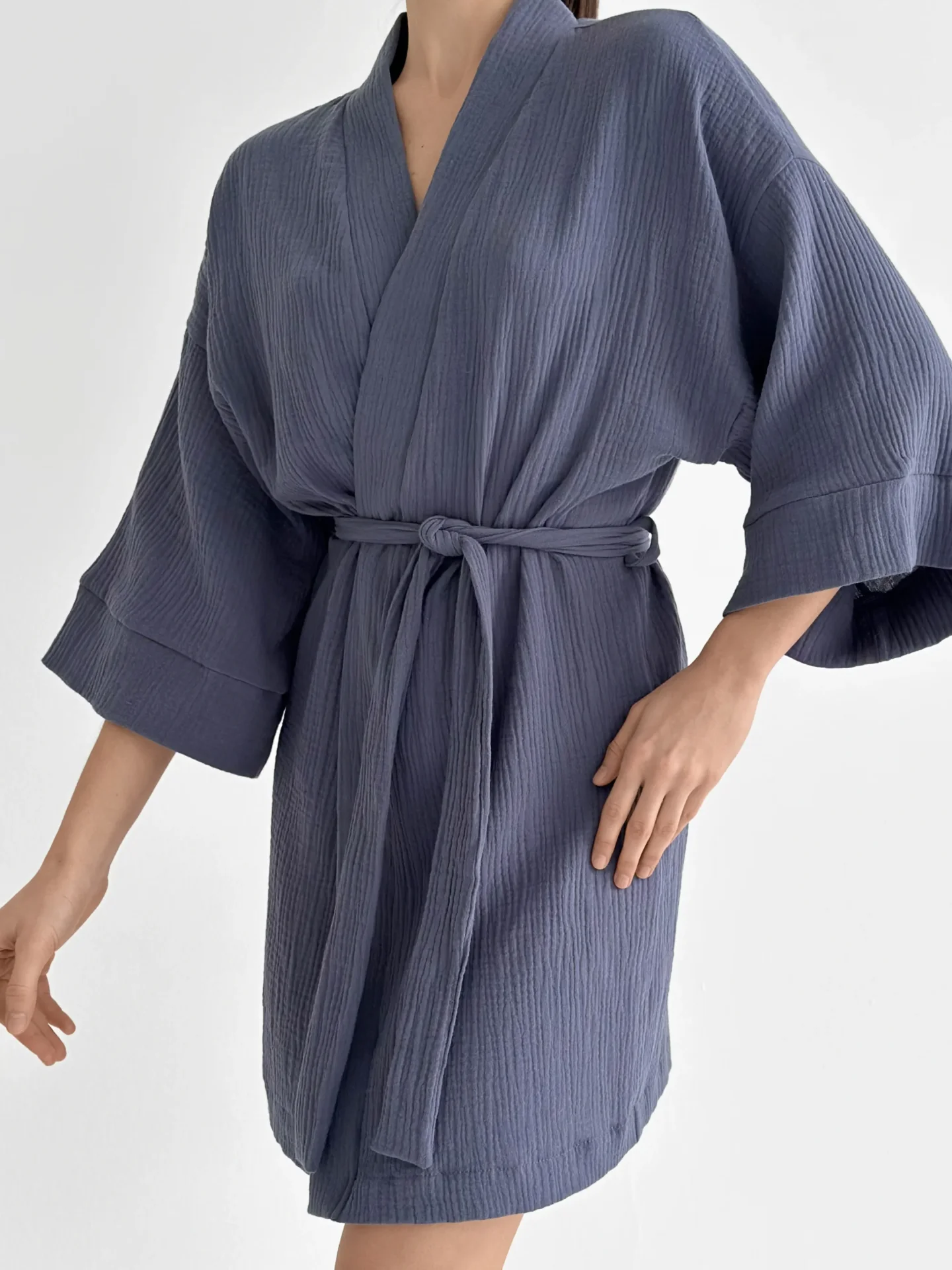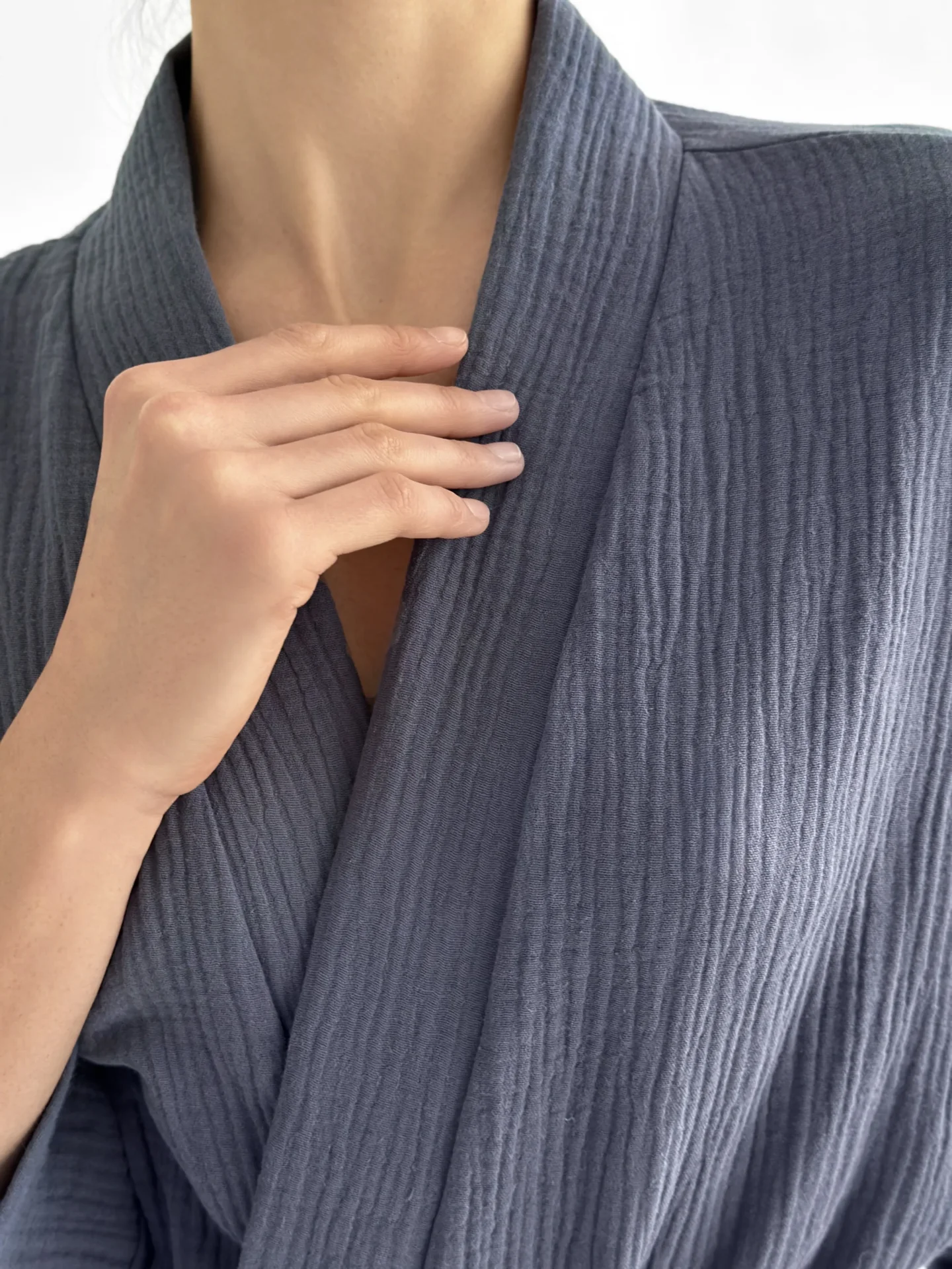 Szlafrok kimono z muślinu stworzony z myślą o lekkości i komforcie noszenia. Naturalny materiał jest przyjemny w dotyku i dobrze przepuszcza powietrze, dzięki czemu idealnie nadaje się do domu i na wypoczynek. Luźny krój zapewnia swobodę ruchów i swobodny styl.